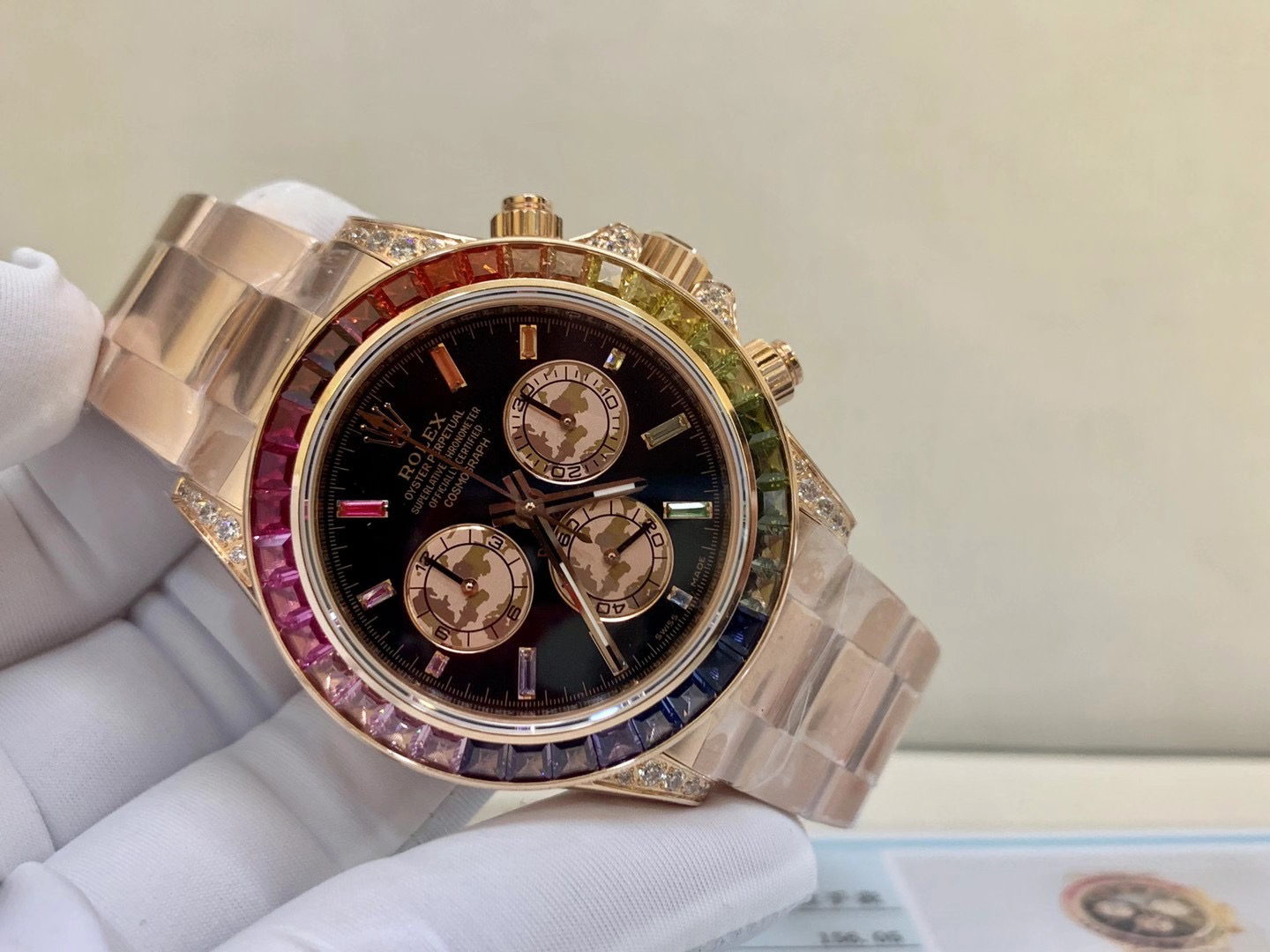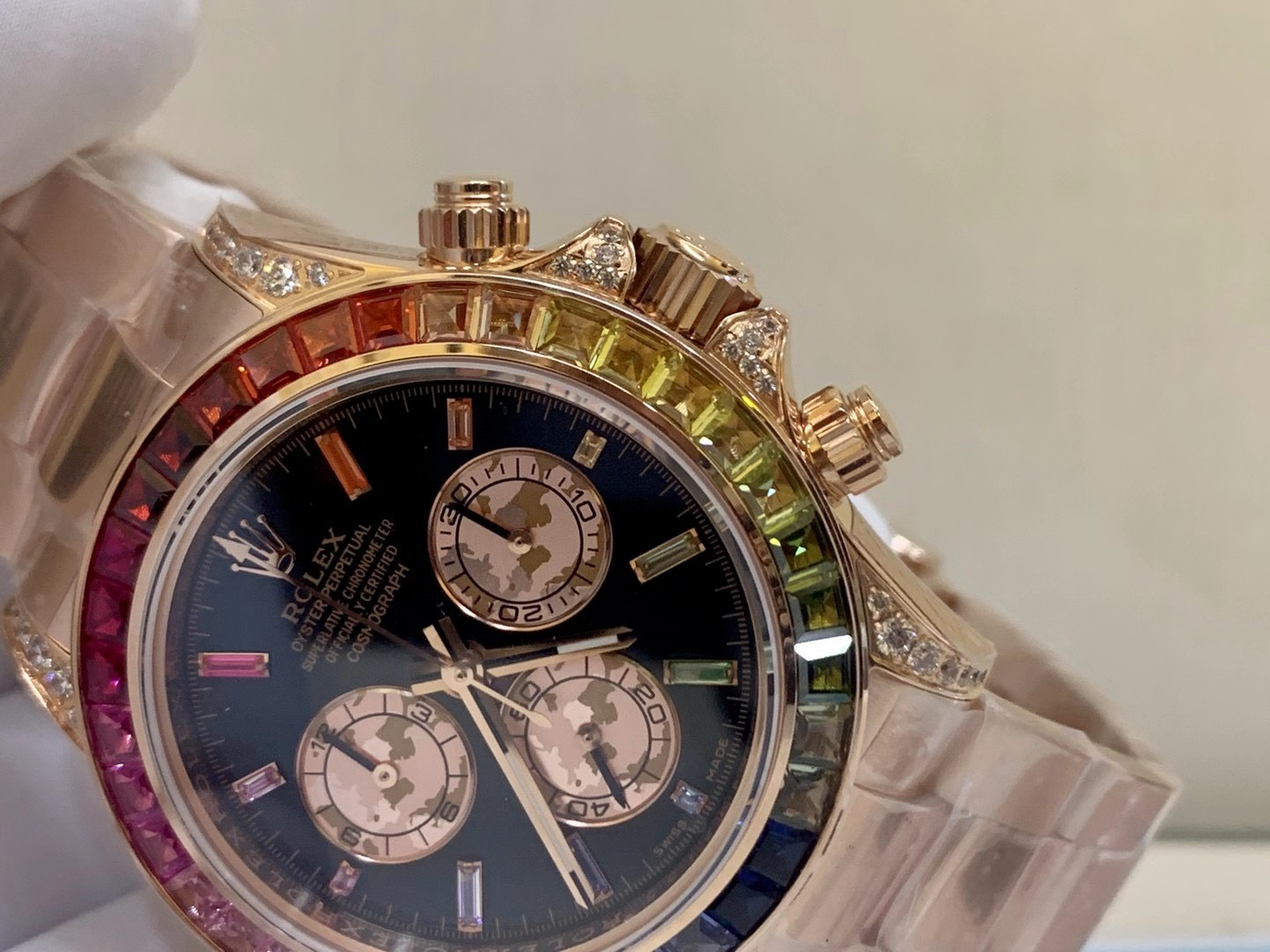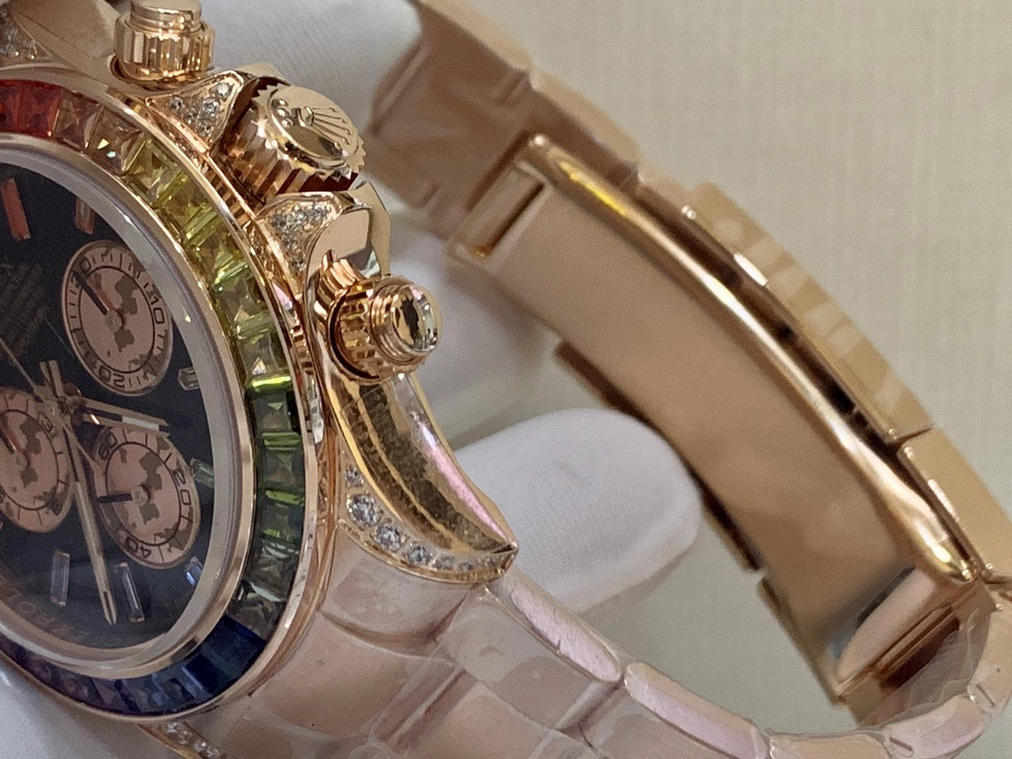 客订 彩红迪 N厂4130改造宝石 金粉三圈 宝石字面 18K玫瑰金厚金打造 小贵 细节分享官方200w起,彩虹圈的难度在于宝石的摘採还有颜色搭配,颜色接替不均就很难达到链接的效果,所以官方放弃了再次生产!我们研发加班加点才能研发出来宝石圈,可谓功夫不负有心人,恢复了官方的效果,巧妙的设计能让珠宝融入腕表里面,图片分享效果难以以实物攀比,实物效果更佳!!!完美实拍出货[色][色]