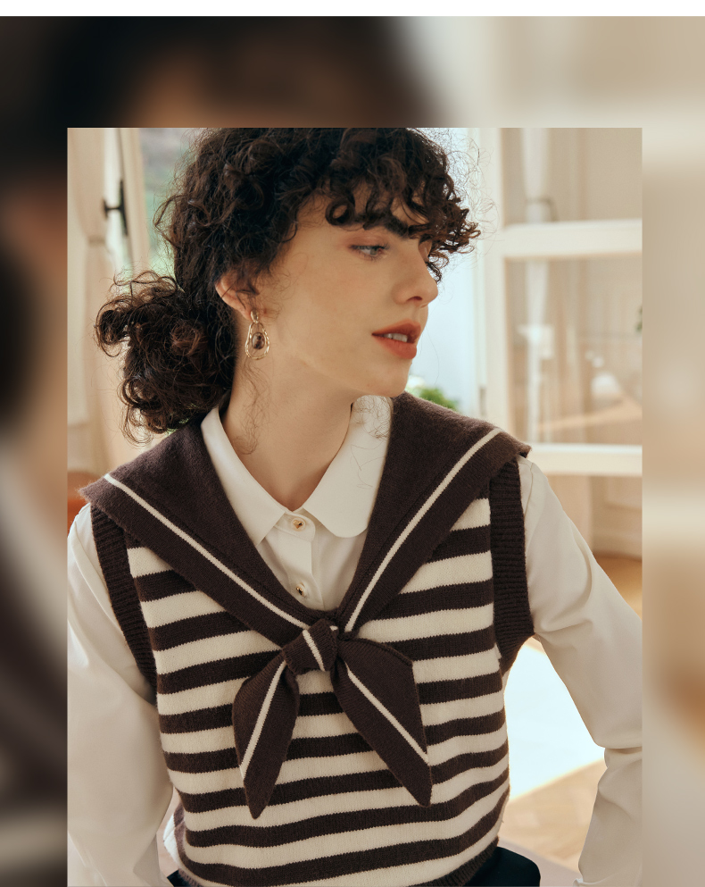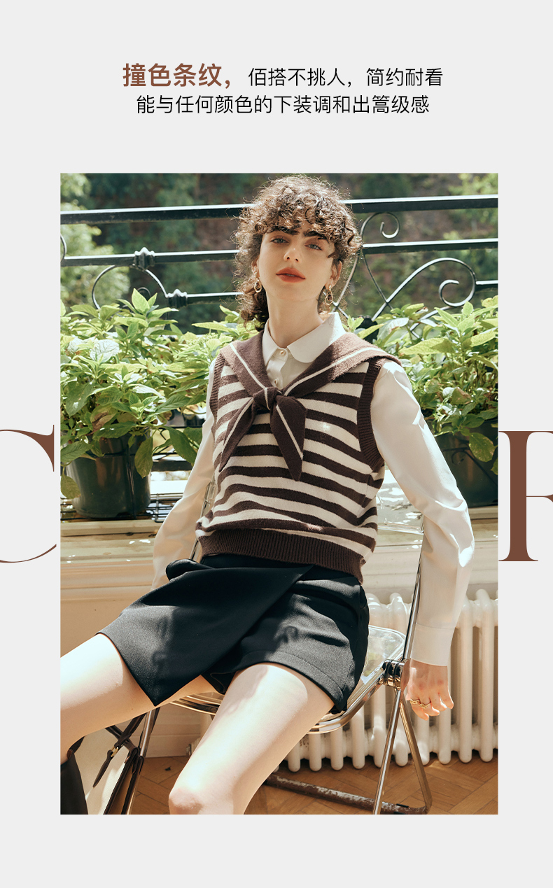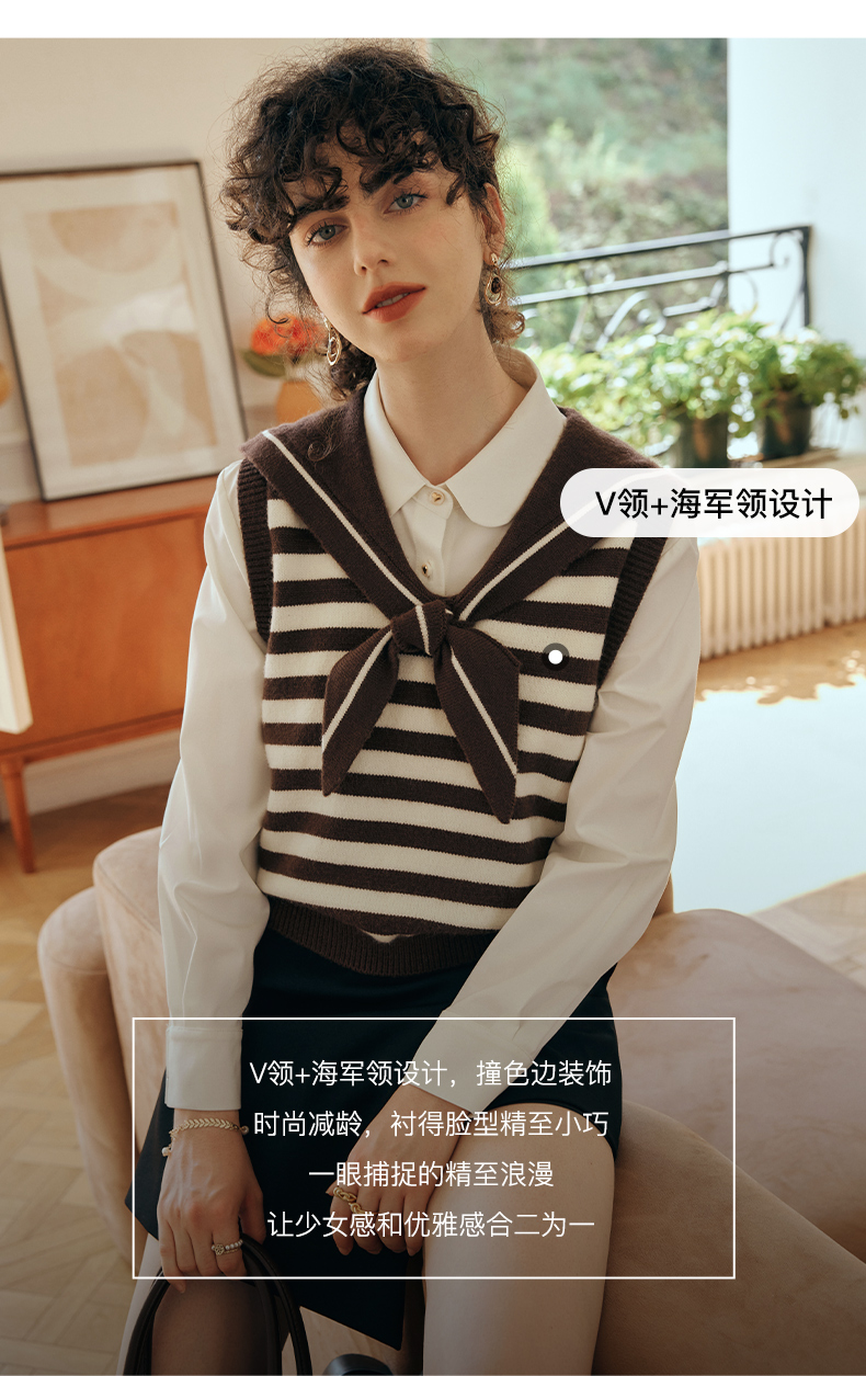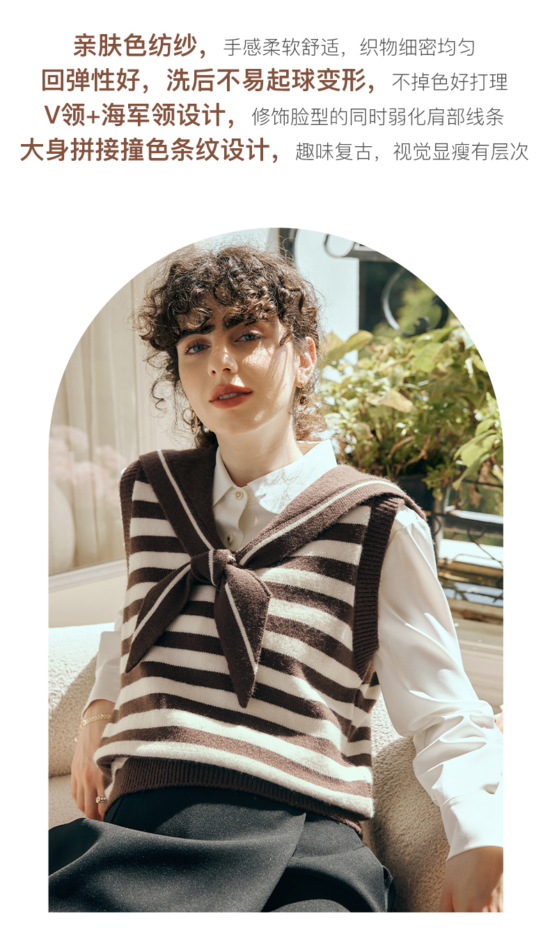 OLrain欧芮儿条纹针织背心女初秋2023新款复古美式海军领内搭马甲