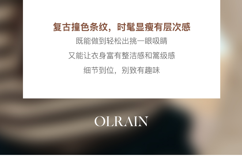 “精致”是欧芮儿olrain品牌文化的核心,欧芮儿认为,精致的女人,不但要外在动人,更要内在迷人,内外兼修,有魅力、有气质、有内涵,自信而不自傲,优雅而不矫揉,自有万种风情而不轻浮,更不故作矜持。