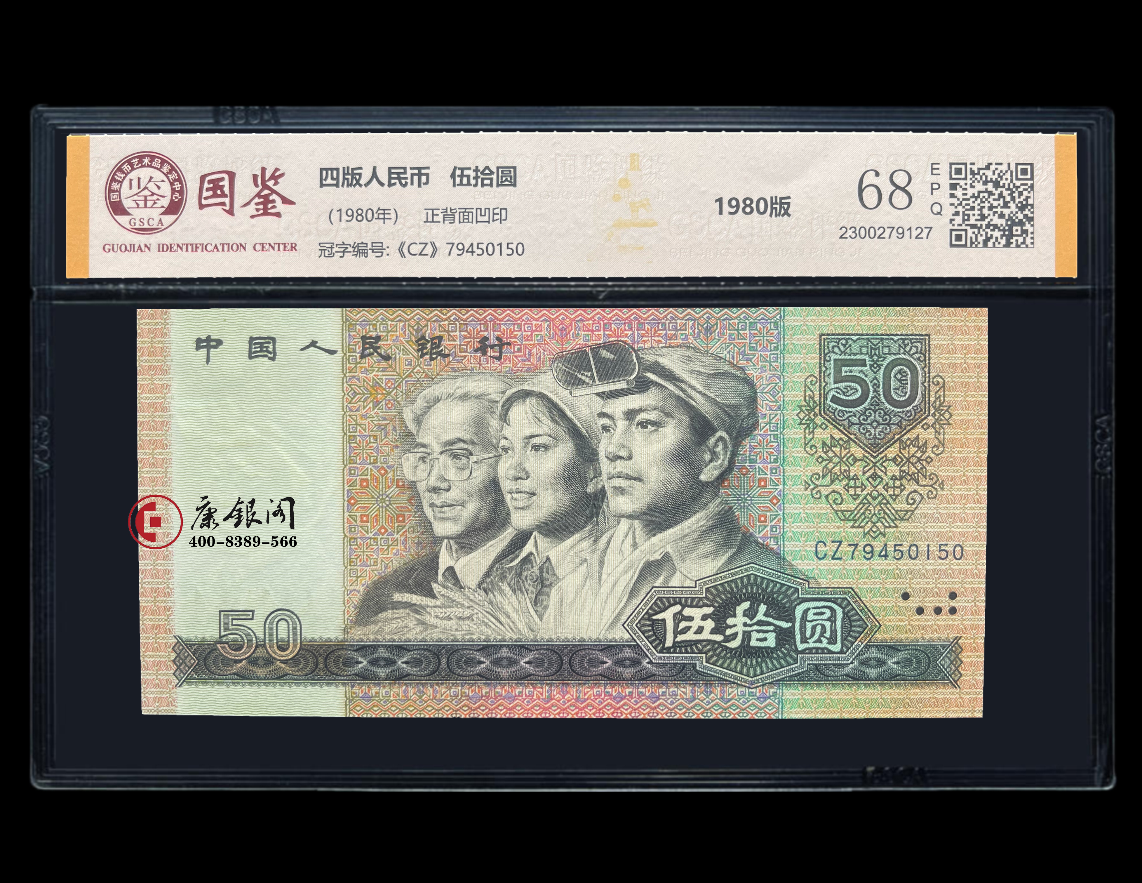①80版50元——四版币钞王收藏界的“软黄金”。8050流通时间短,发行数量少,流通耗损率较高,银行回收销毁大部,市面几无可见,存世量与枣红一角相当,现在全新单张的价格就在3000以上。