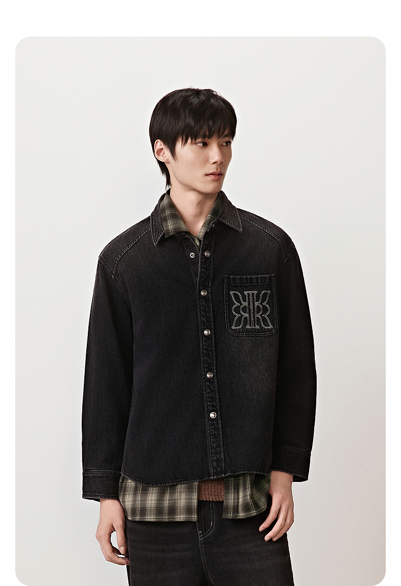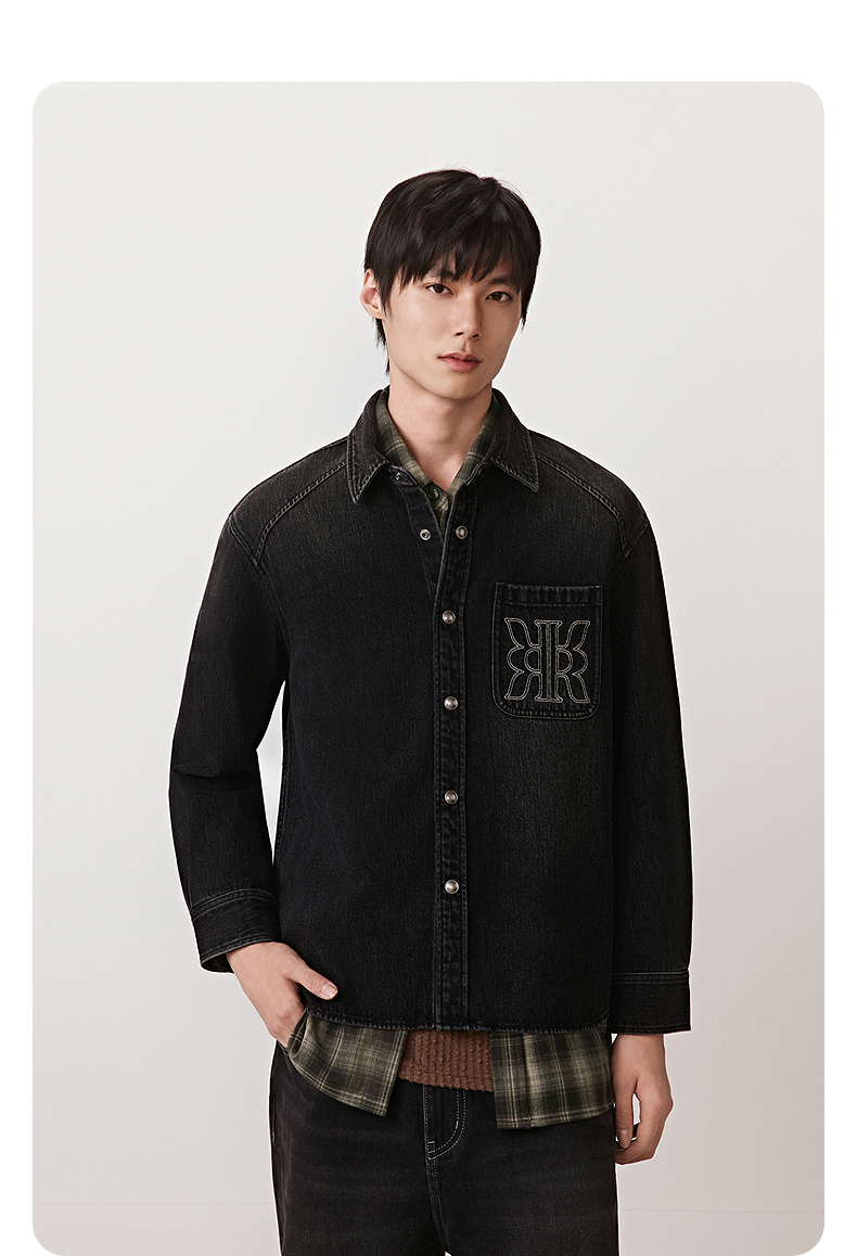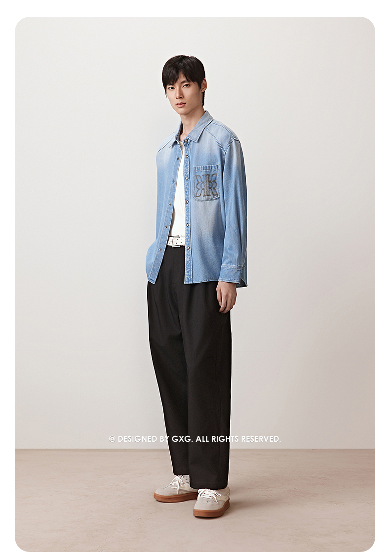 GXG男装 撞色绣花牛仔衬衫通勤男休闲外套长袖上衣 2025秋季