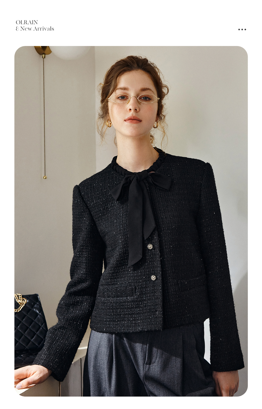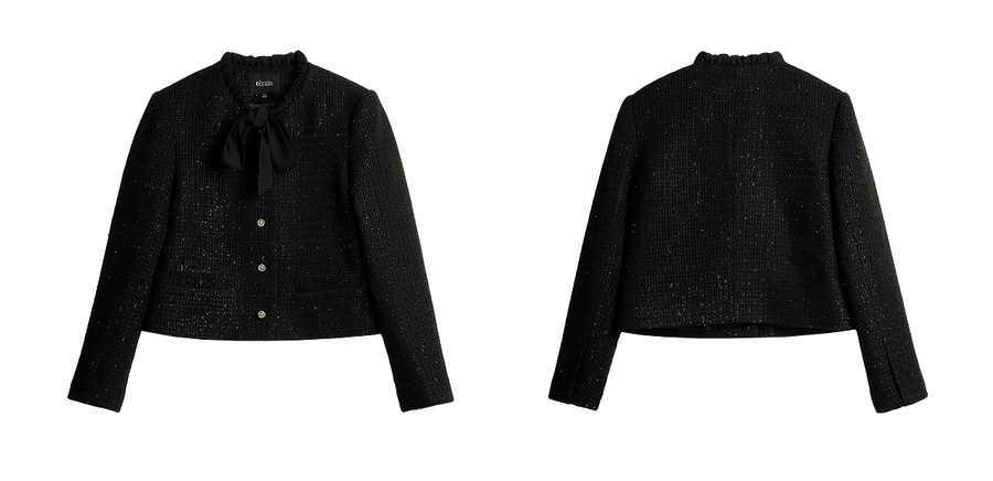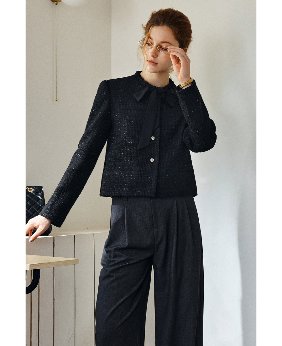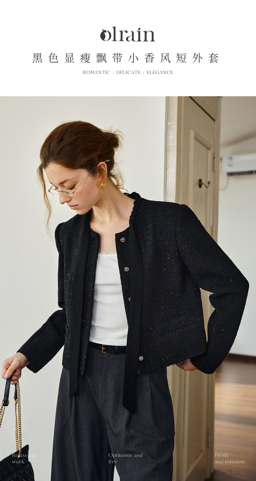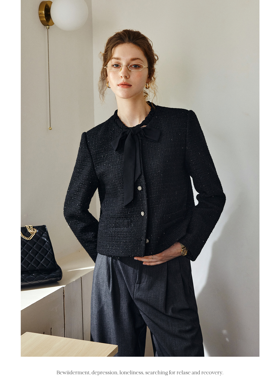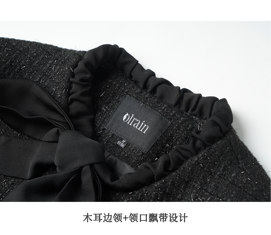 OLrain欧芮儿法式黑色显瘦飘带小香风2025秋季新款时尚百搭短外套