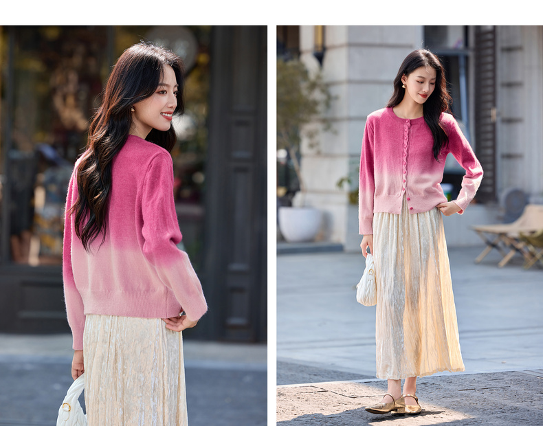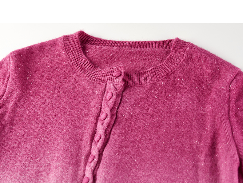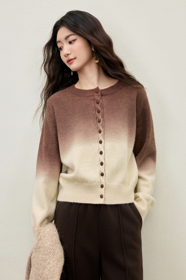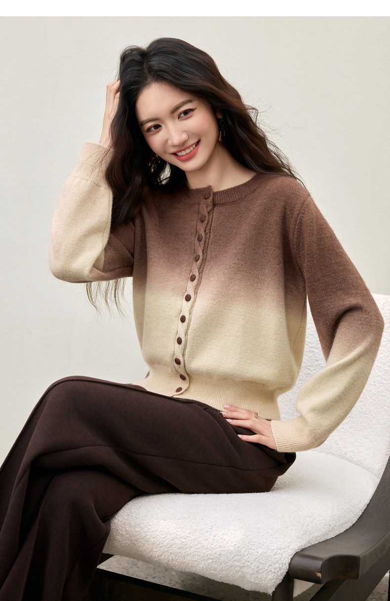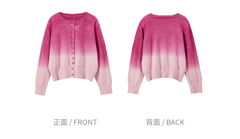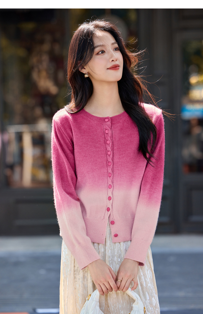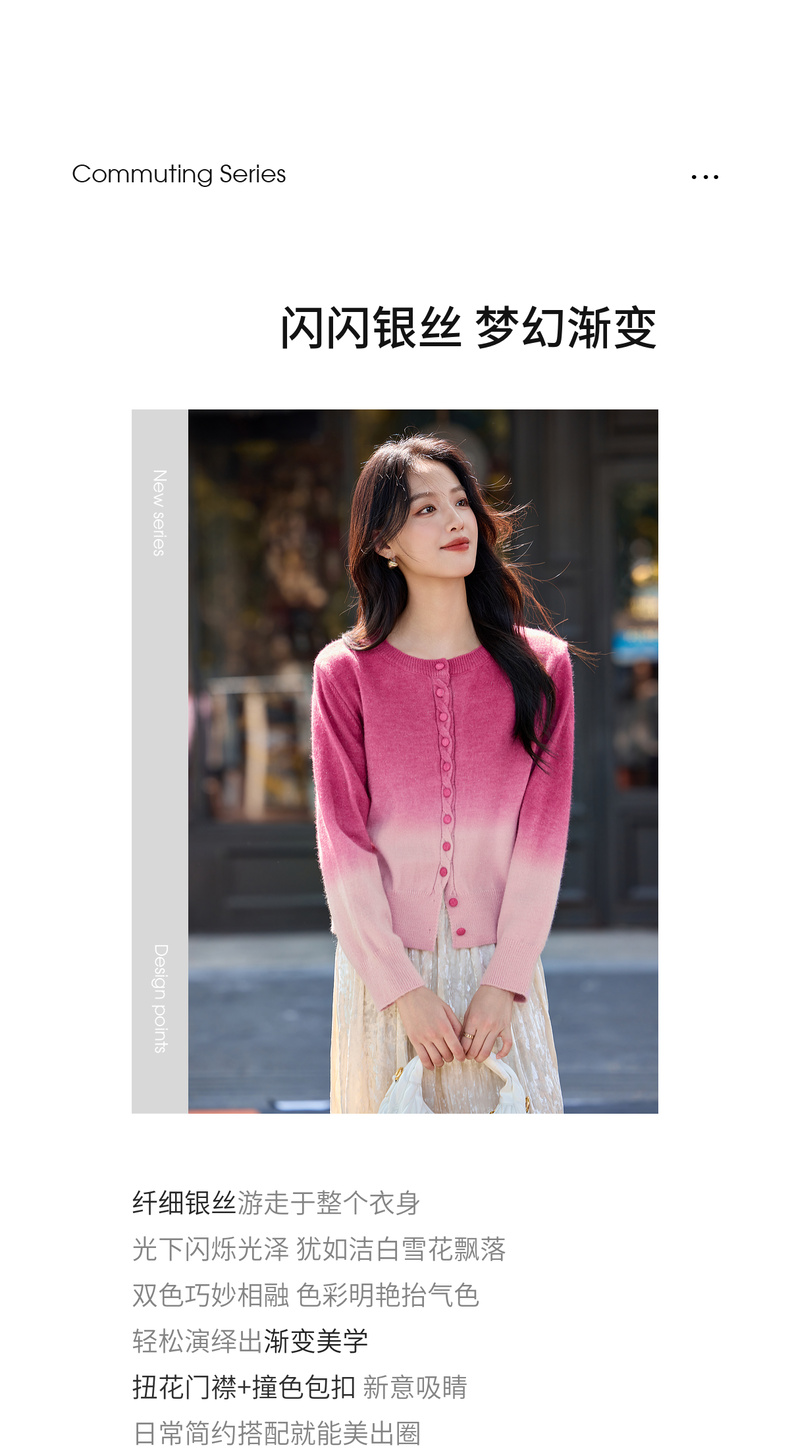 【内购】【梦幻渐变】时尚洋气圆领扭花门襟单排扣落肩短款银丝开衫毛衣-W54EB4833