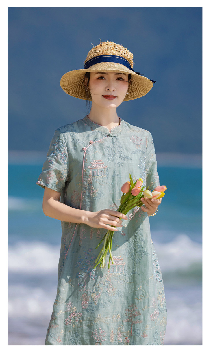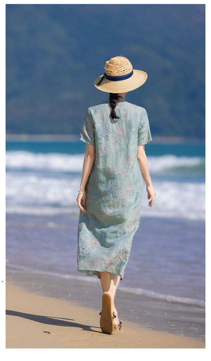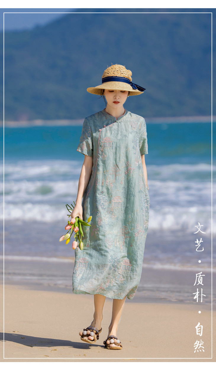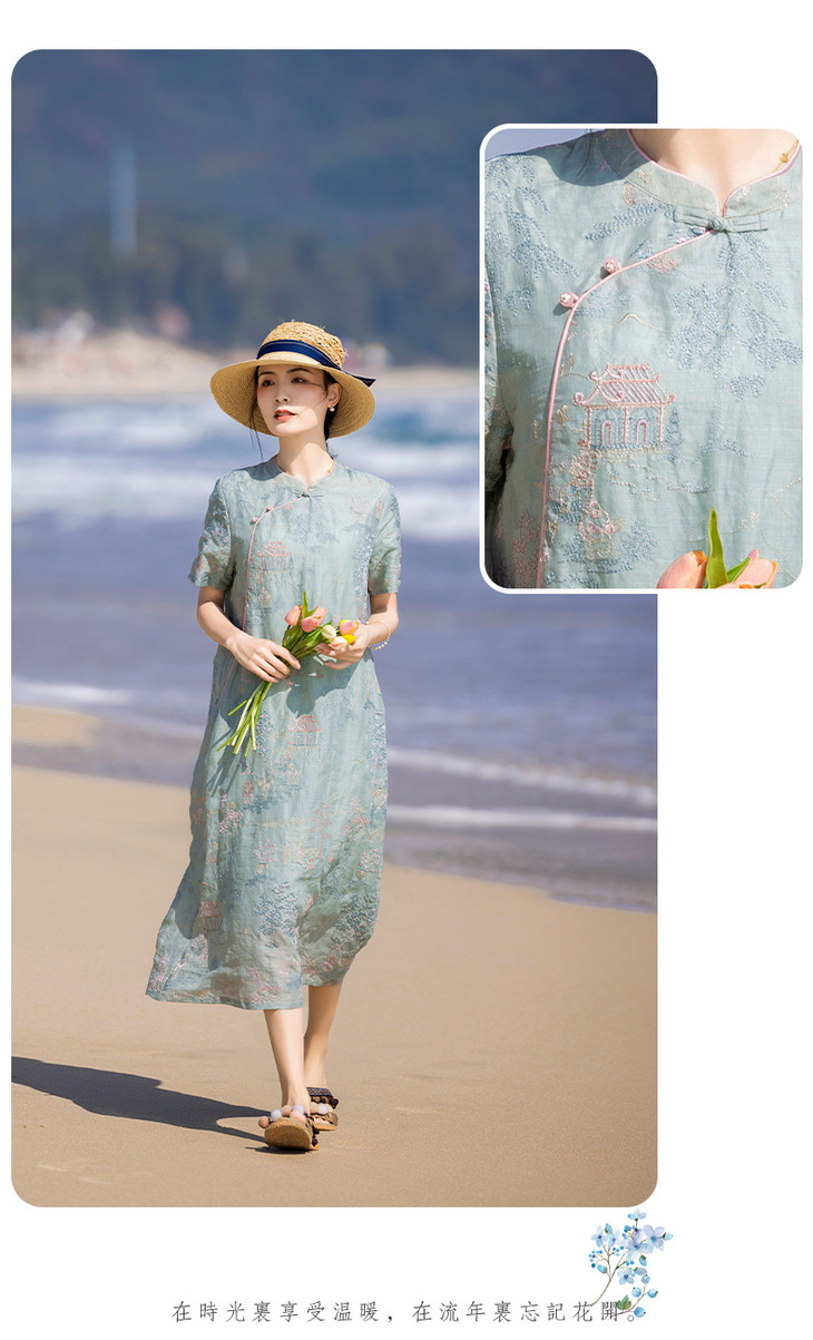 春夏新款中国风楼阁刺绣苎麻改良旗袍文艺连衣裙YM-S470