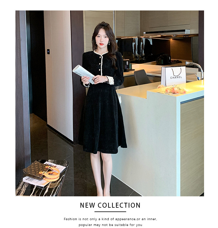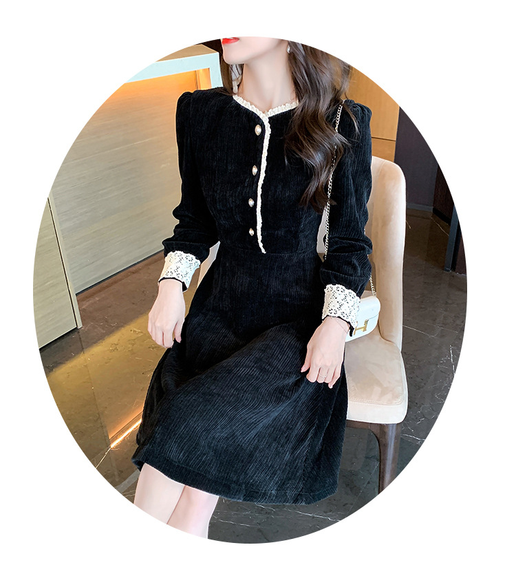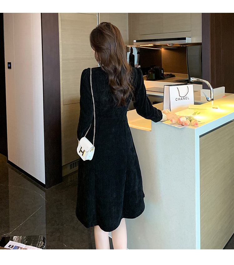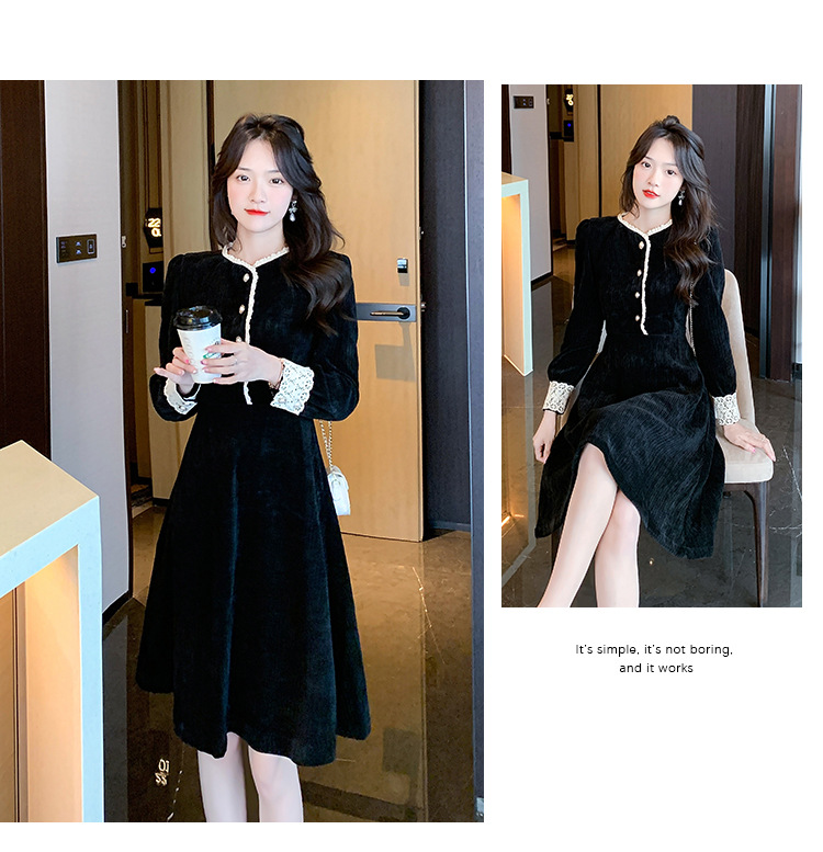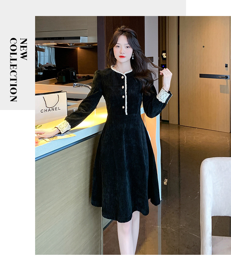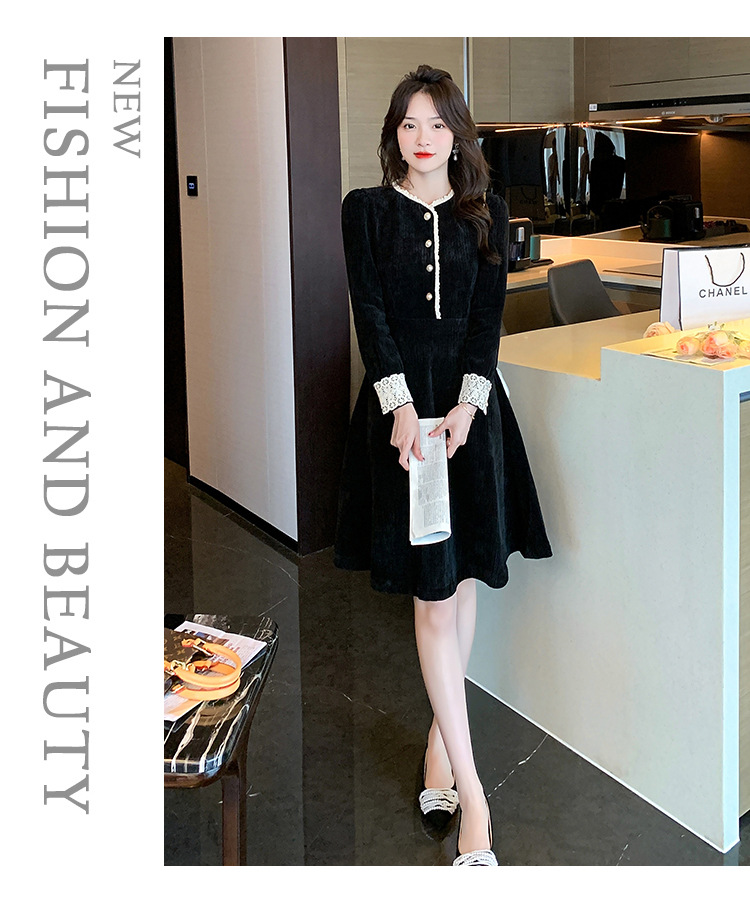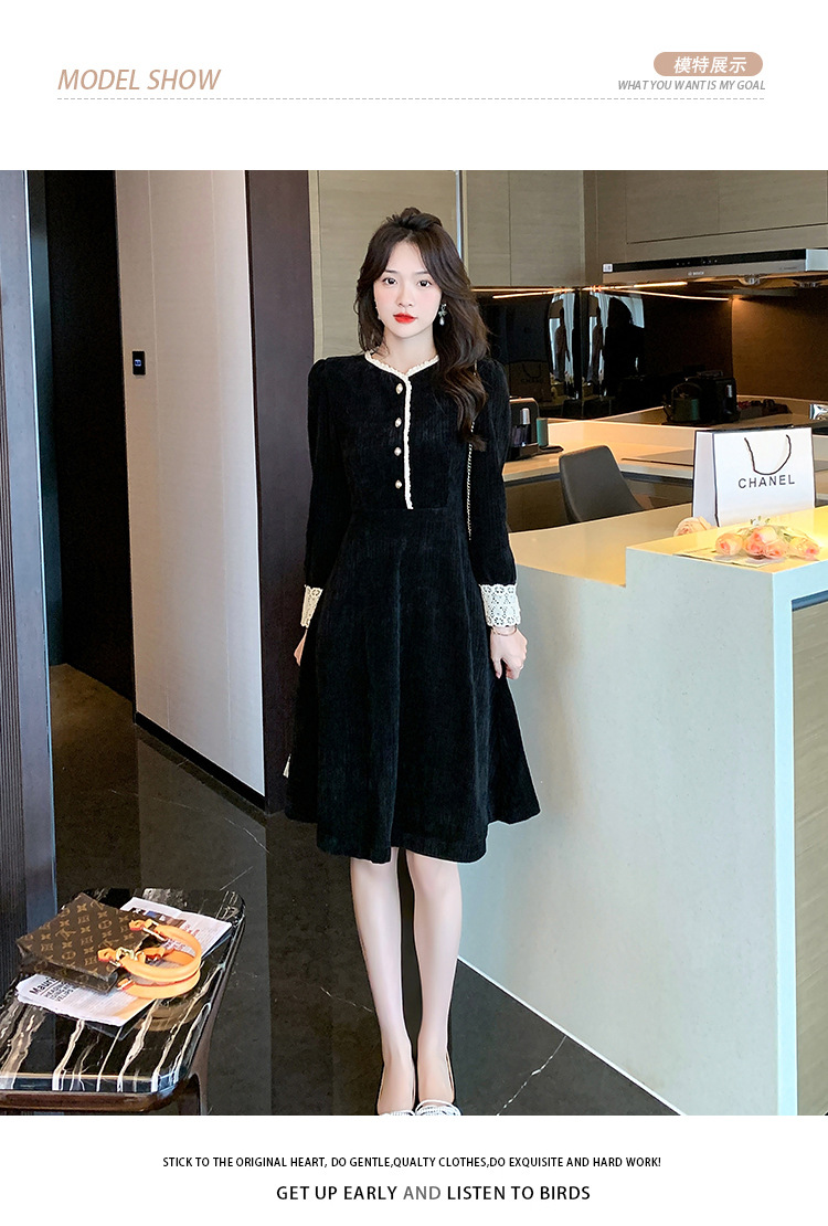 秋季新款气质女装圆领长袖显瘦中长裙拼接法式灯芯绒连衣裙HT-5021