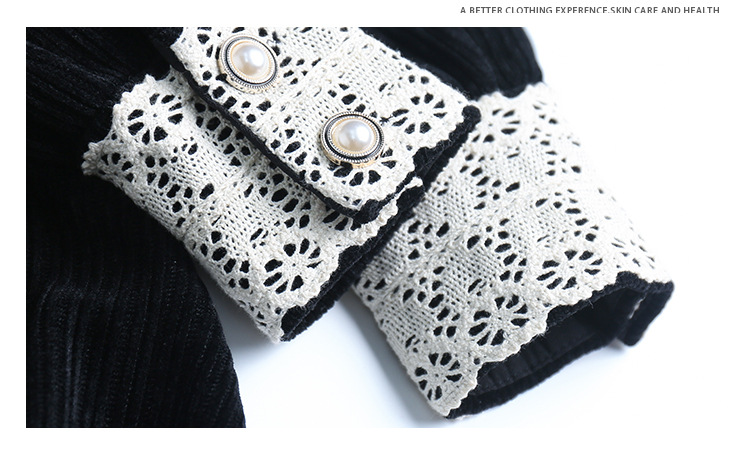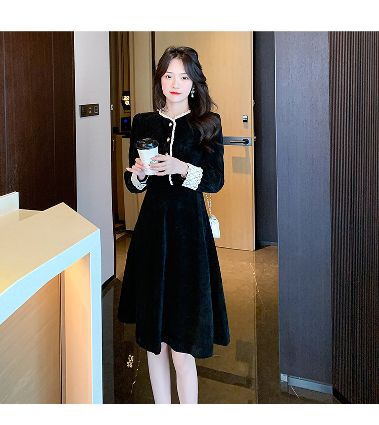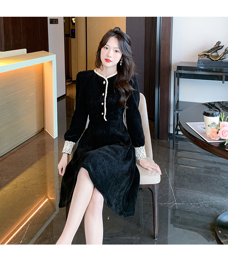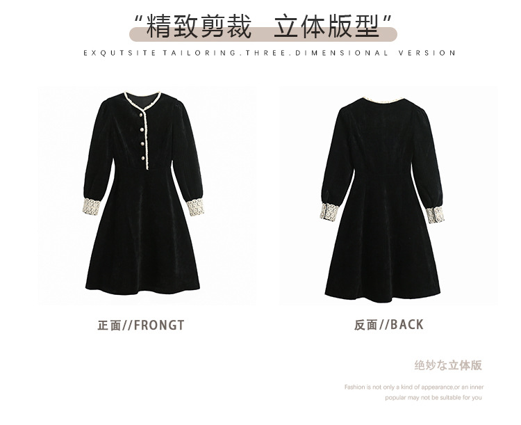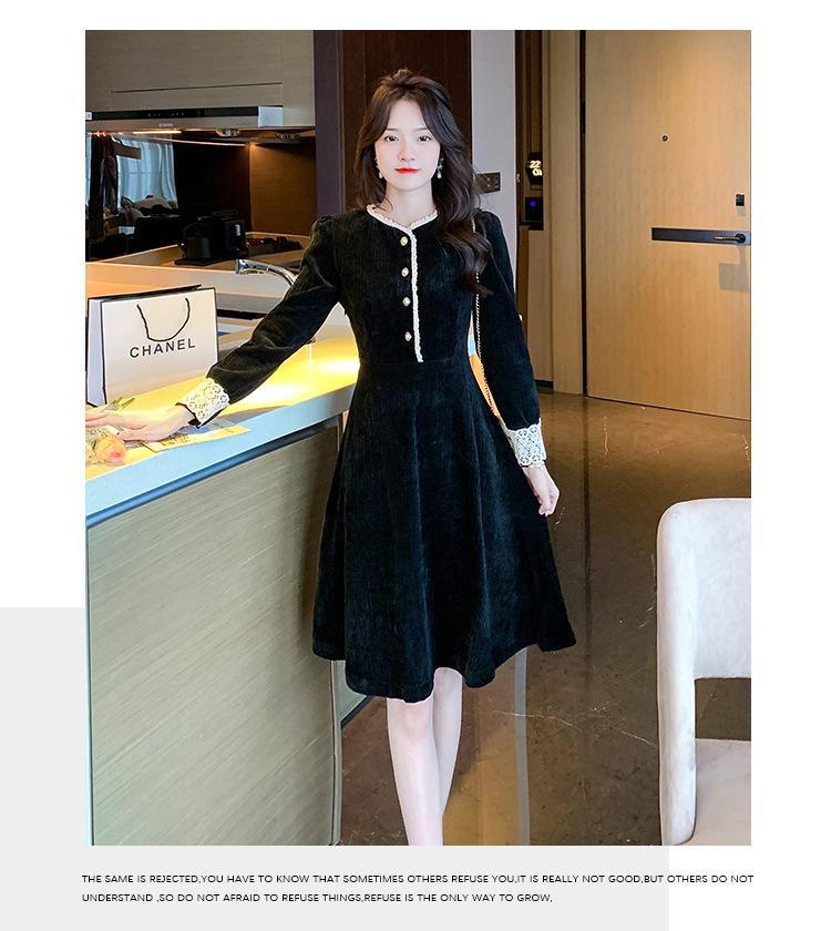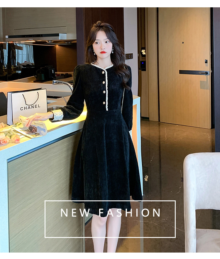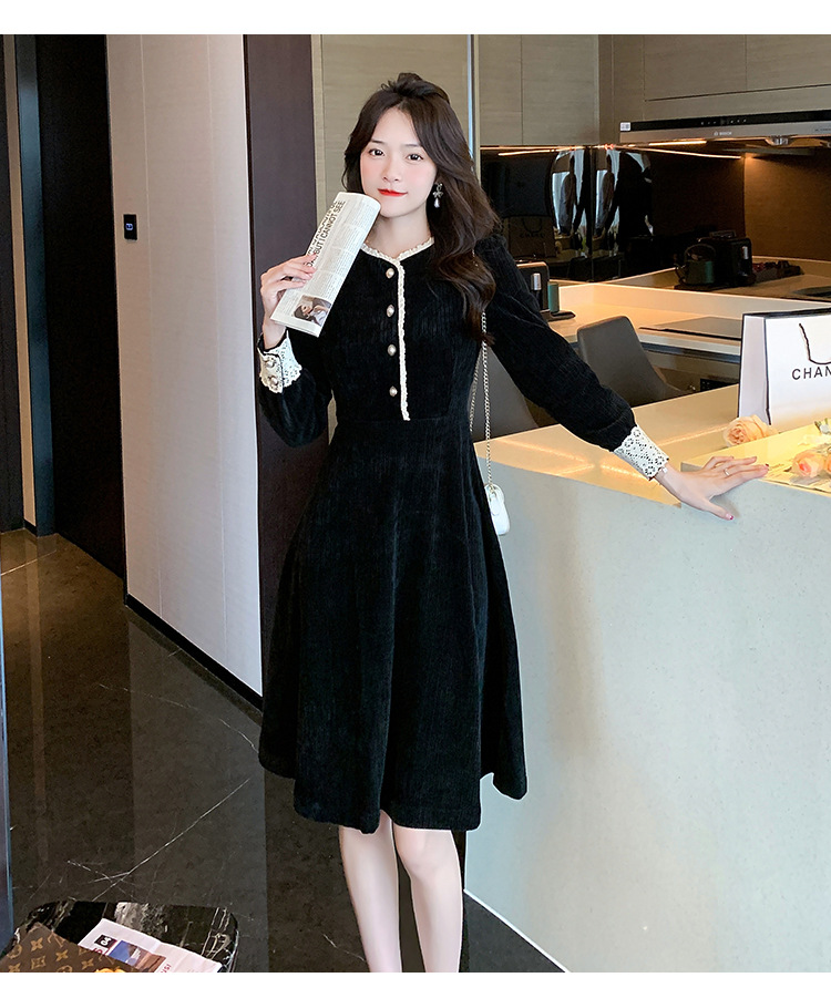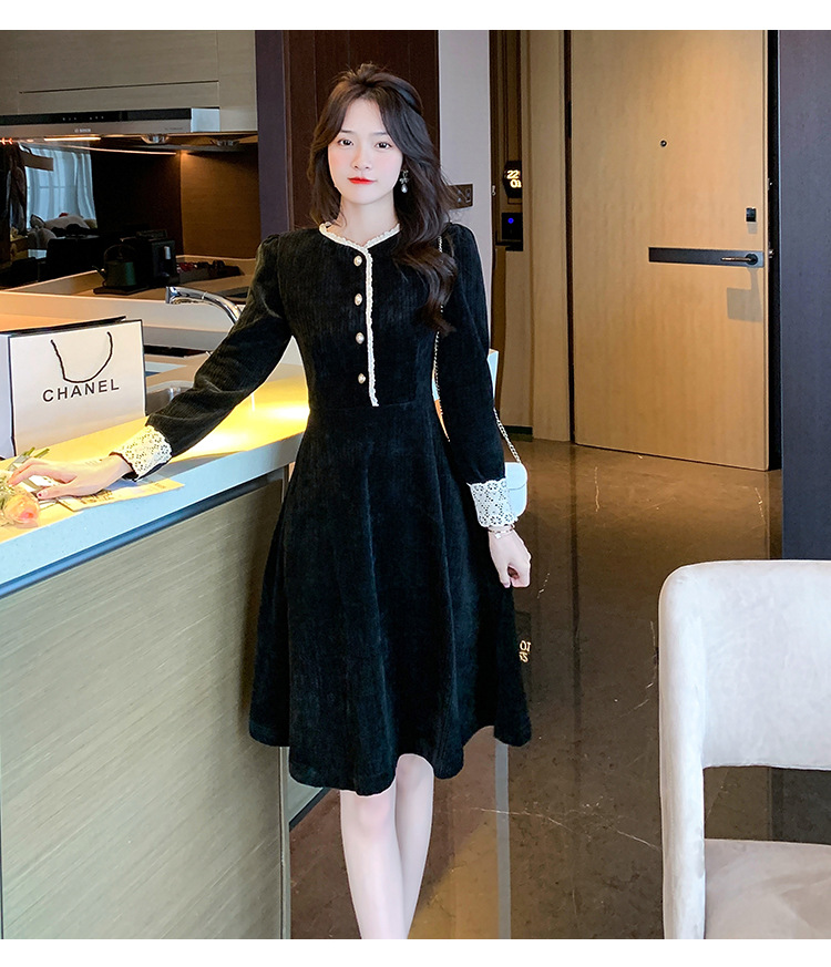 秋季新款气质女装圆领长袖显瘦中长裙拼接法式灯芯绒连衣裙HT-5021
