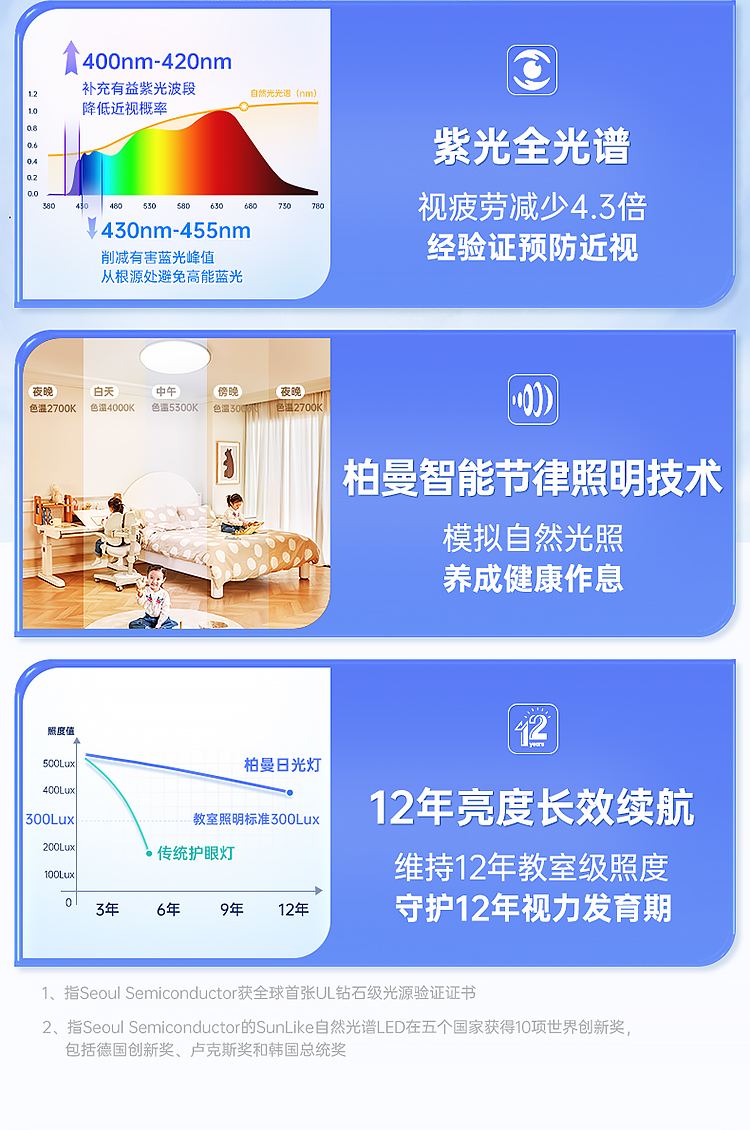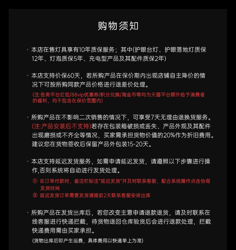 10年性能质保,1 年内性能问题包换。(充电产品2年,灯泡5年,护眼台地灯12年)