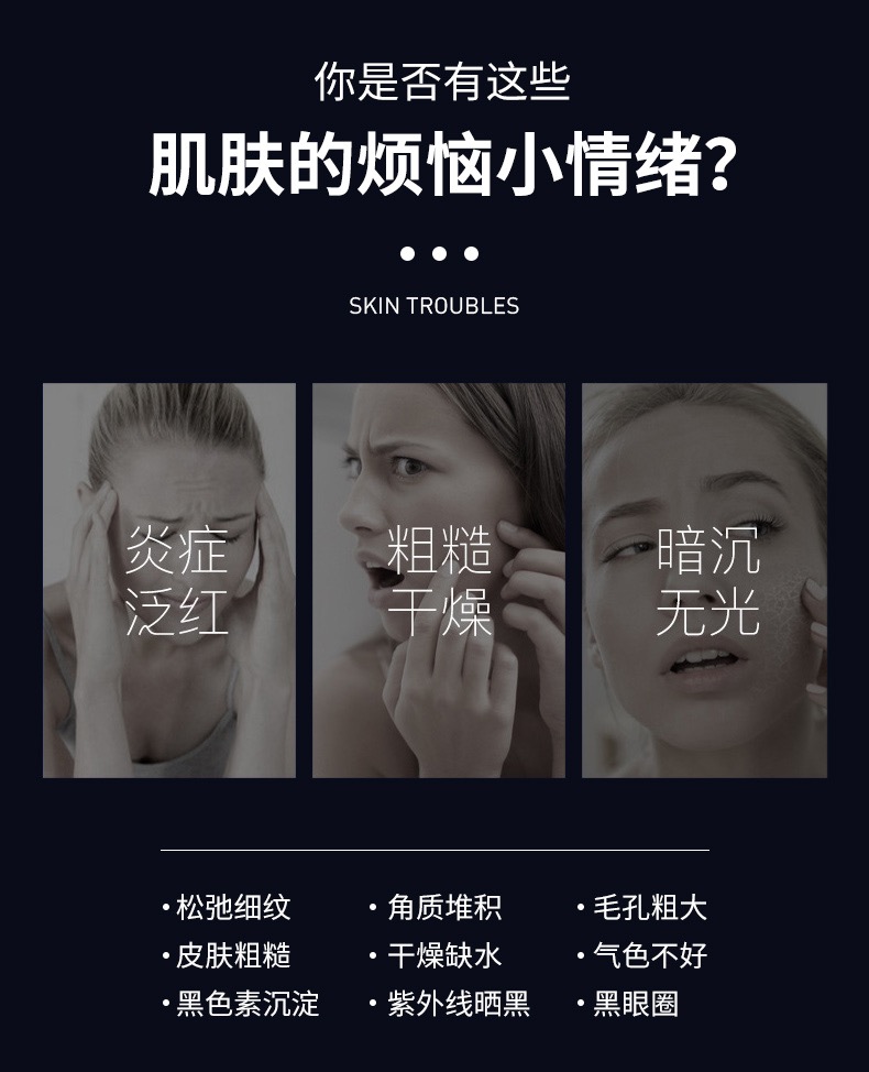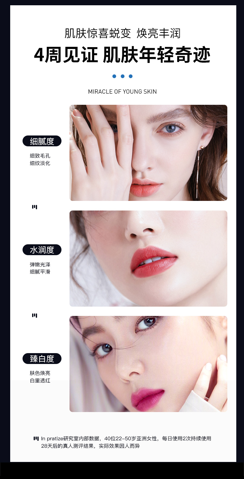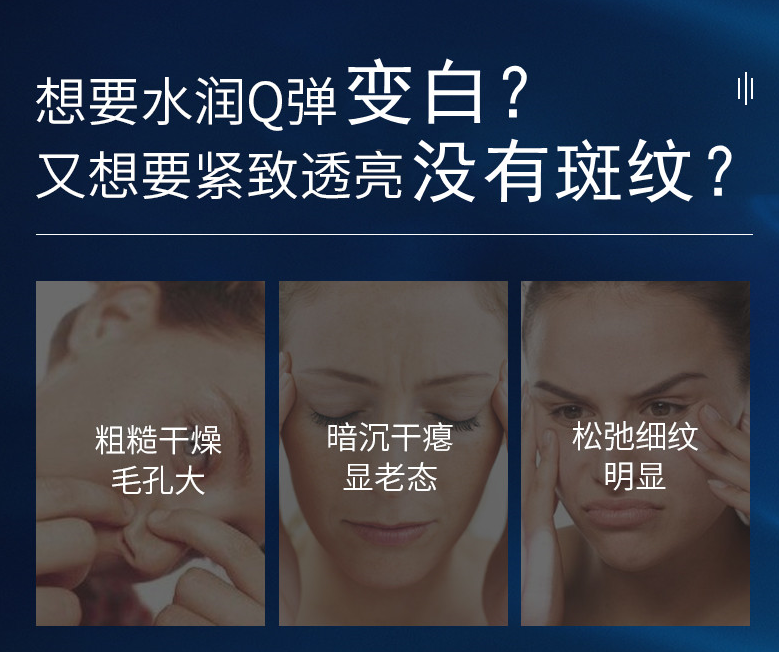 2.缩小毛孔,清透水润,净化肌肤,抚平细纹,褪黑淡黄,淡斑抗衰老
