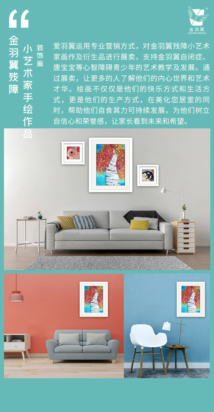 金羽翼将艺术与心理治疗相结合,用艺术教育的形式帮助残障青少年体现自身价值、提高生活质量、实现艺术梦想,并将绘画作品开发成衍生品销售,收入扣除成本后,20%返还给学员家庭,80%用于金羽翼艺术康复教学。