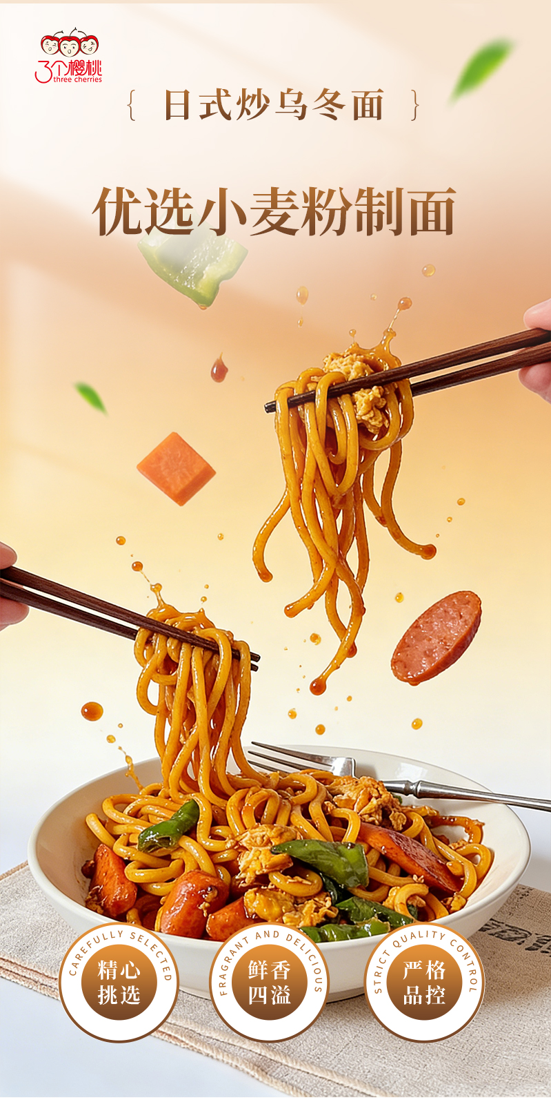 【Q弹劲道 60秒速享美味】三个樱桃日式炒乌冬面420g*4袋