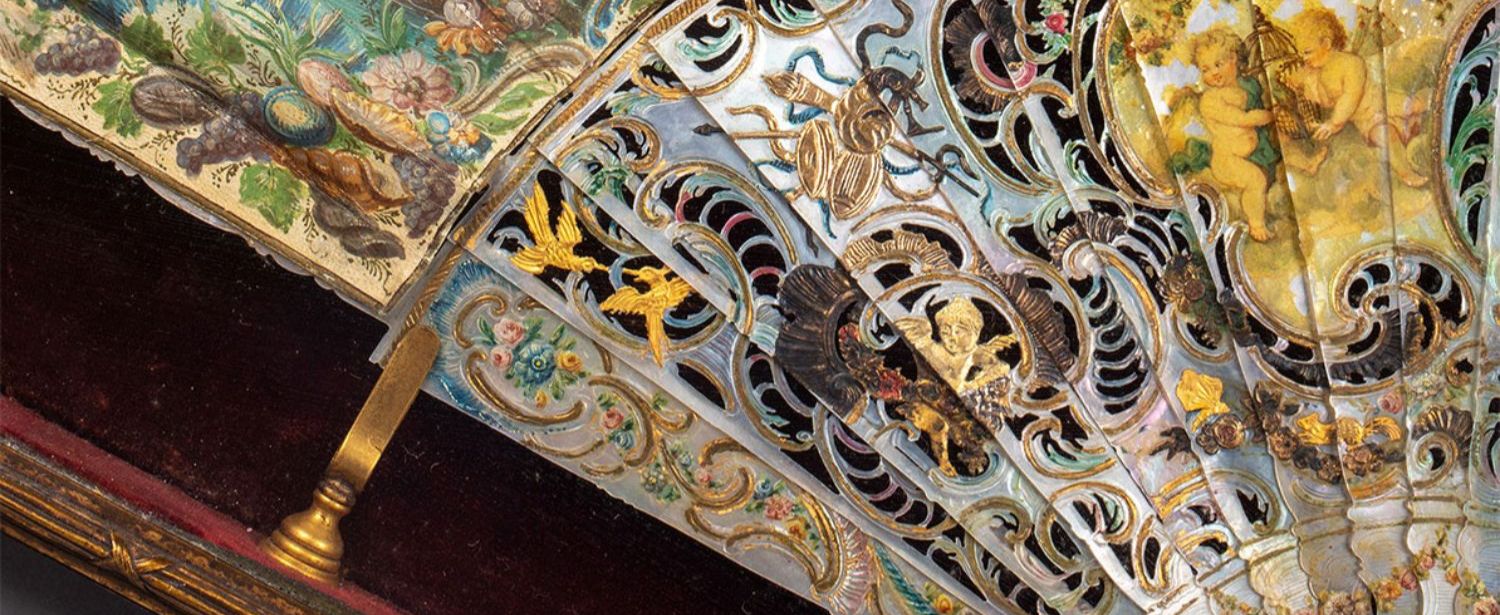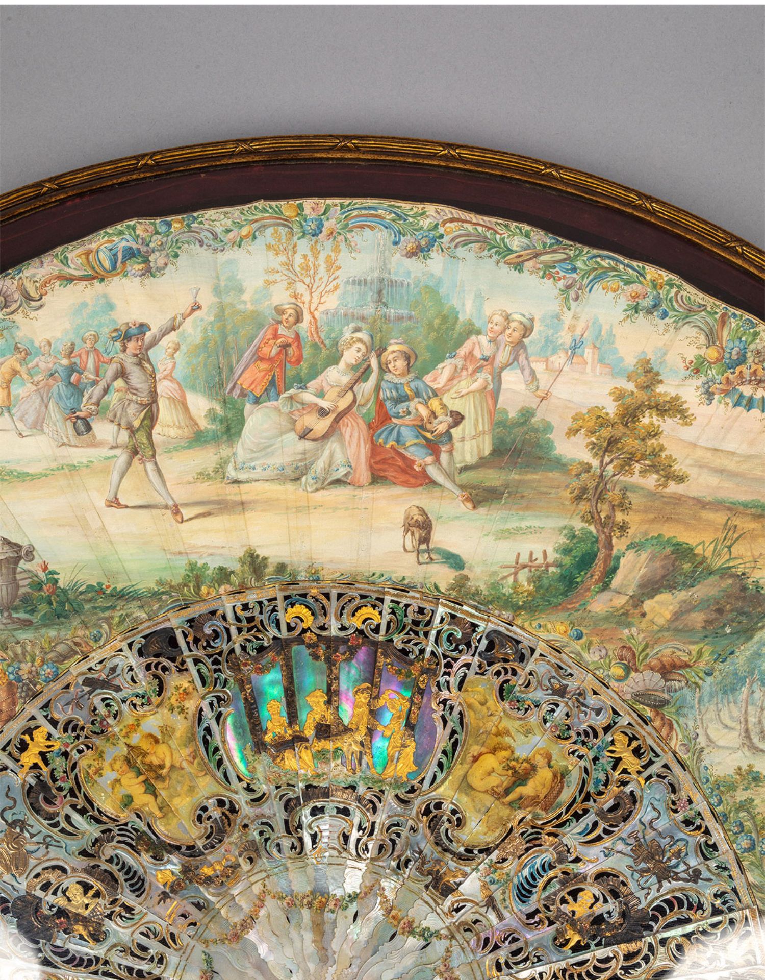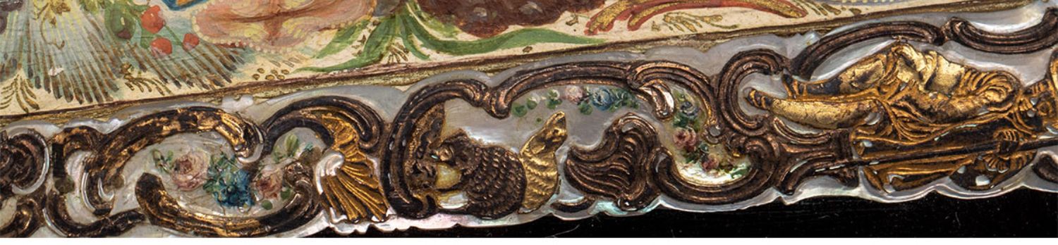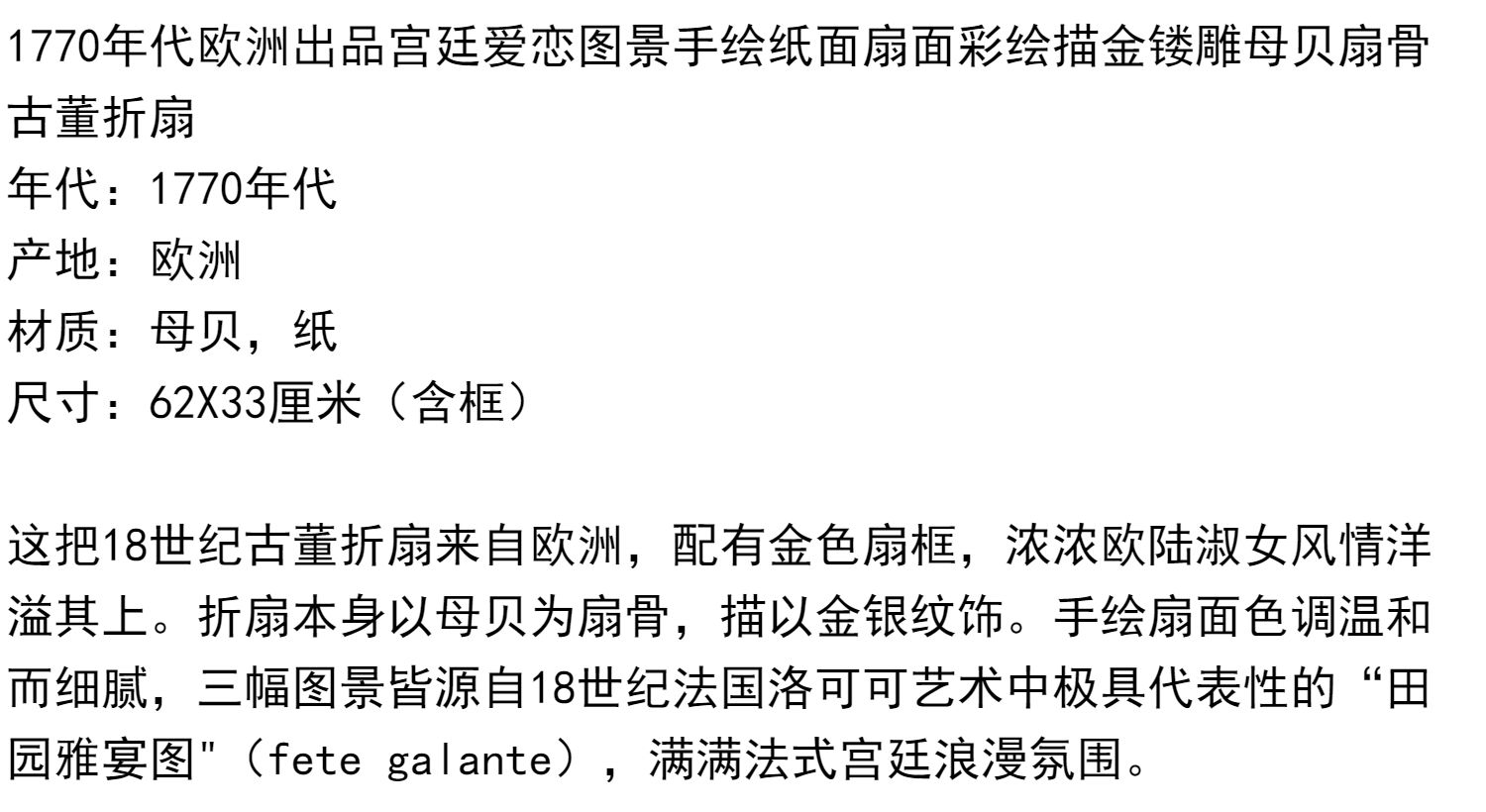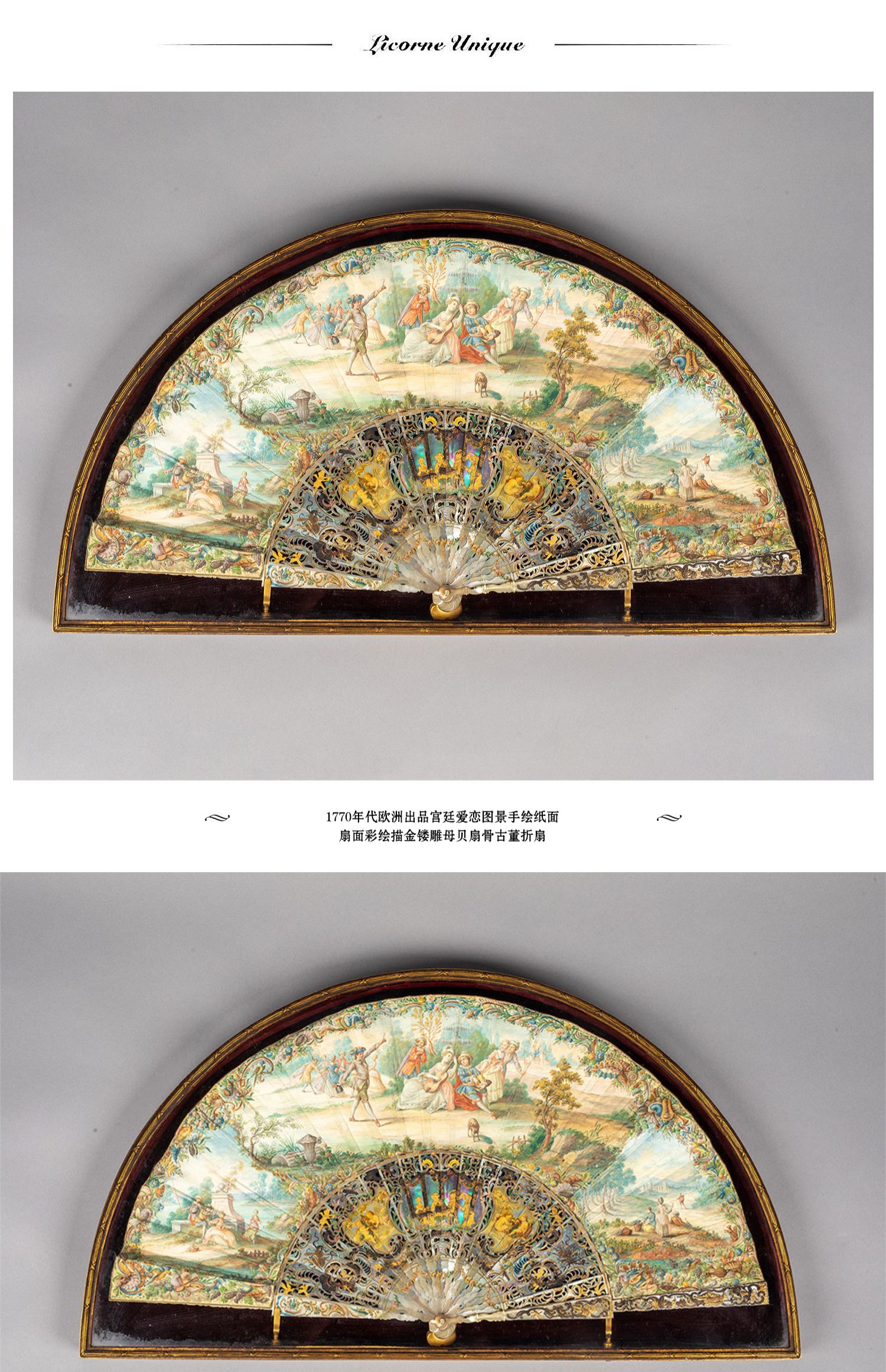 独角鹿西洋古董欧洲手绘纸面扇面彩绘描金镂雕母贝扇骨折扇