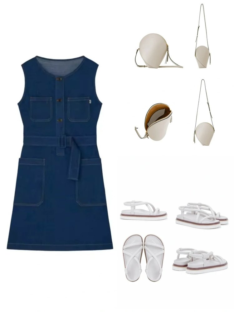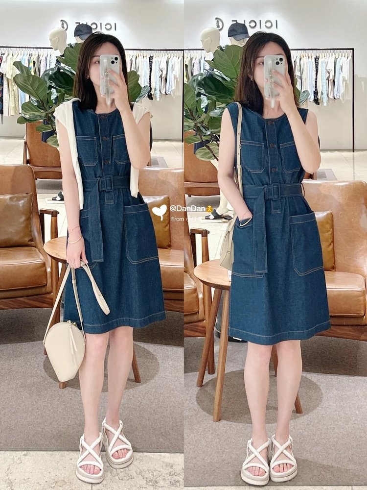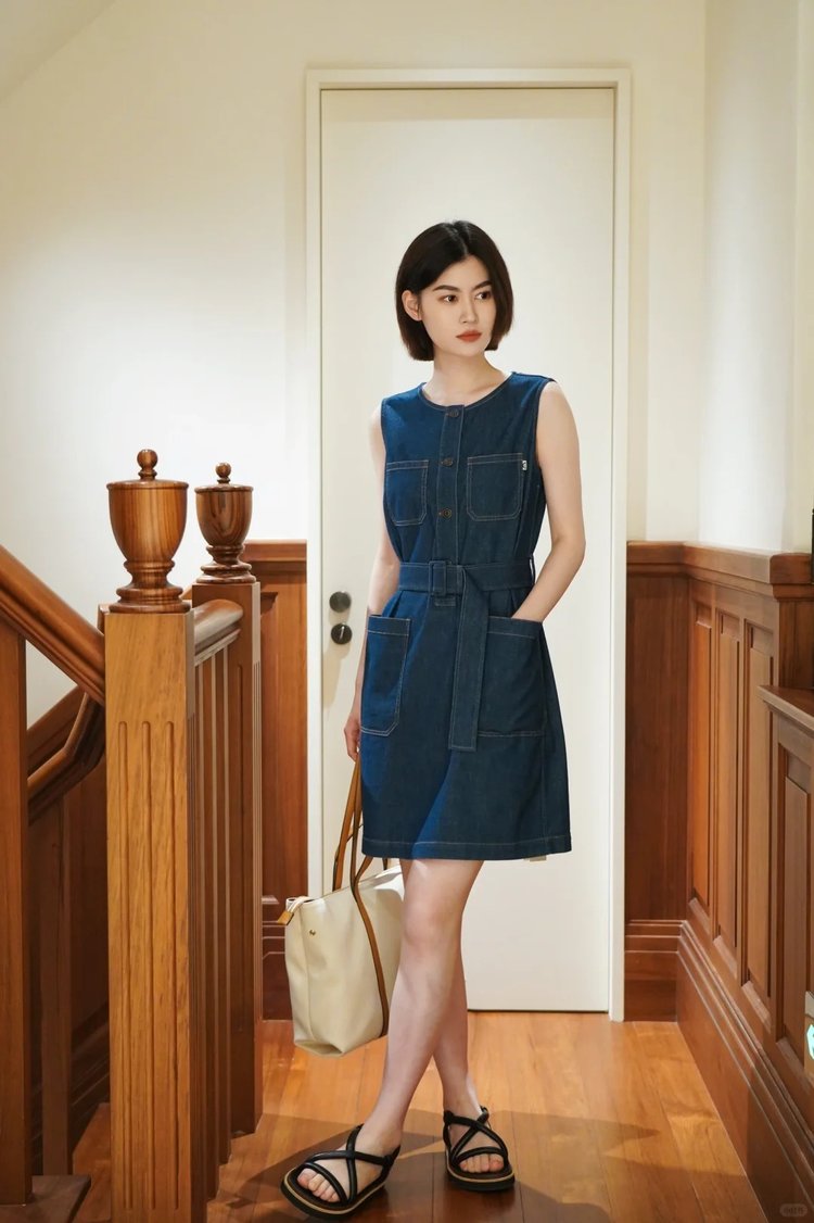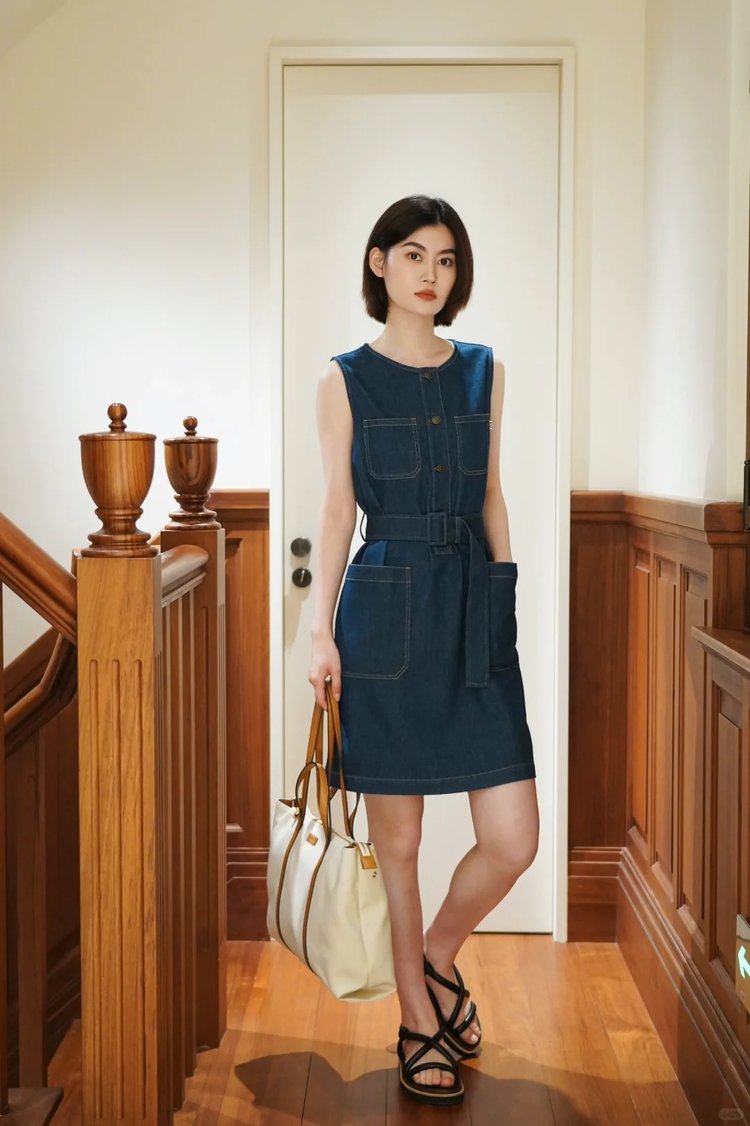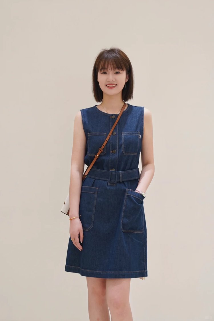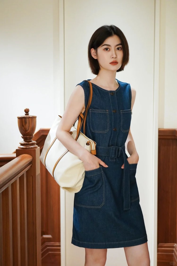 小禾同款欧洲进口牛仔无袖腰带连衣裙