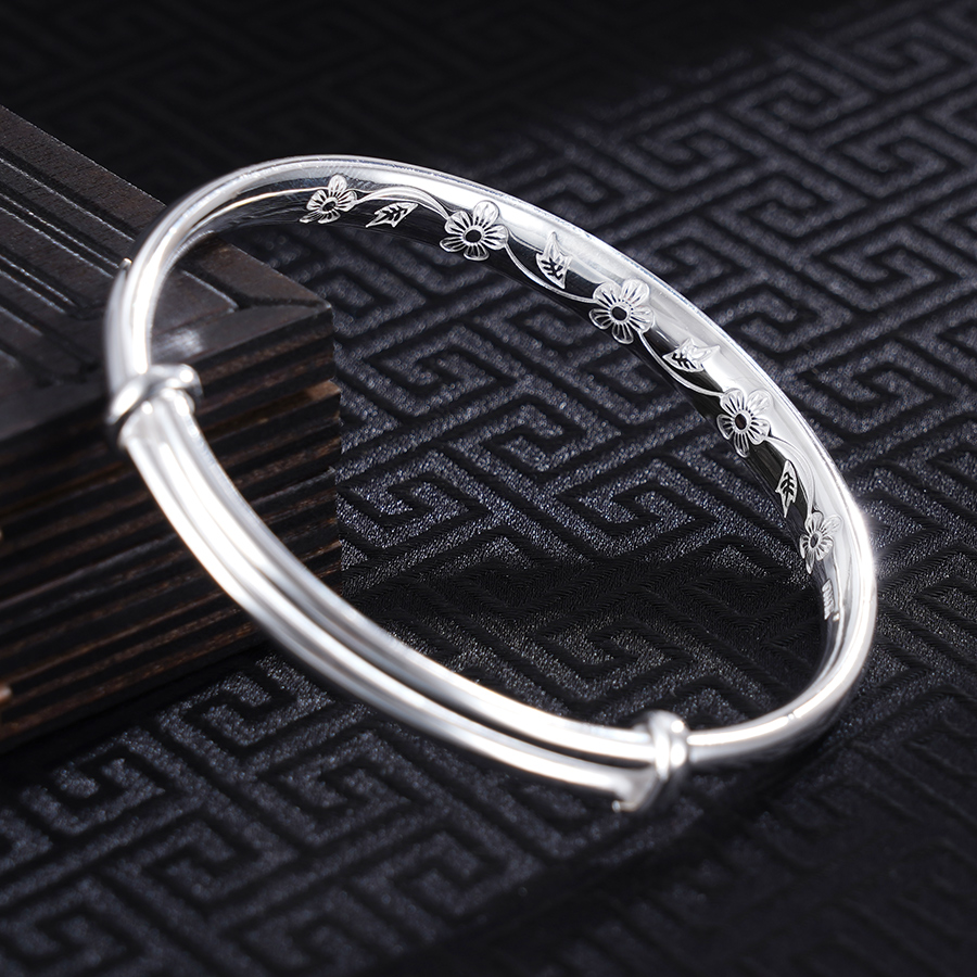 【寓意】:手镯设计灵感取自莲花,内外圈皆錾刻花朵图案,精美耐看,质感十足。象征着青春莲华,好运莲莲。