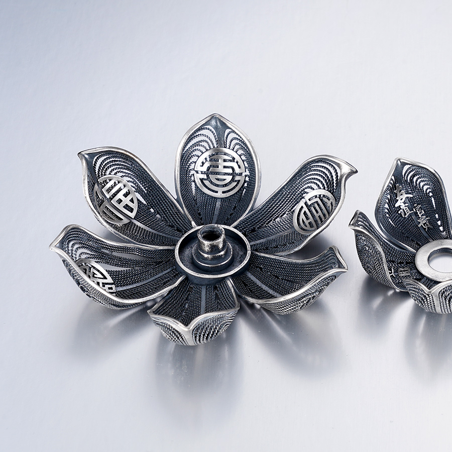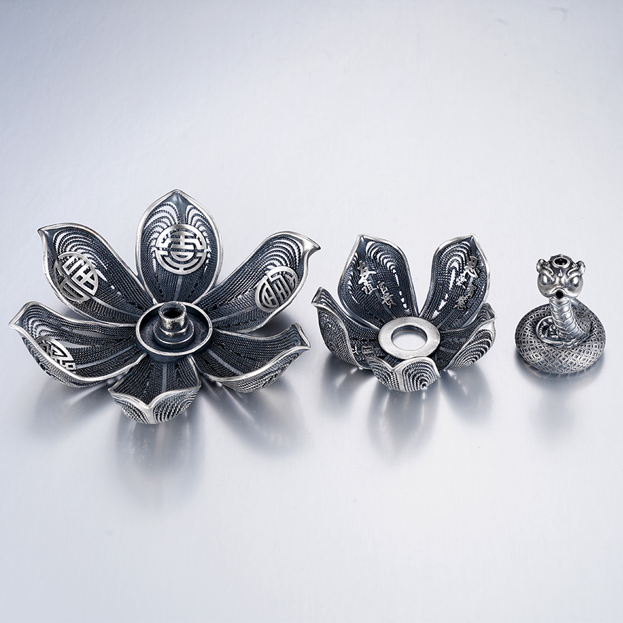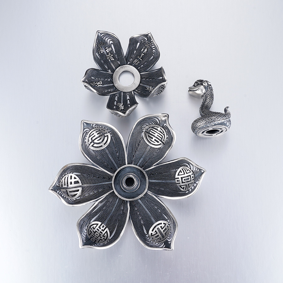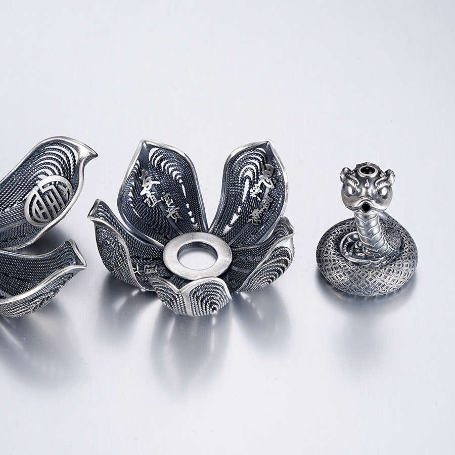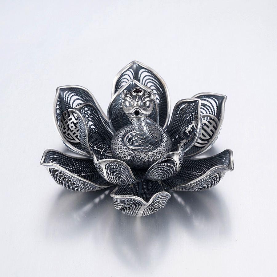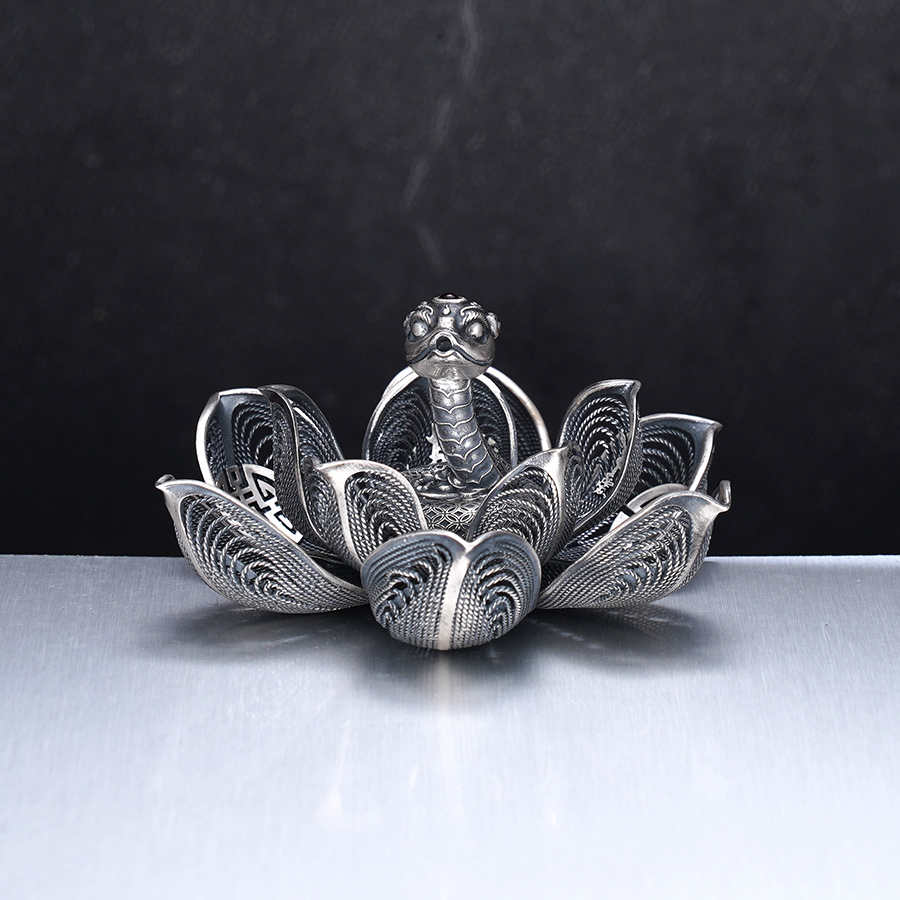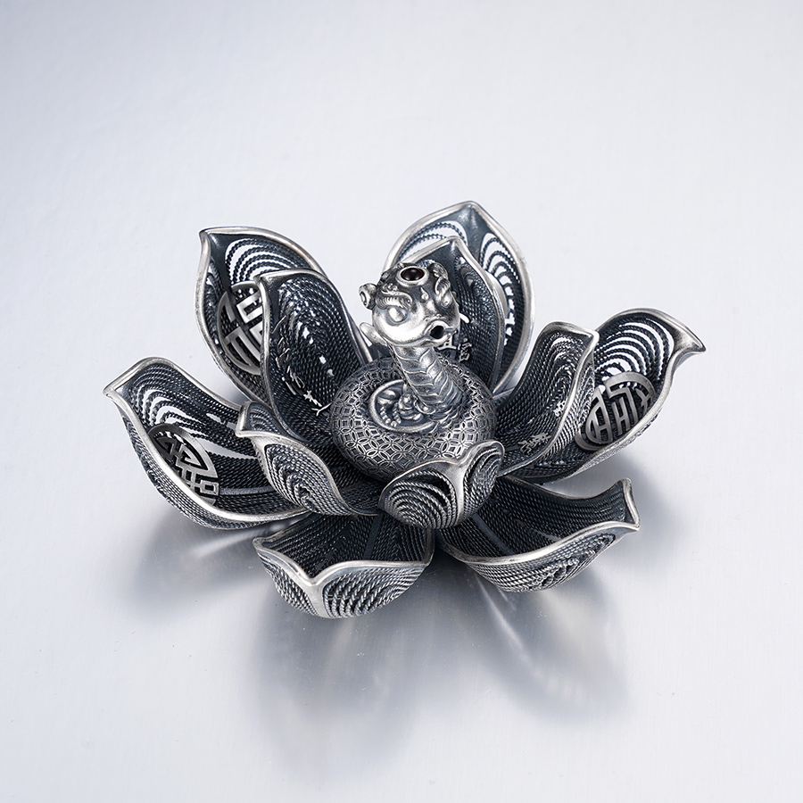 【寓意】:纯银香插呈莲花造型,灵蛇盘旋其间,巧妙构成花蕊,设计灵动非凡。融合花丝与雕刻工艺,线条虬劲有力,色泽沉稳内敛,造型古朴典雅。寓意莲花开而灵蛇见,福气至且好运来。