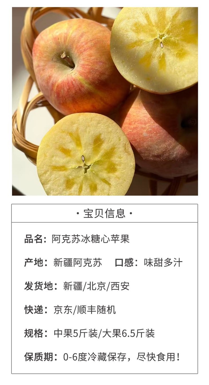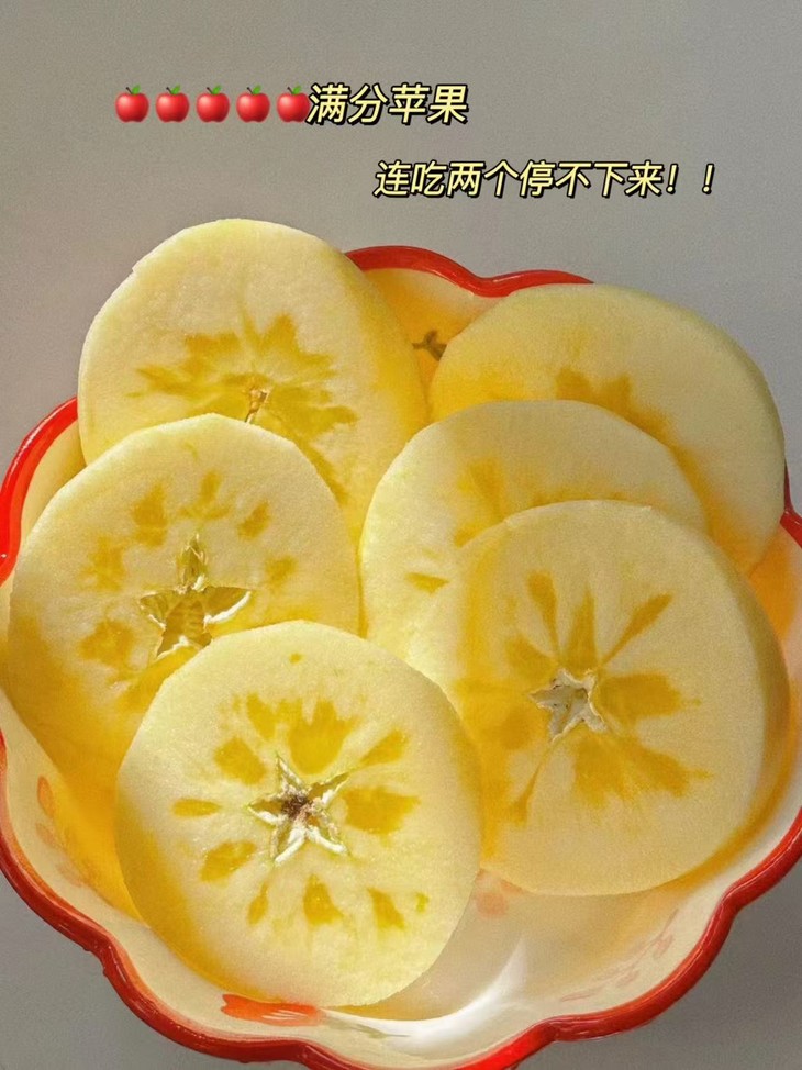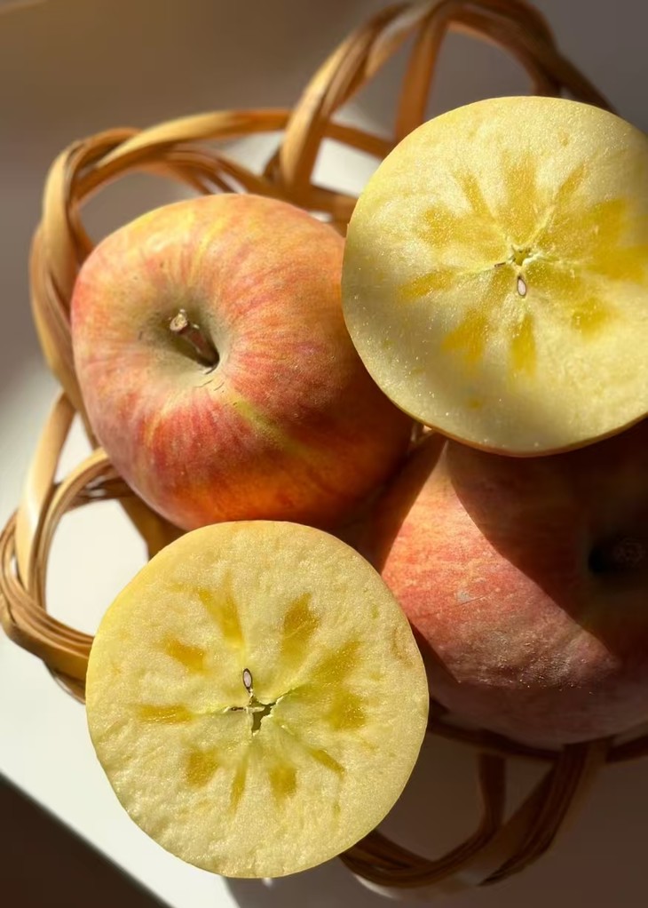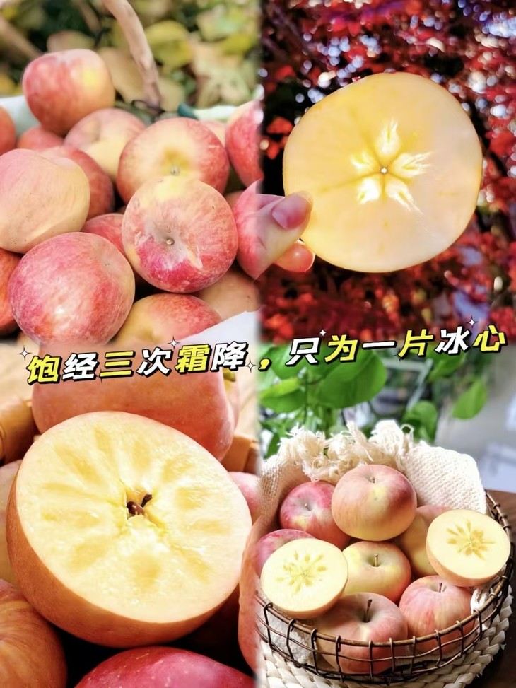 用天上雪水浇灌,表皮红艳艳,切开果肉淡黄如蜜,冰糖心泛着水光,果香诱人,让人直想咬一口。