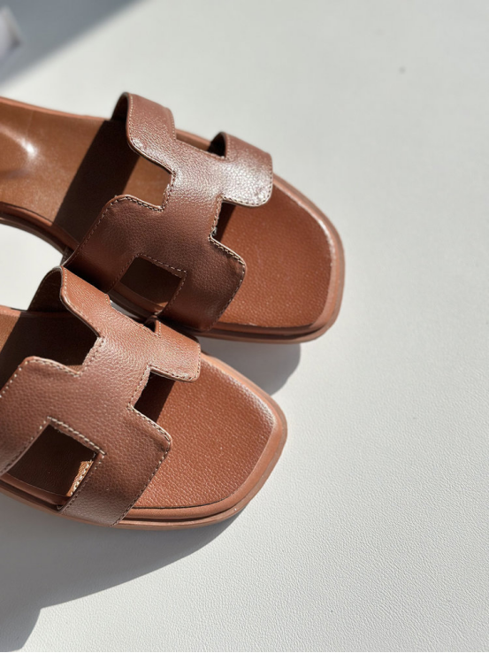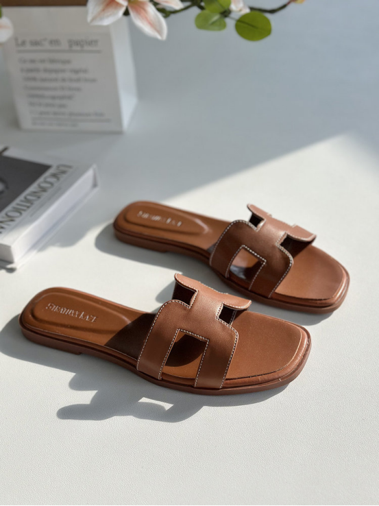 没有任何的花里胡哨 但是超级经典的H拖鞋 经典金棕色,主打的就是氛围感拿捏 经典中的王者,鞋底带一点点的鞋跟 所以不是绝对平底,上脚还是有一丢丢显高的~