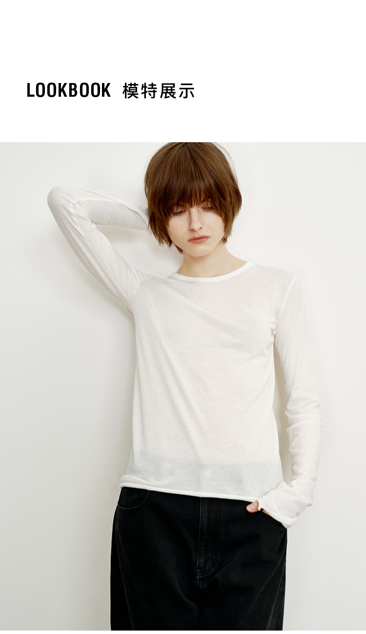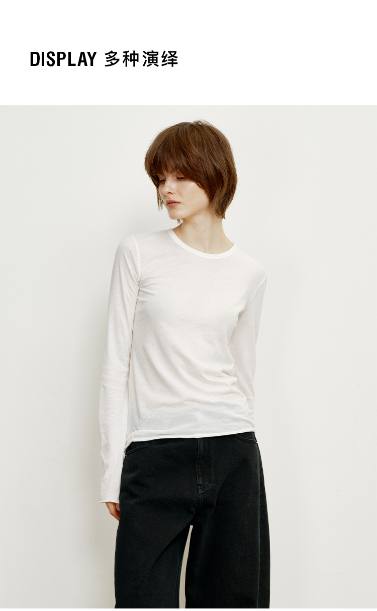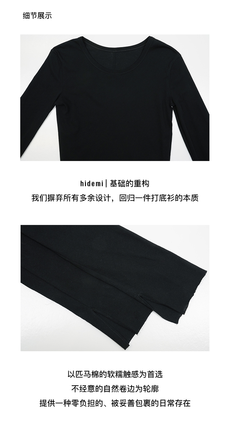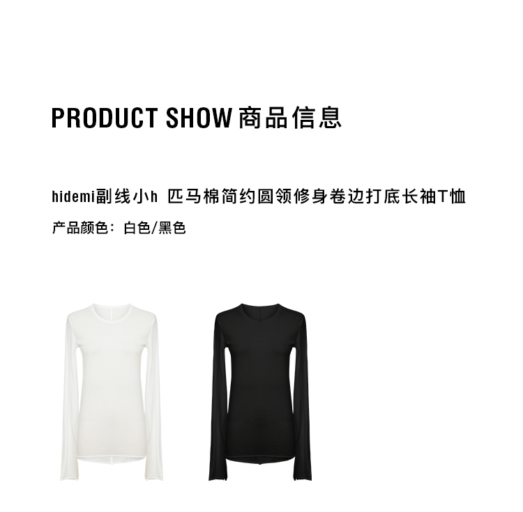 hidemi副线小h 匹马棉简约圆领修身卷边打底长袖T恤