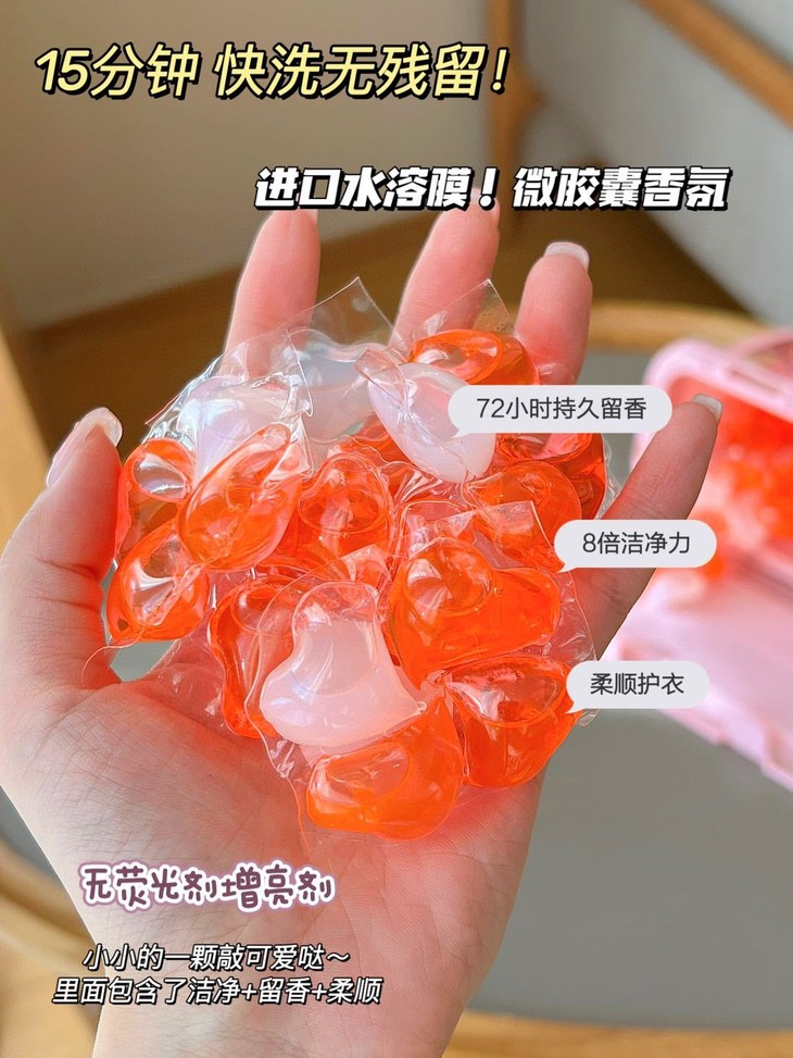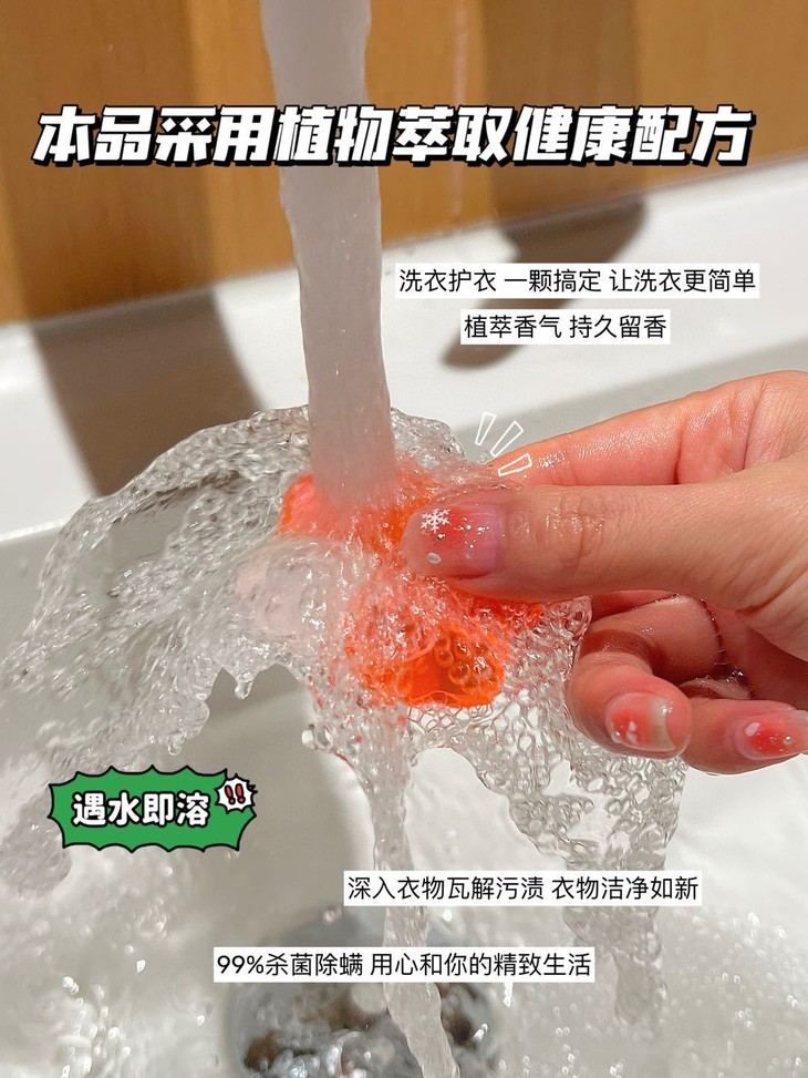 采用速溶外膜构造➕科学水溶膜配比 适配洗衣机快洗模式 不用担心膜会残留在衣服上哦 深层清洁衣物,让它们保持柔软如新。 使用方法超级方便,只需轻轻一丢 就可以搞定一切。再也不用担心会弄脏手了。