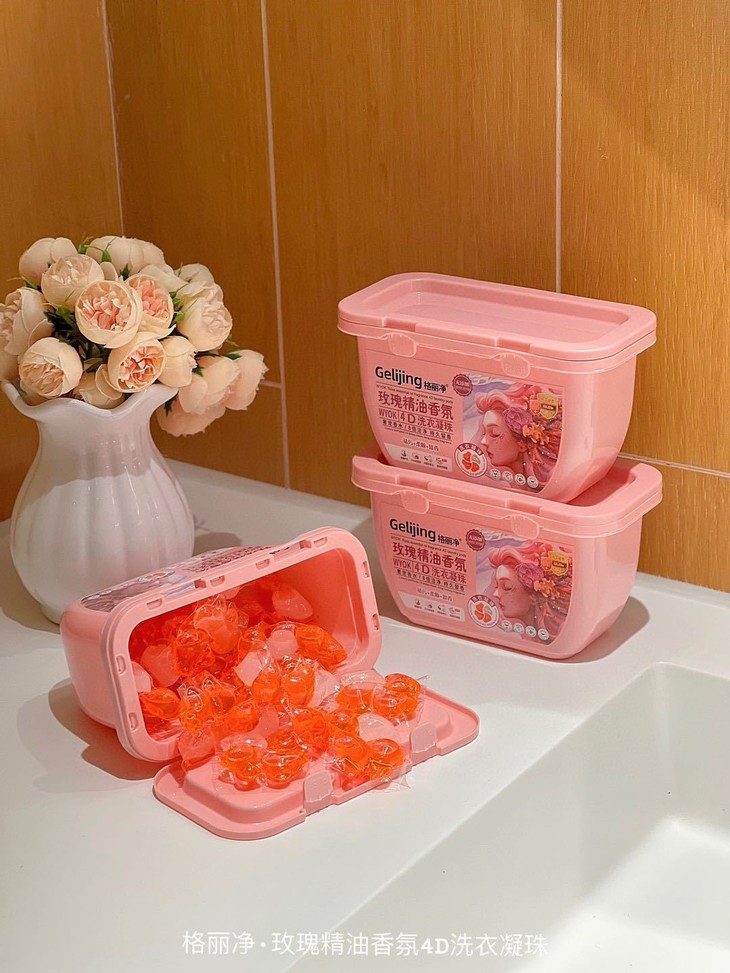 玫瑰精油香氛4D洗衣凝珠 • 洁净力强,有效去除顽固污渍 • 深入纤维,持久留香 • 呵护衣物,不伤手不伤衣 • 浓缩精华,一次一颗,全家适用