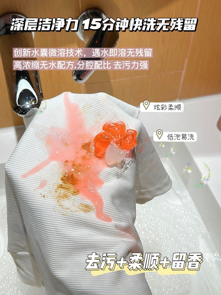 使用的时候很方便不用拆除包装🛍 遇水就能自己溶化 一粒就能洗十几件衣服PH值中性,非常温和 ✅衣服上的油渍、污垢被洗得干干净净🥰 三效合一简直不要太方便惹洗衣服都不用倒一堆瓶瓶罐罐