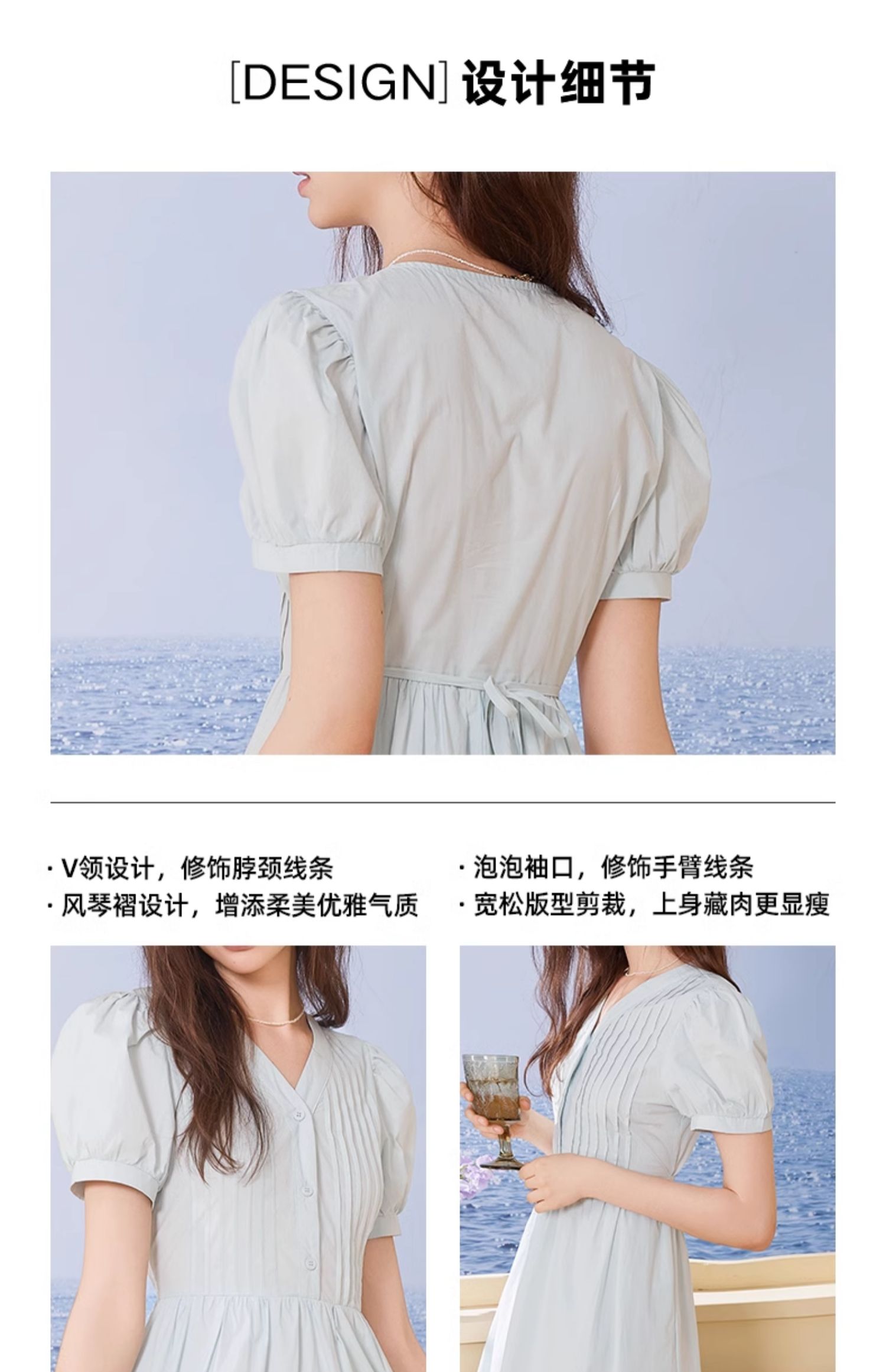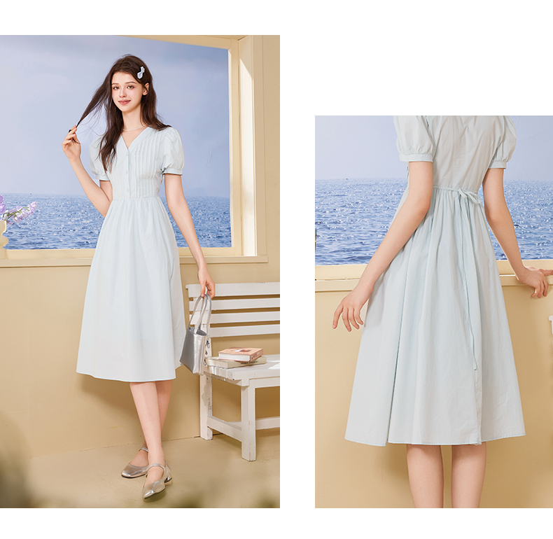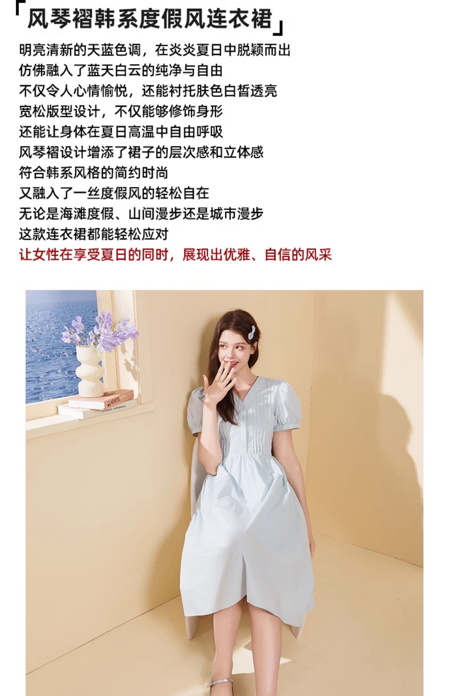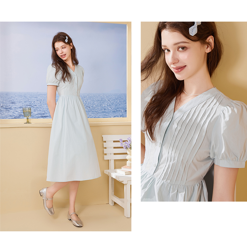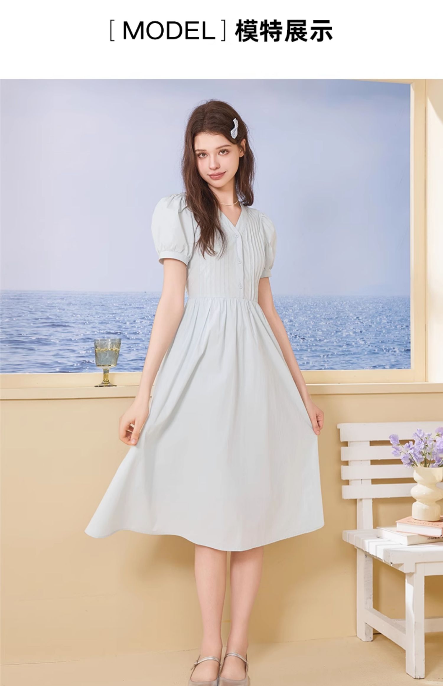 mc2宽松V领风琴褶韩系度假风连衣裙女装2024夏季新款时尚显白蓝色