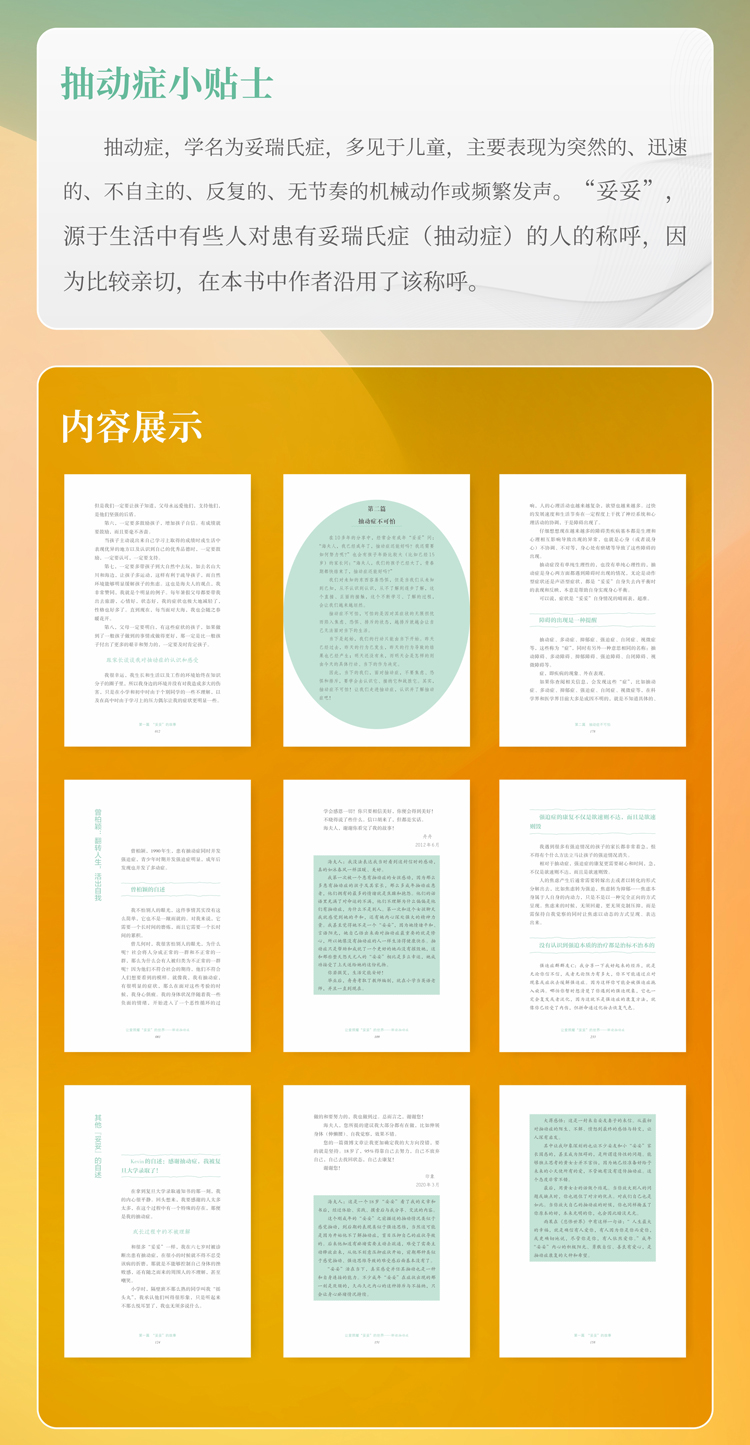 在书的前半部分,收录了一些“妥妥”所分享出的自己的感受和关于抽动症带来的各种经历;在书的后半部分,则细细介绍、描述了抽动症,如关于它的“是什么”“为什么”与“怎么做”。