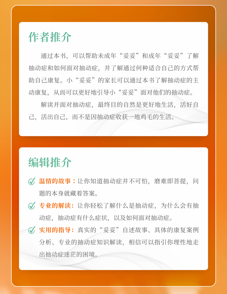 本书关于抽动症知识的解读不但专业,而且字里行间流淌着诚恳、关切,像是冬日的一抹暖阳,又似夏日的一缕清风,让人感觉到温暖、舒服,又非常切合需要。