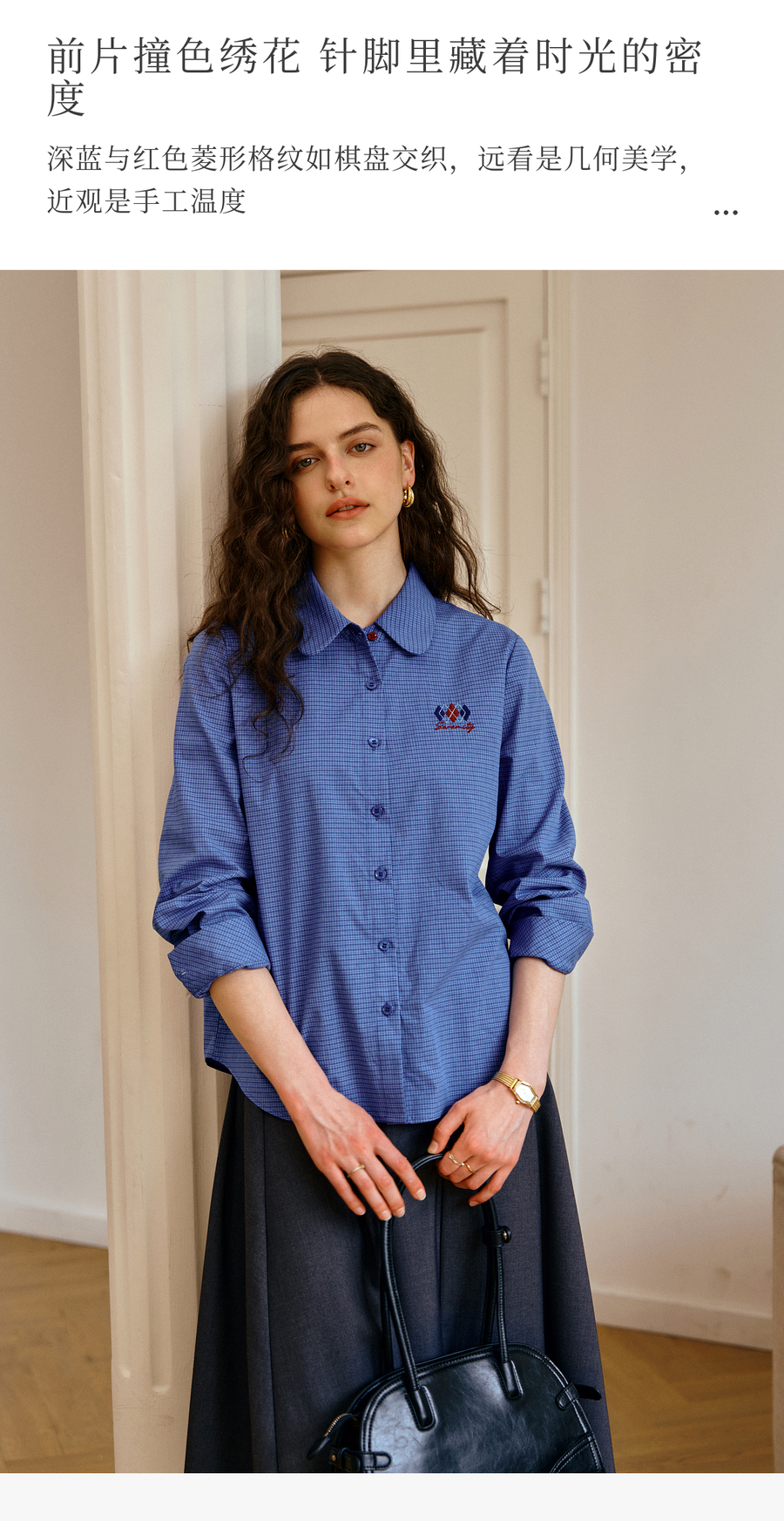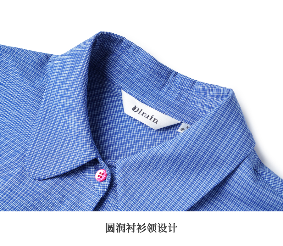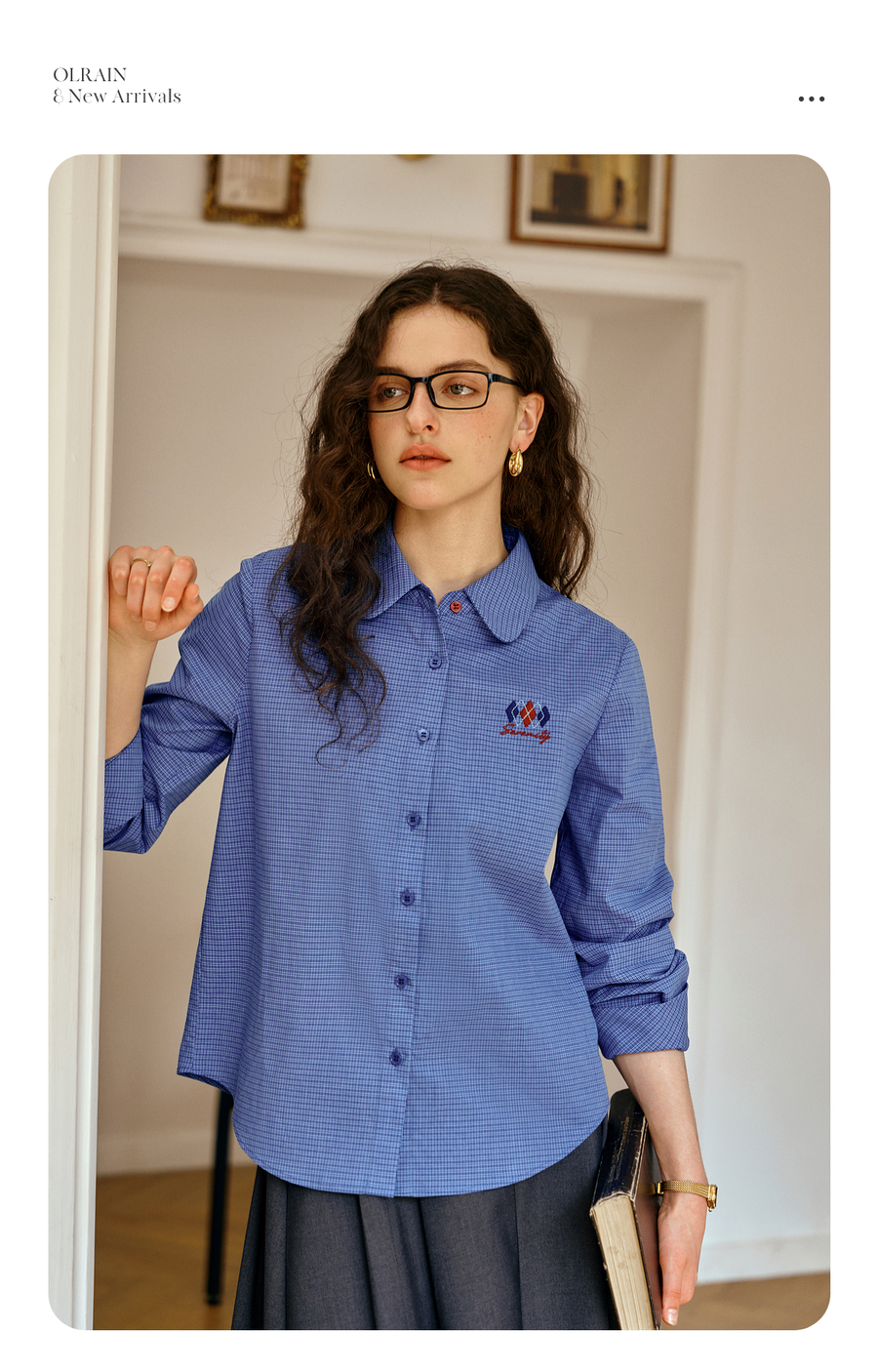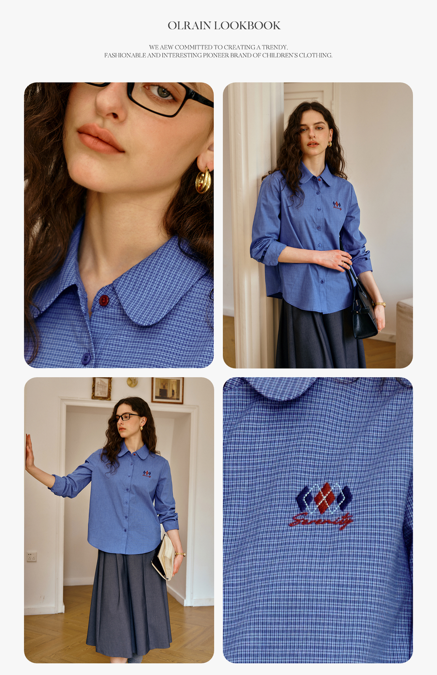 OLrain欧芮儿2025新款女秋季蓝色格子通勤设计感衬衫小众宽松上衣