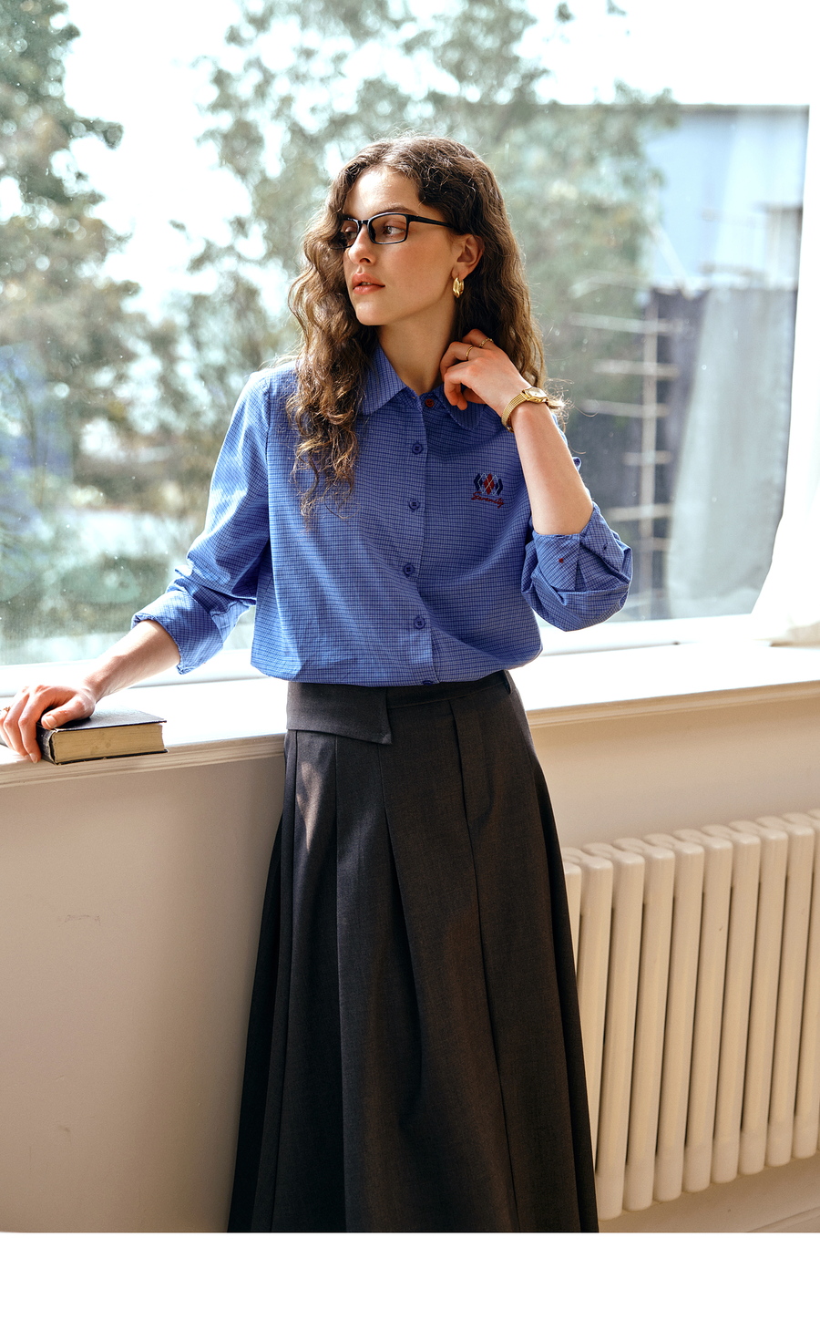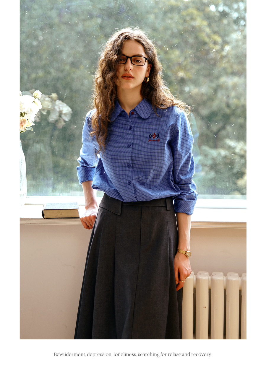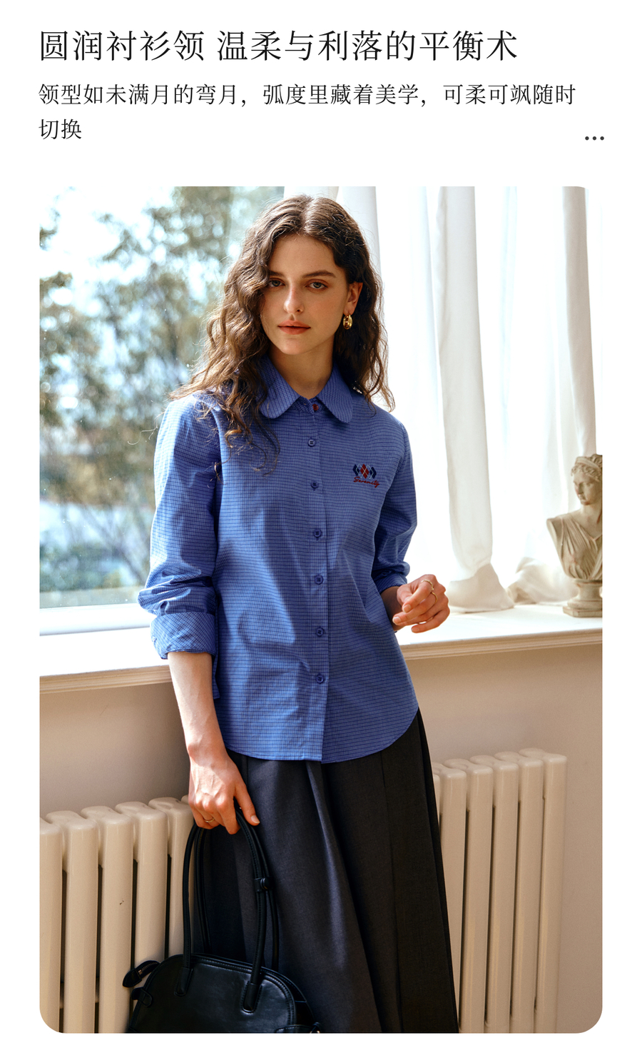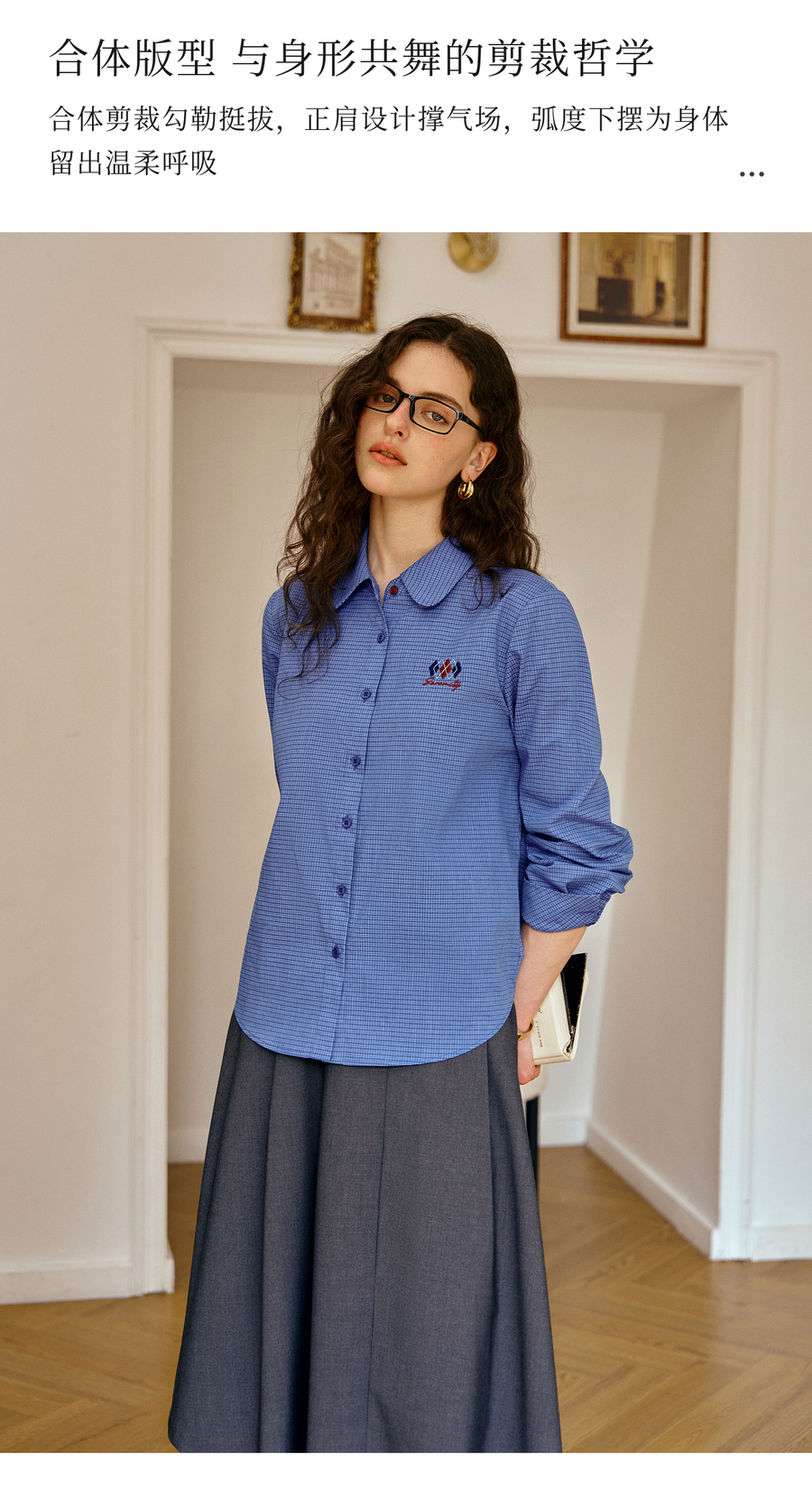 OLrain欧芮儿2025新款女秋季蓝色格子通勤设计感衬衫小众宽松上衣