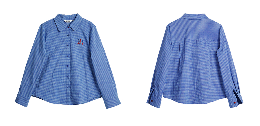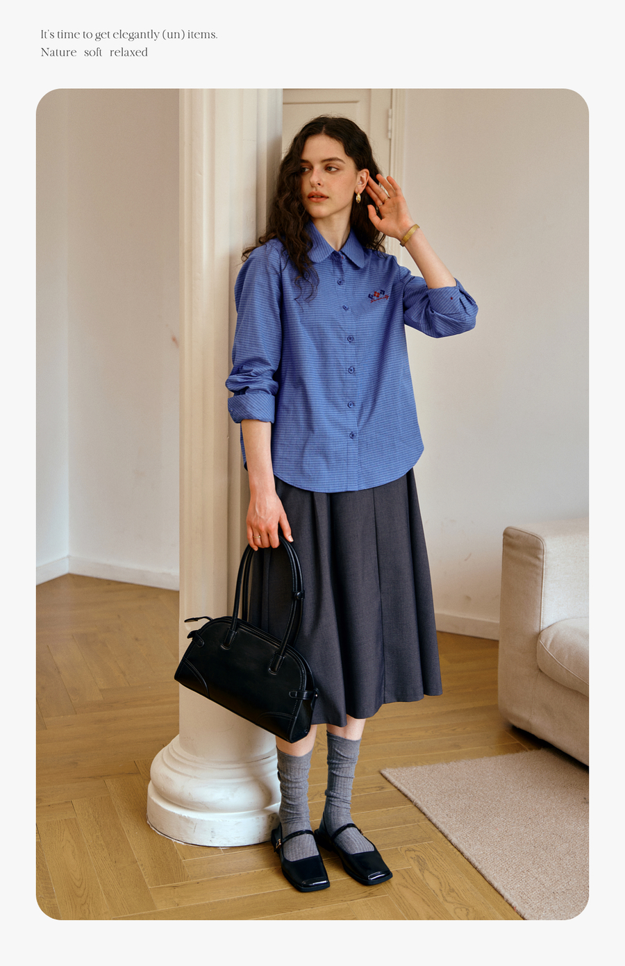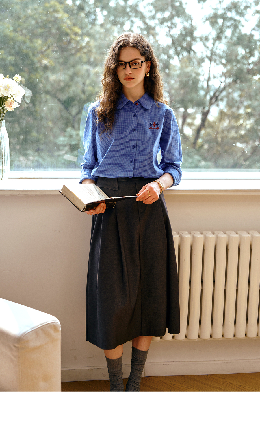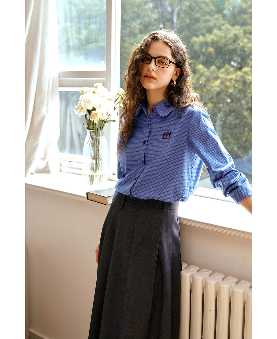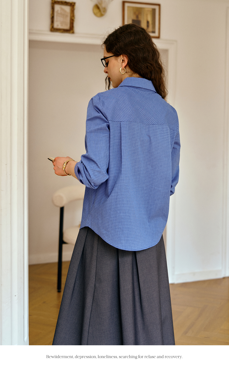 OLrain欧芮儿2025新款女秋季蓝色格子通勤设计感衬衫小众宽松上衣