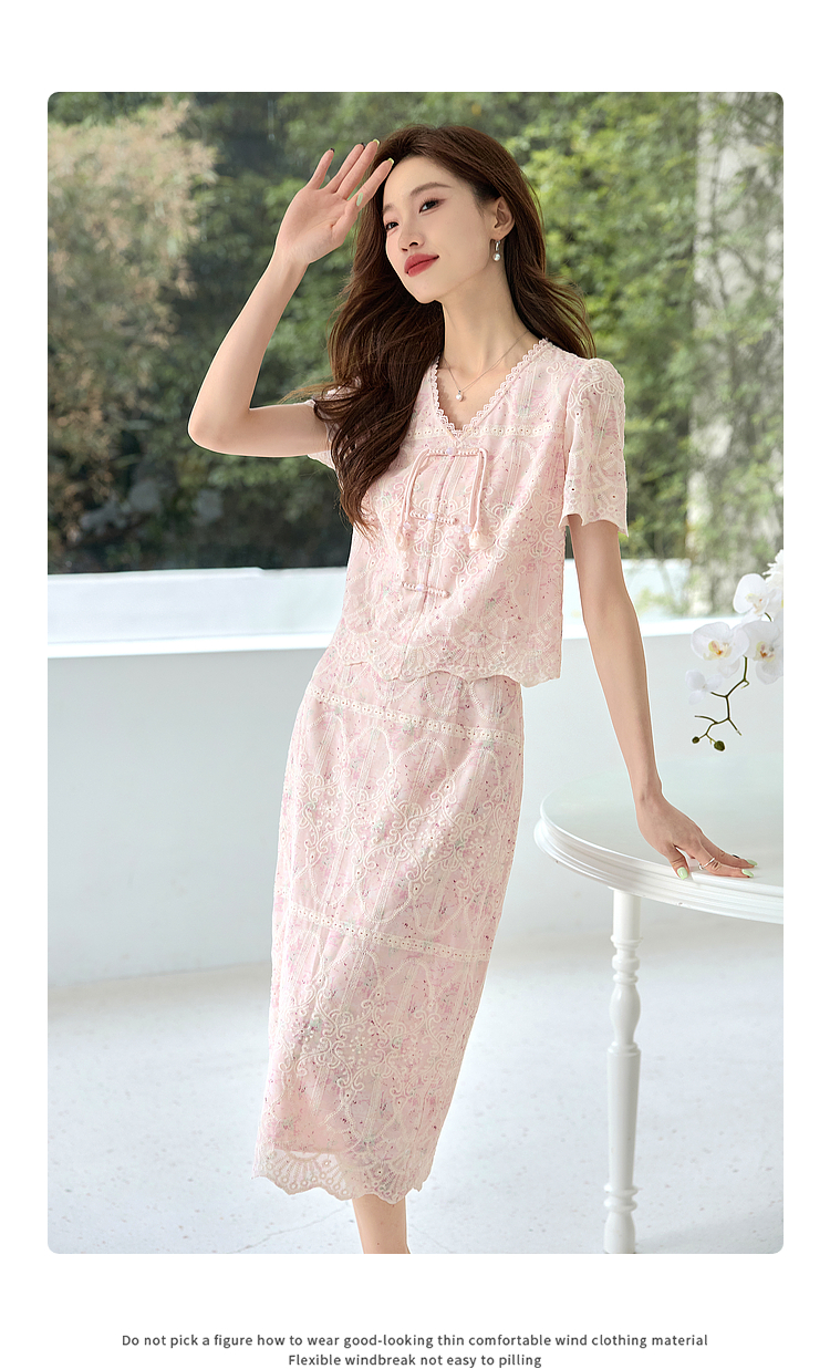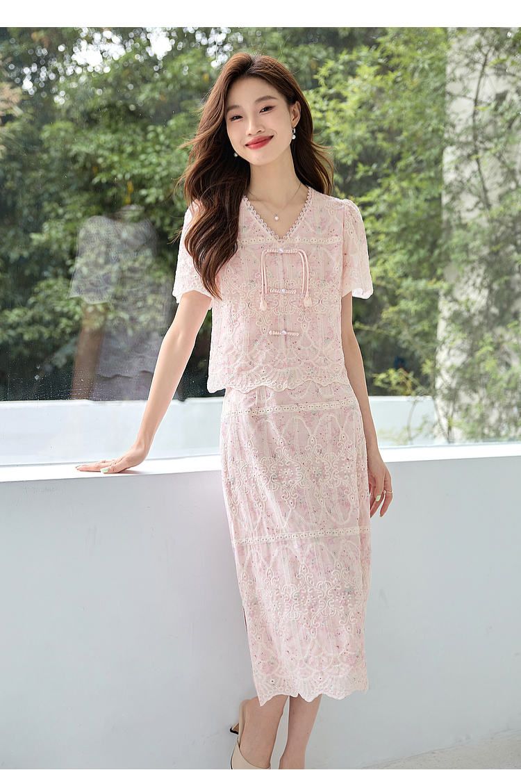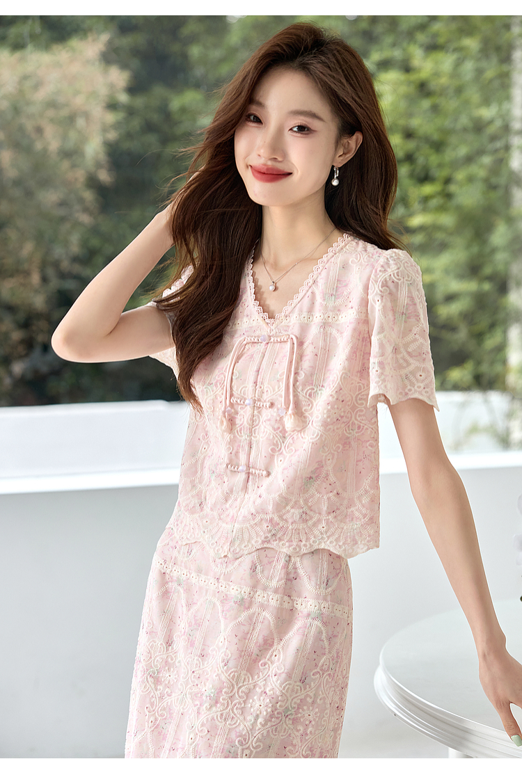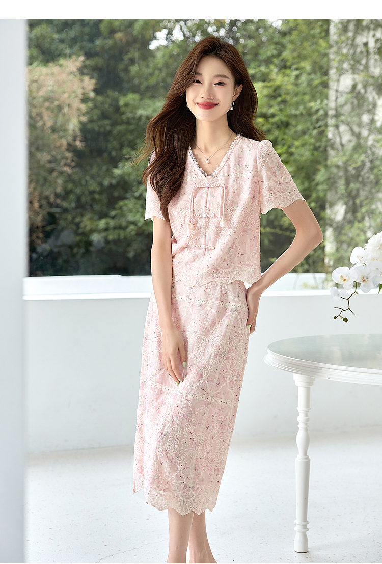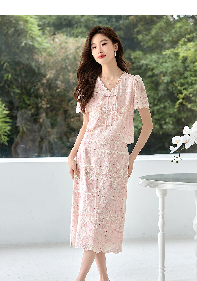 【专属特价】熙世界新中式国风套装裙夏季蕾丝花边刺绣盘扣上衣半身裙两件套