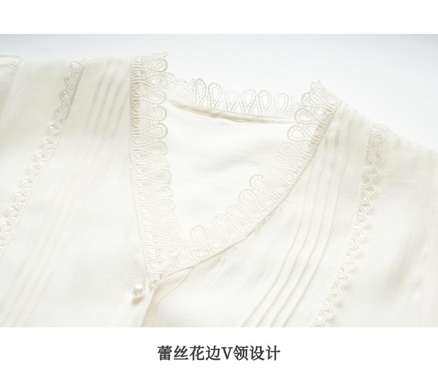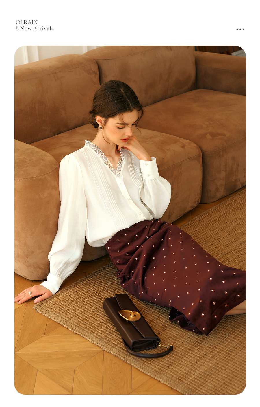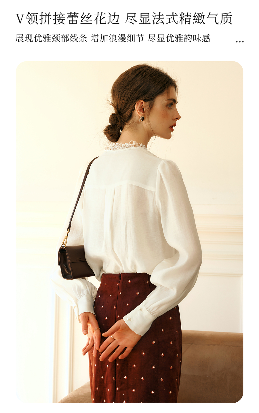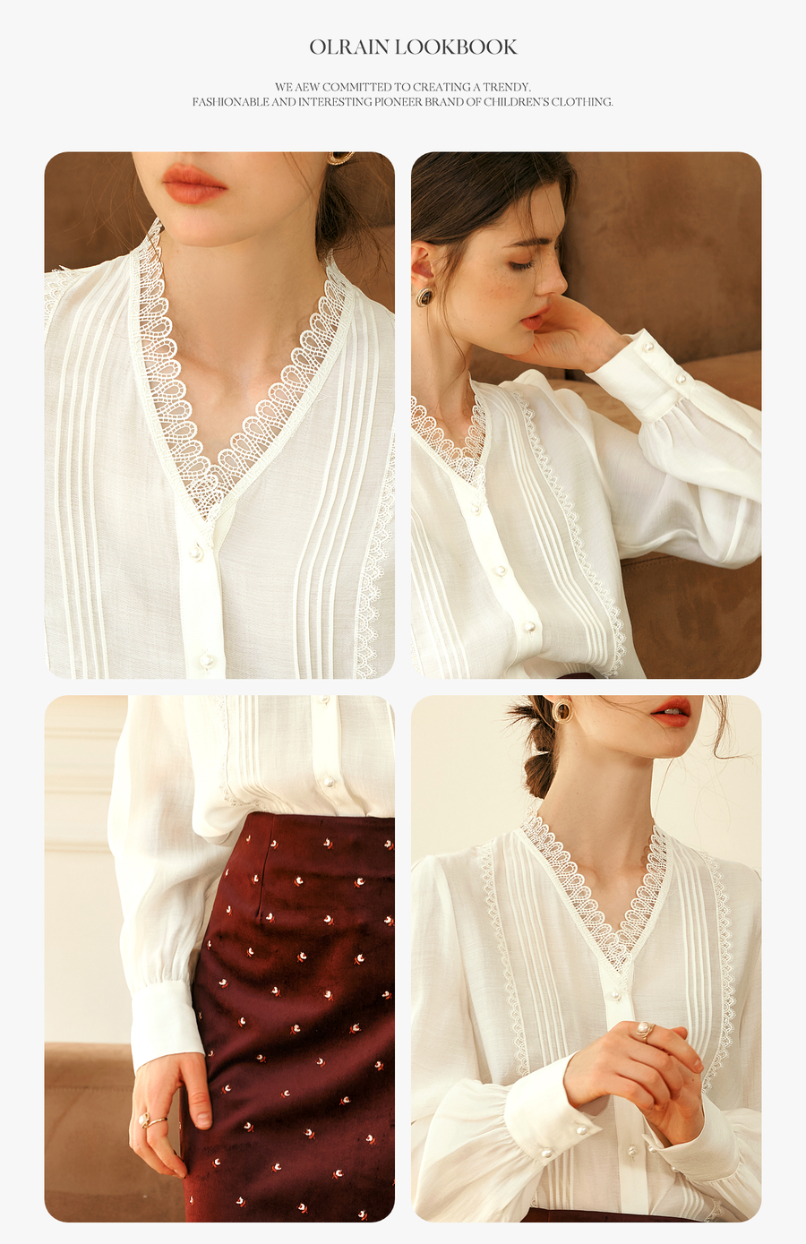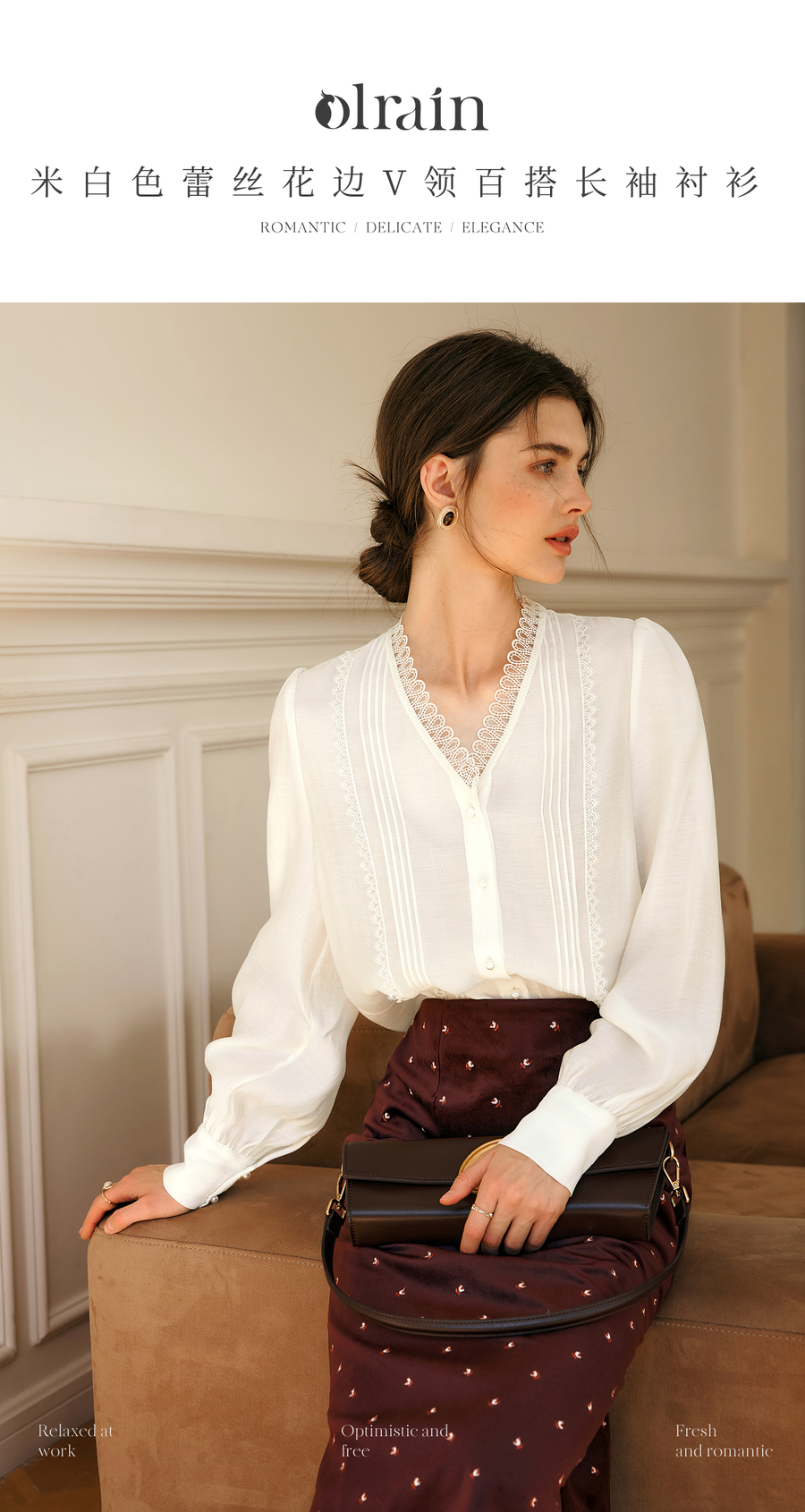 OLrain欧芮儿法式V领衬衫女春季2025年新款蕾丝花边百搭长袖衬衣