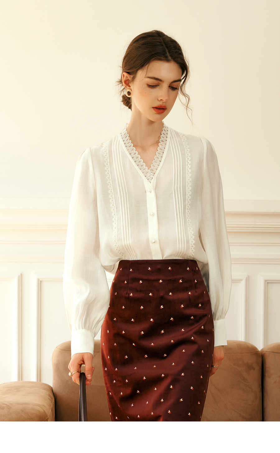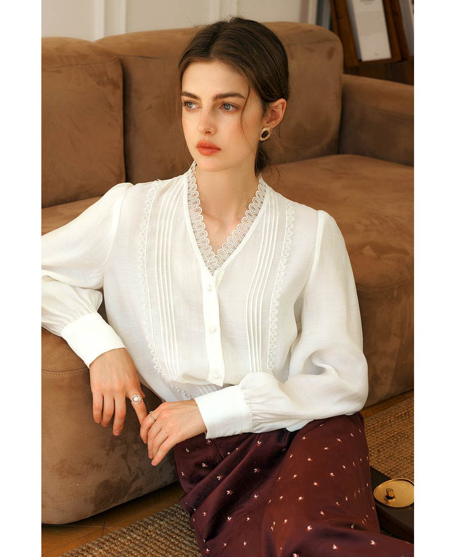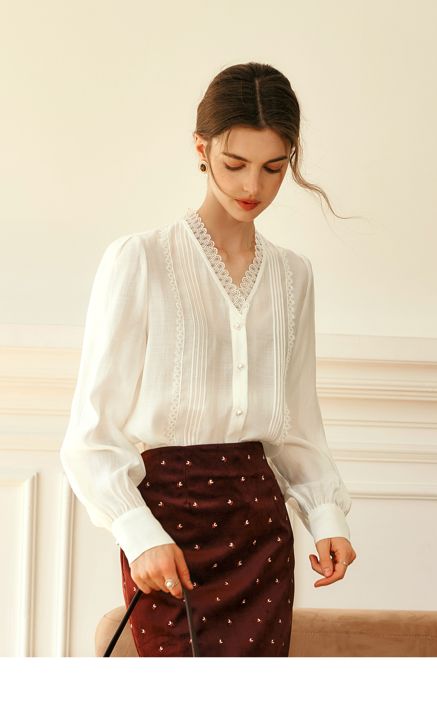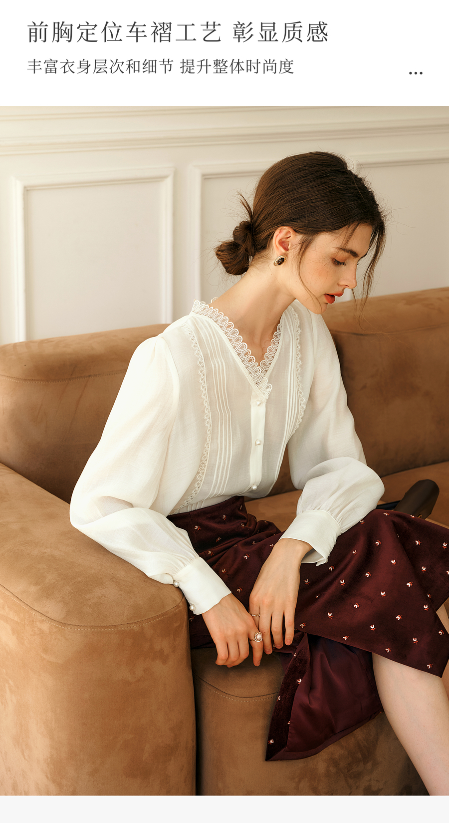 OLrain欧芮儿法式V领衬衫女春季2025年新款蕾丝花边百搭长袖衬衣