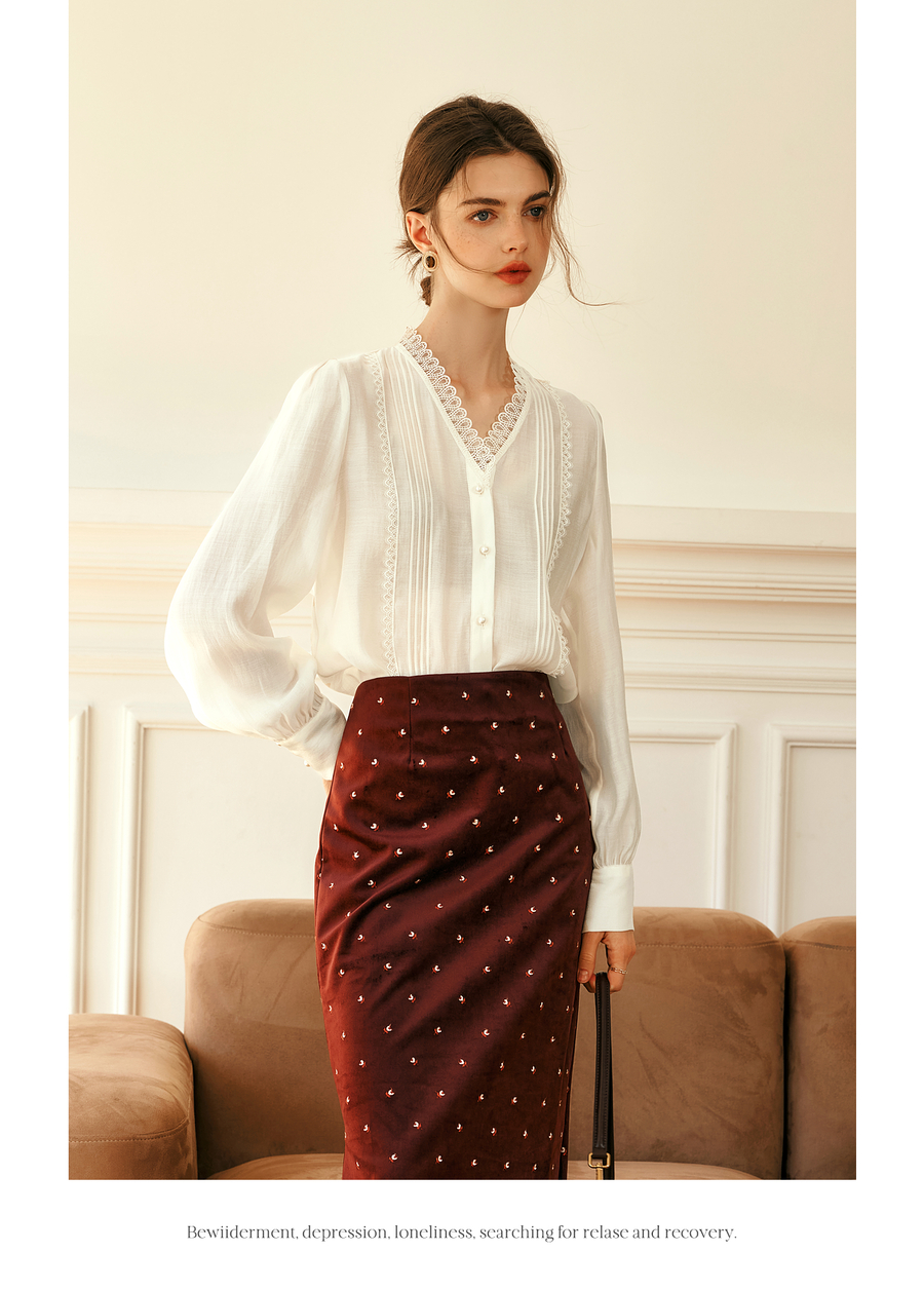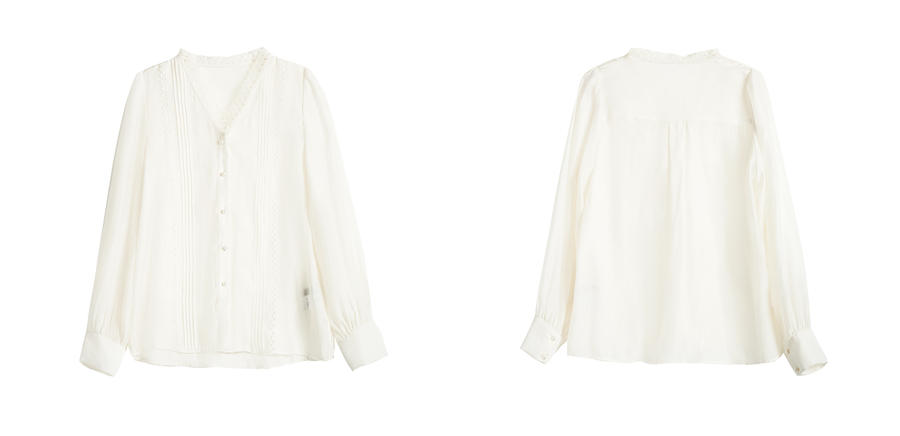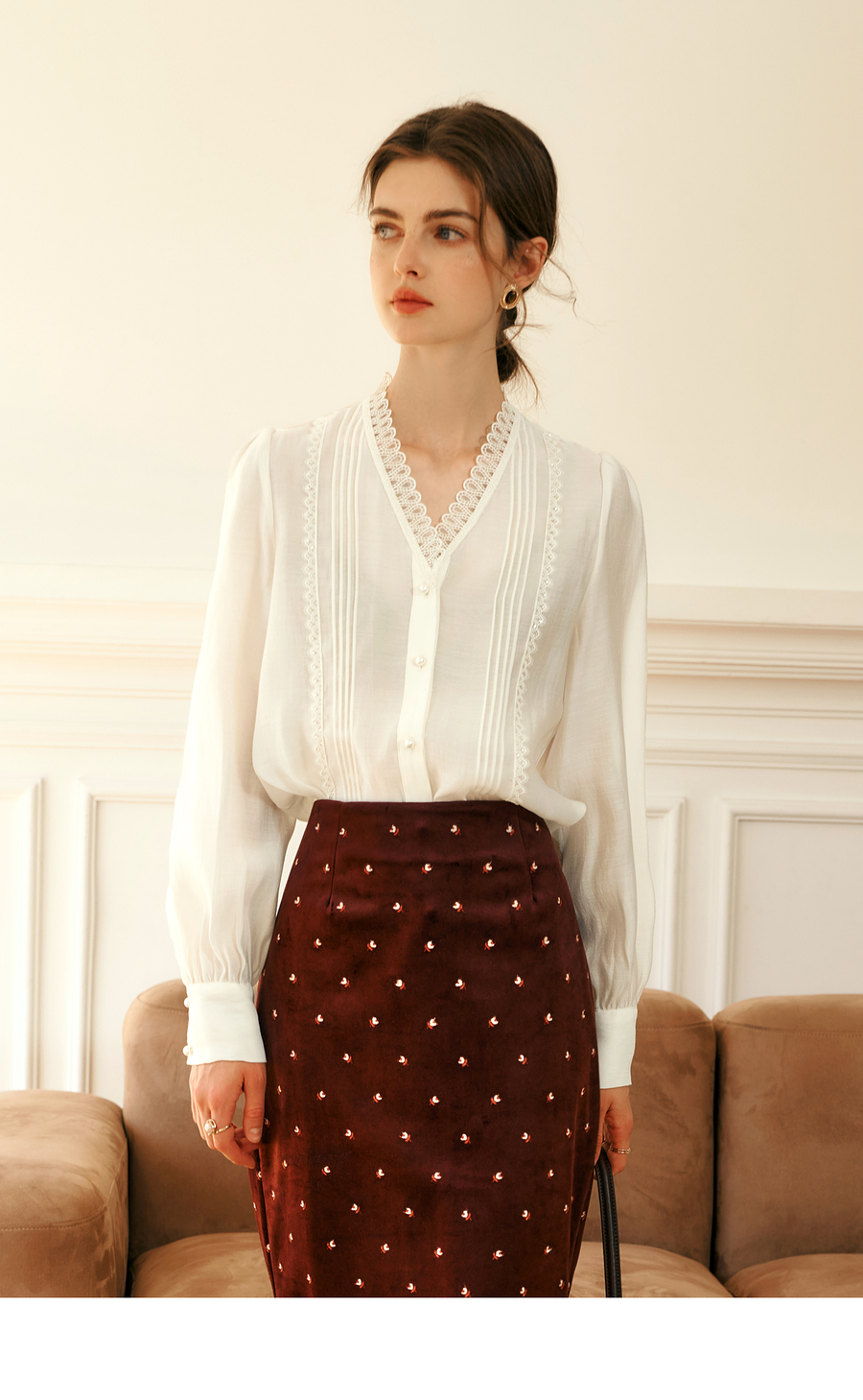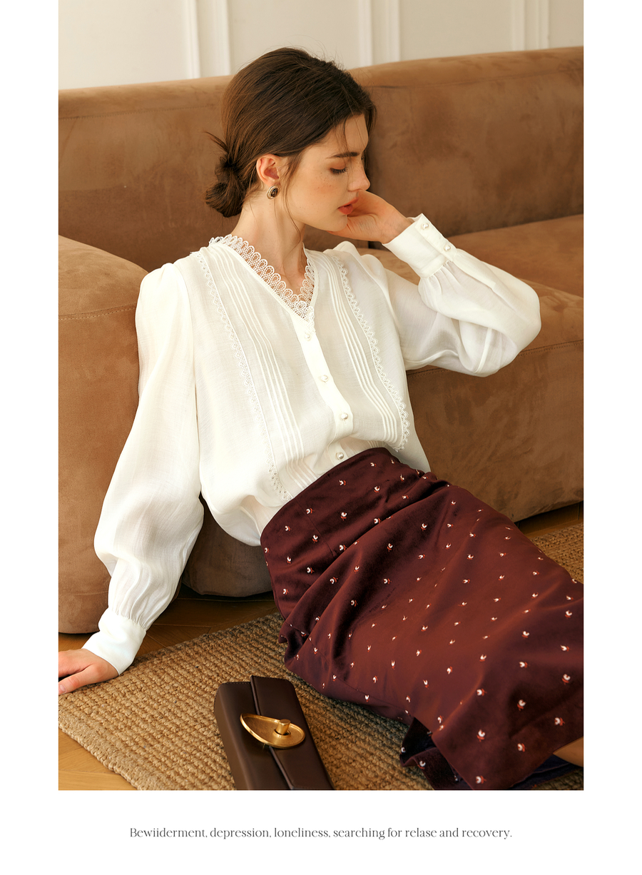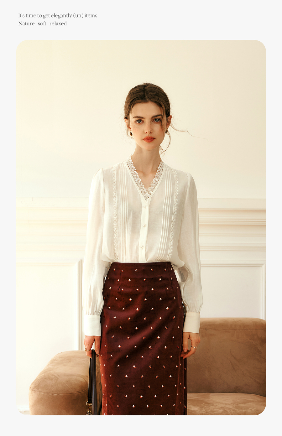 OLrain欧芮儿法式V领衬衫女春季2025年新款蕾丝花边百搭长袖衬衣