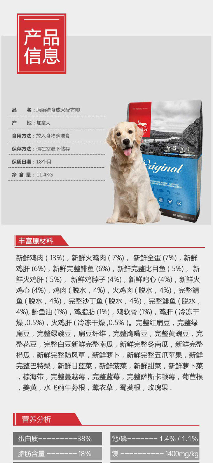 【保税仓】加拿大渴望原始猎食原味无谷成犬配方粮 11.4 kg