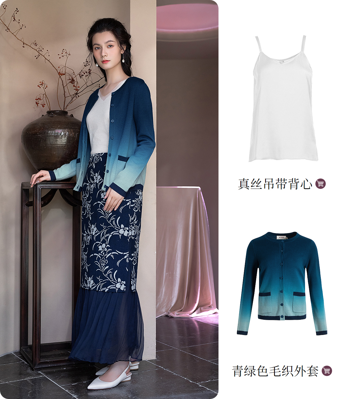 【林栖设计小店】杜鹃花纯棉半身裙蓝印花布拼真丝优雅显瘦2024秋冬新品裙子女1944044