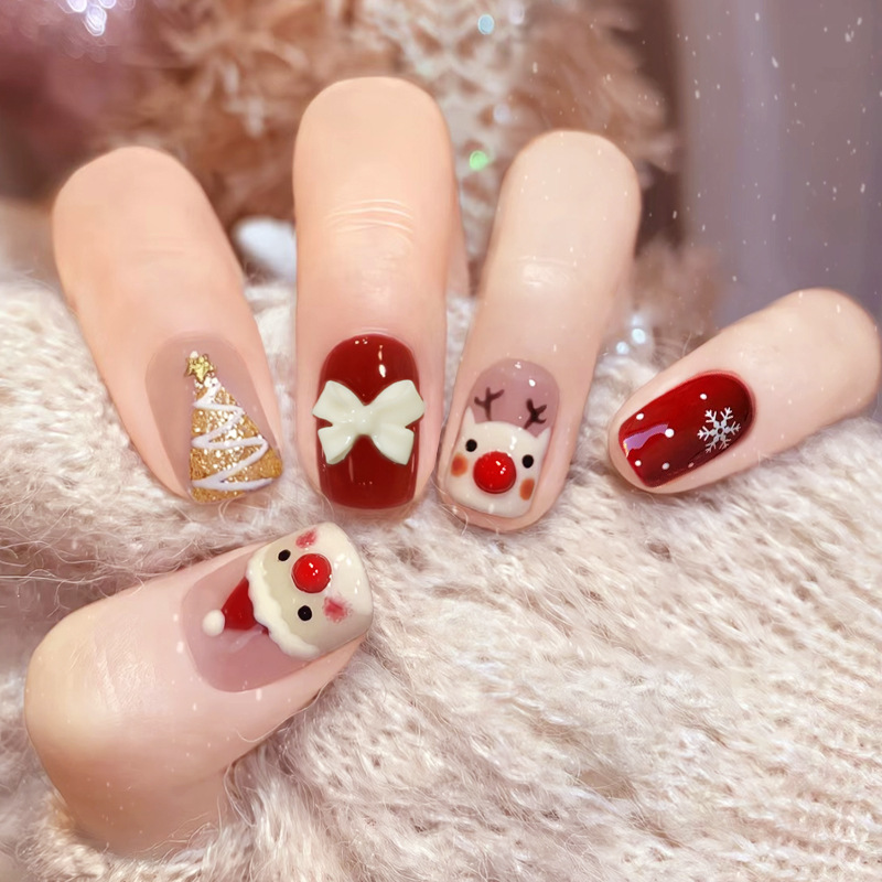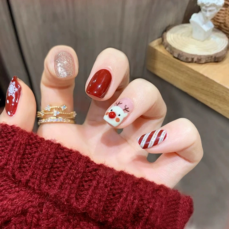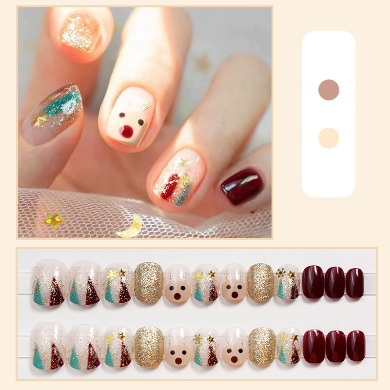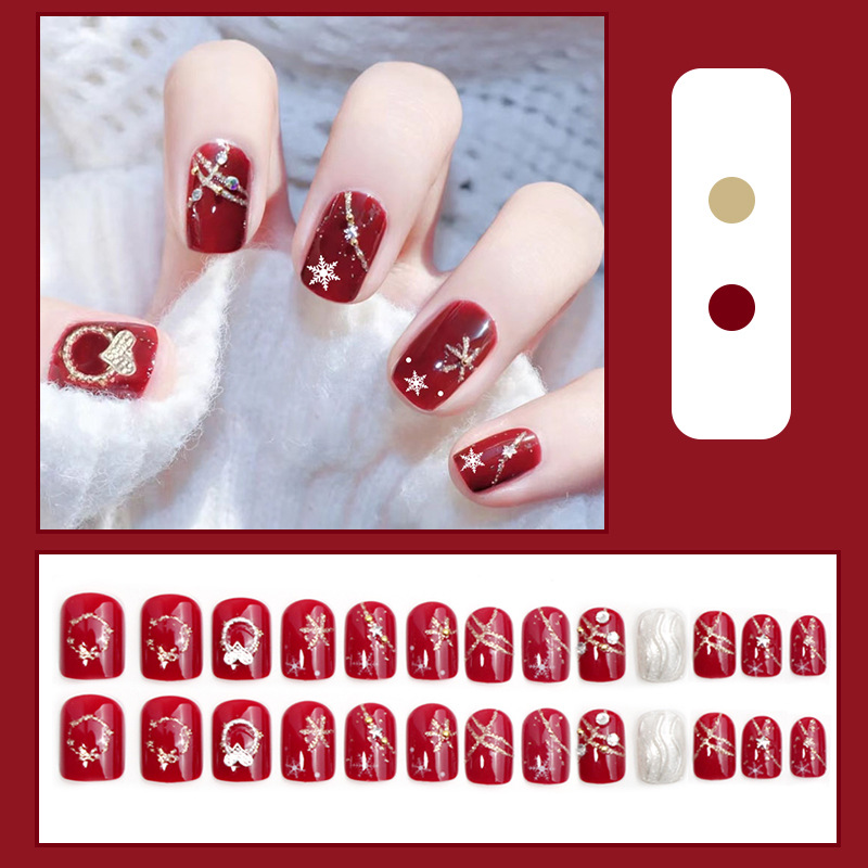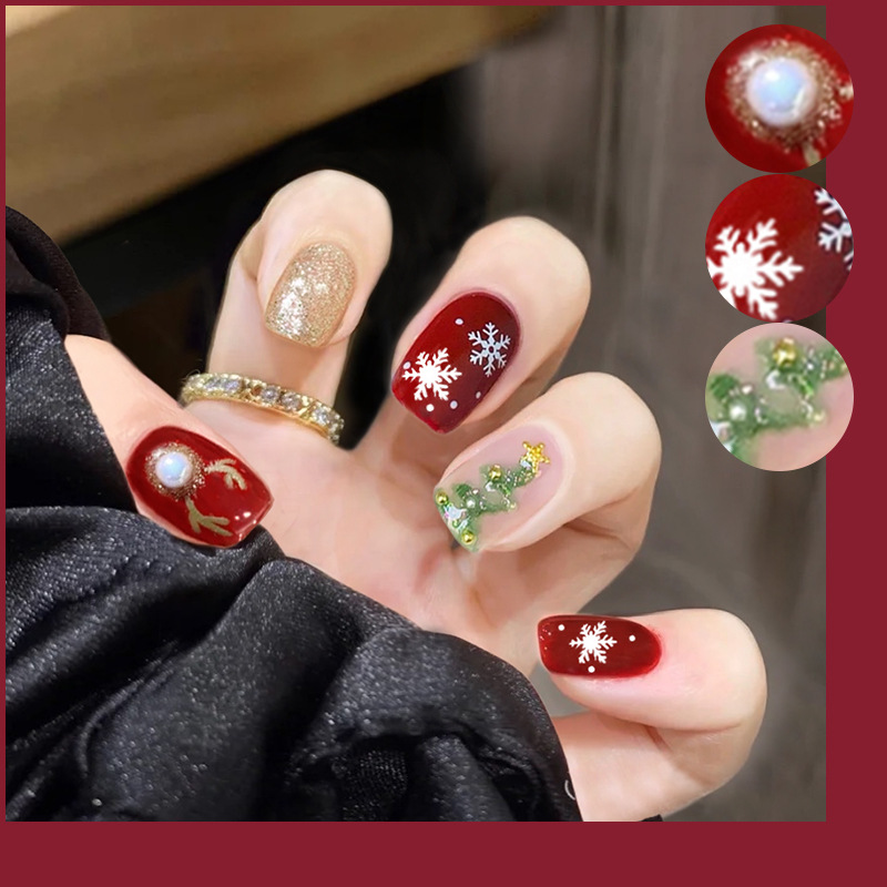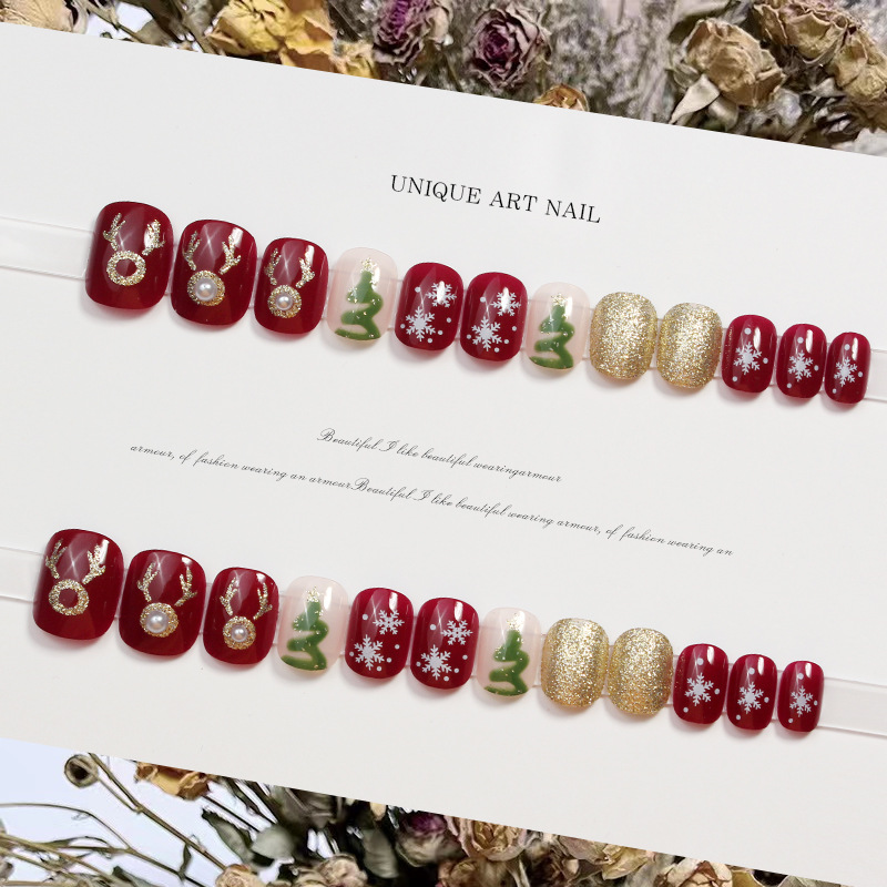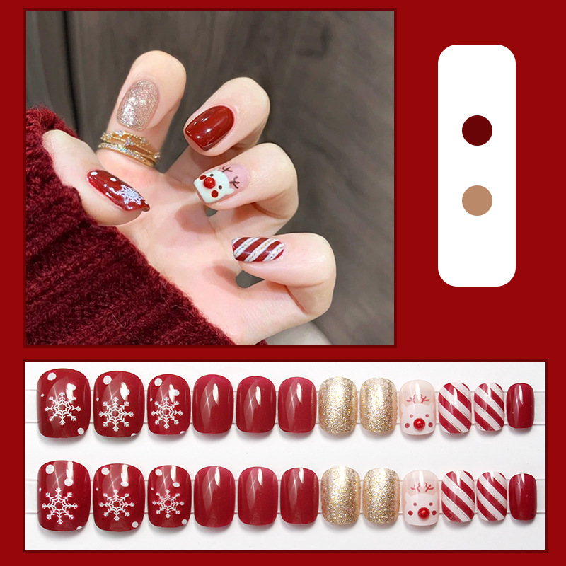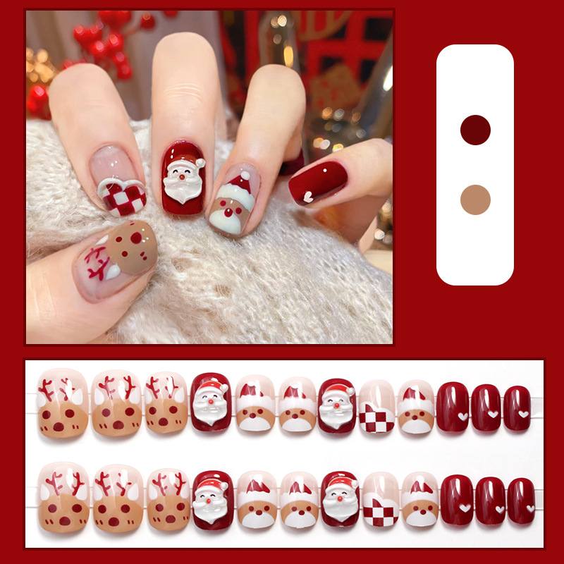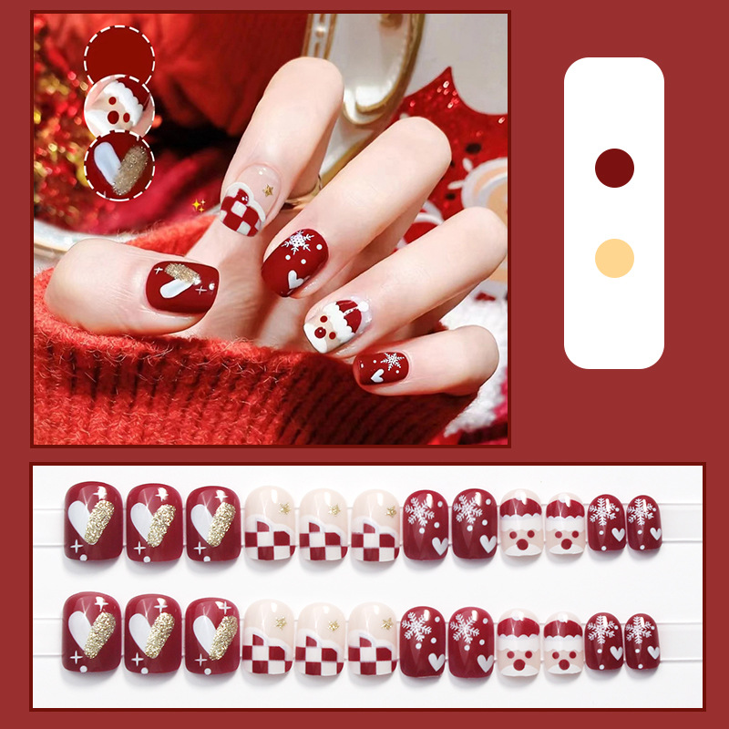 【指尖变身护甲板!新年玩出时尚感。】D269新款穿戴甲美甲甲片圣诞棋盘格可拆卸指甲贴片防水短款女。ry