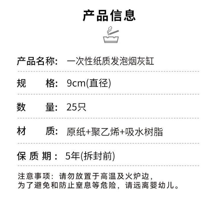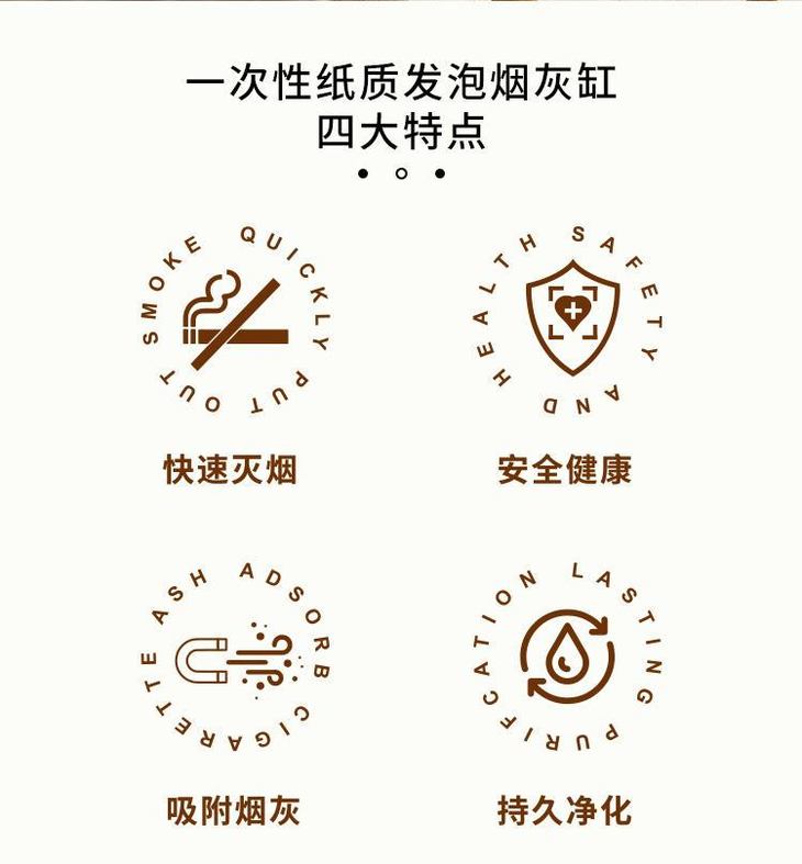 它的一次性设计,用完直接扔掉,干净方便,解决了清理烟灰的烦恼。 大大改善传统烟灰缸对室内空气造成的二次伤害 盒装设计方便携带,而且用完无需处理,整体扔掉即可 环保又节约,适用场景广,值得推荐❗