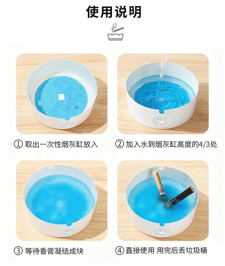 👏而这款产品的使用流程简化到极致: 1. 取出:从包装中取出一次性烟灰缸 2. 倒水:加入水到烟灰缸高度的4/3处 3. 发泡:等待香膏凝结成块