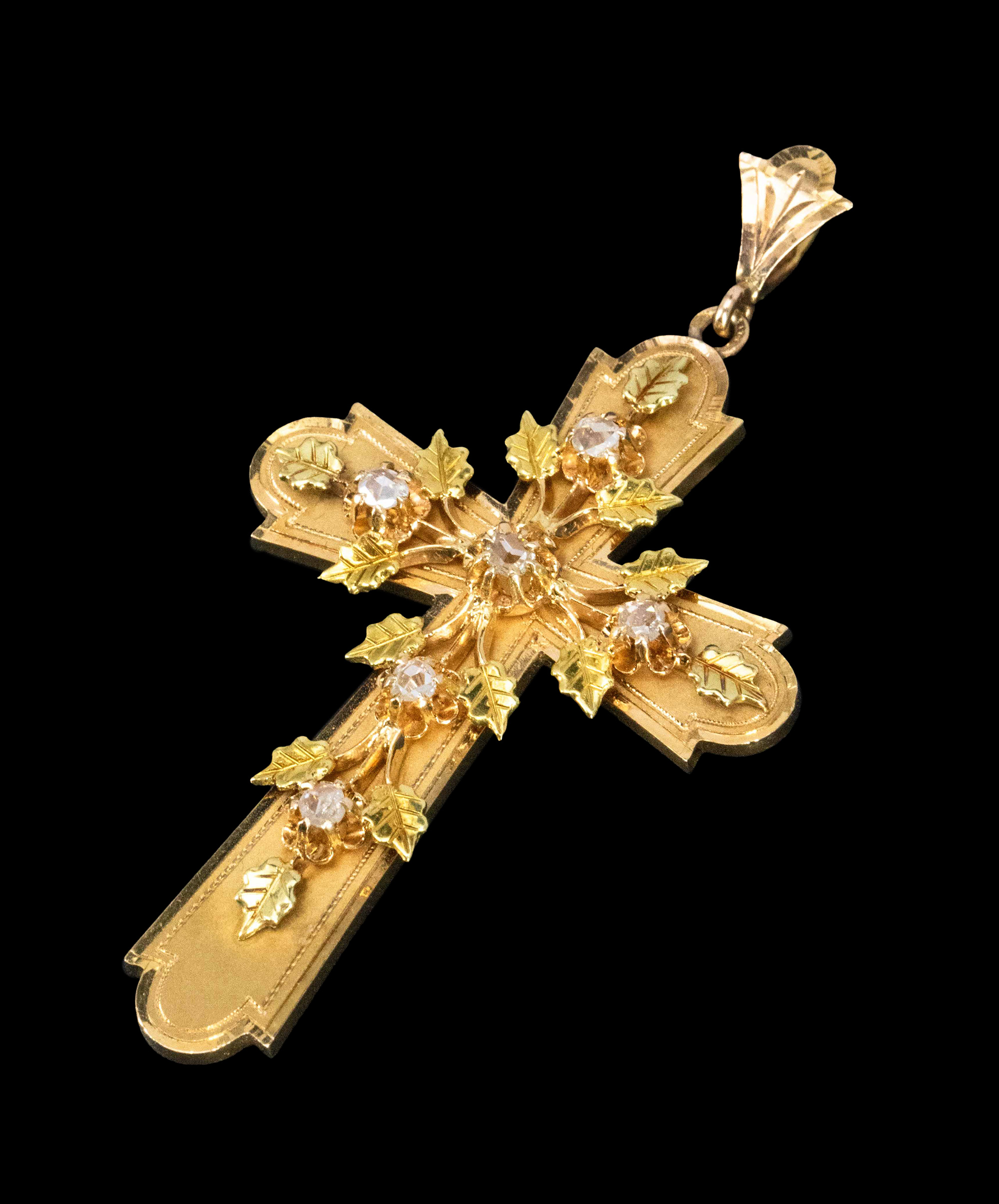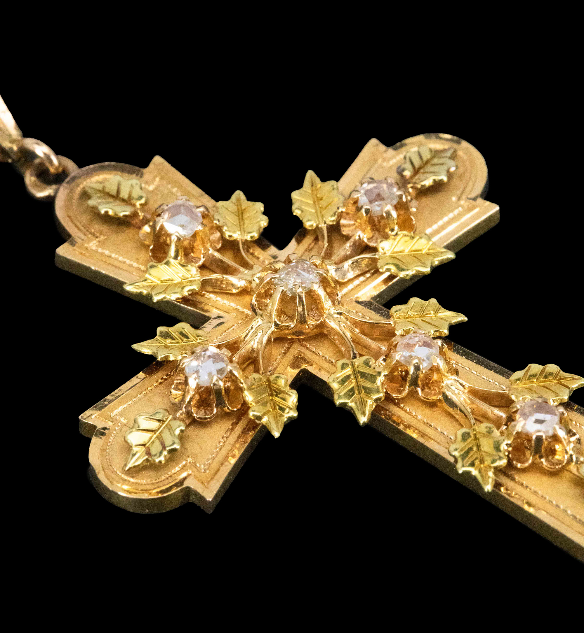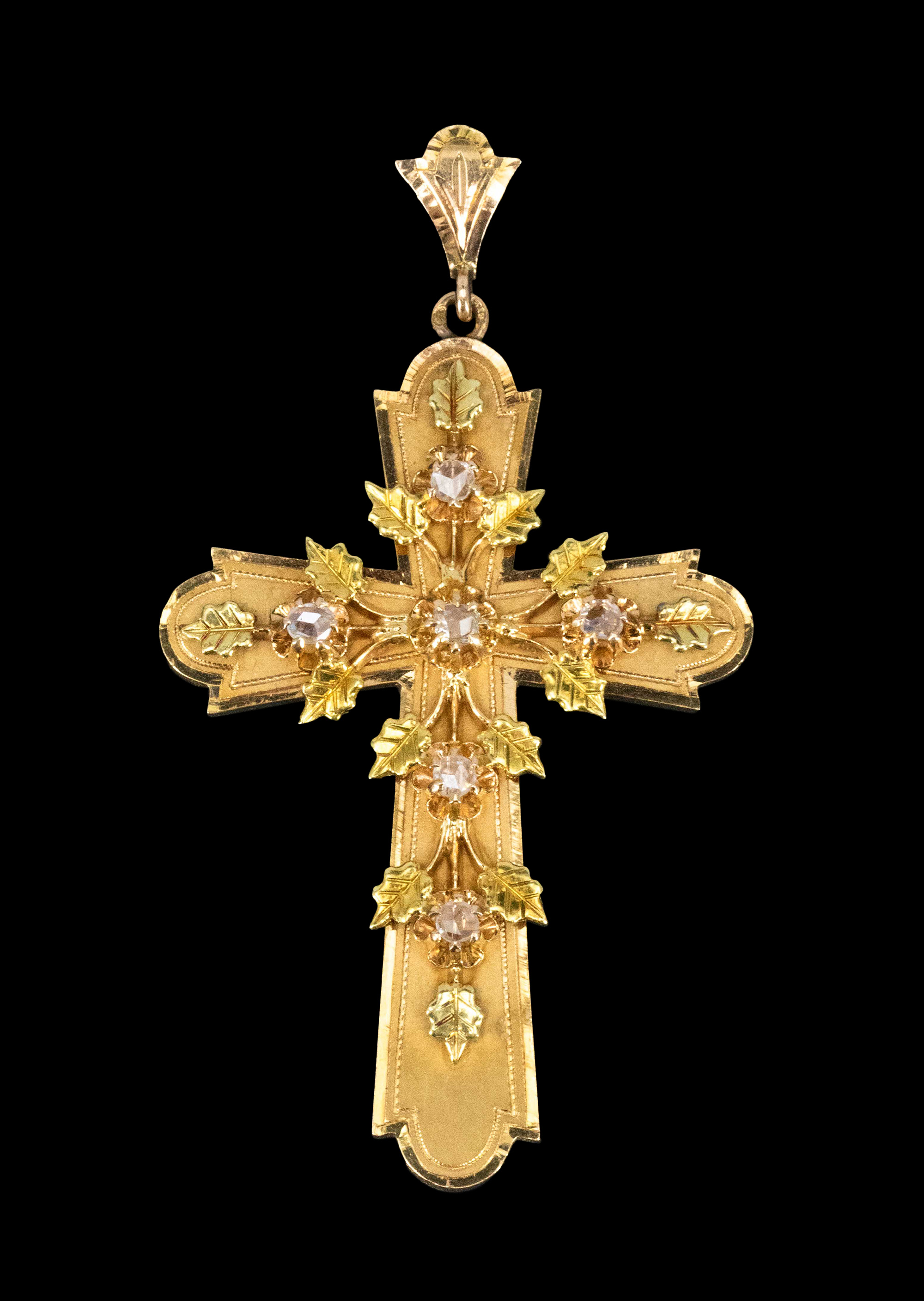 1850-1870年代法国拿破仑三世时期出品叶蔓主题18K黄金及玫瑰金精雕镶嵌钻石十字架造型吊坠