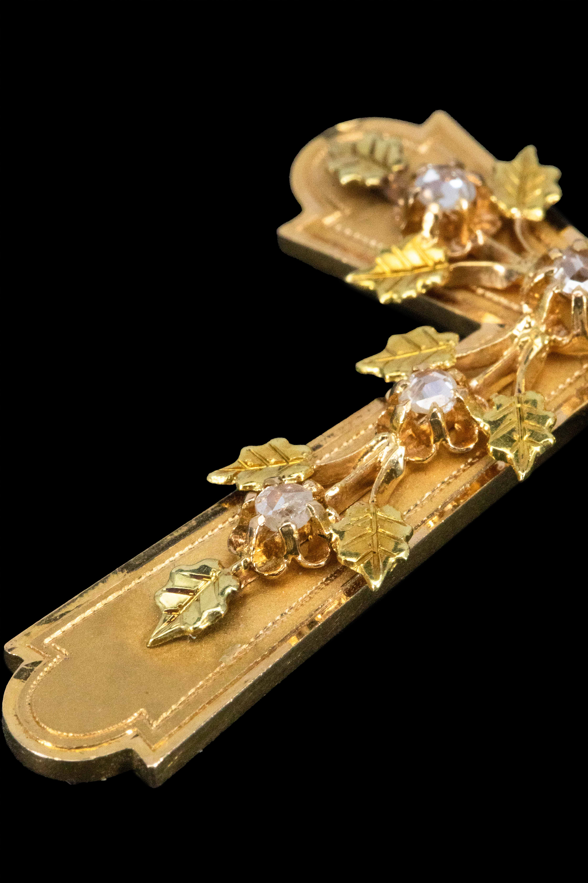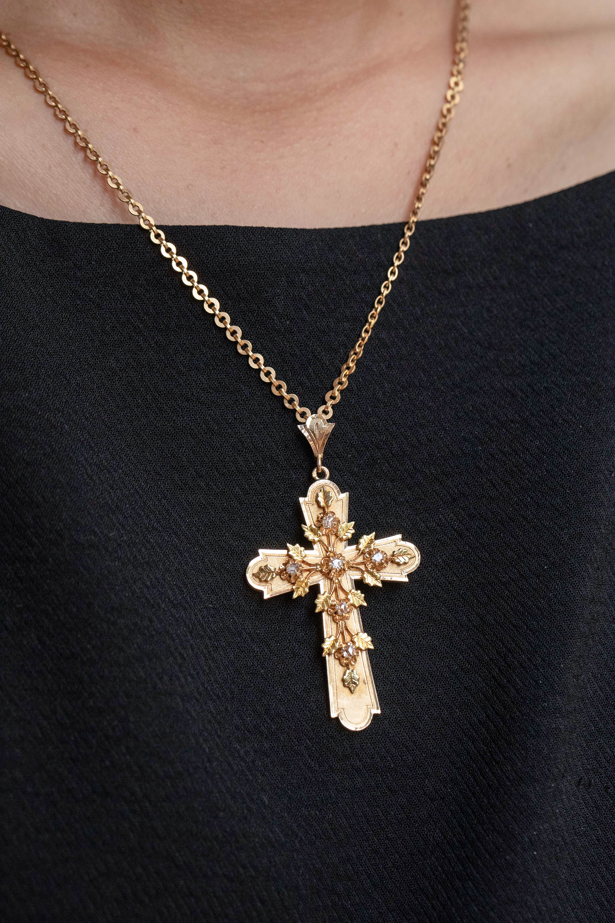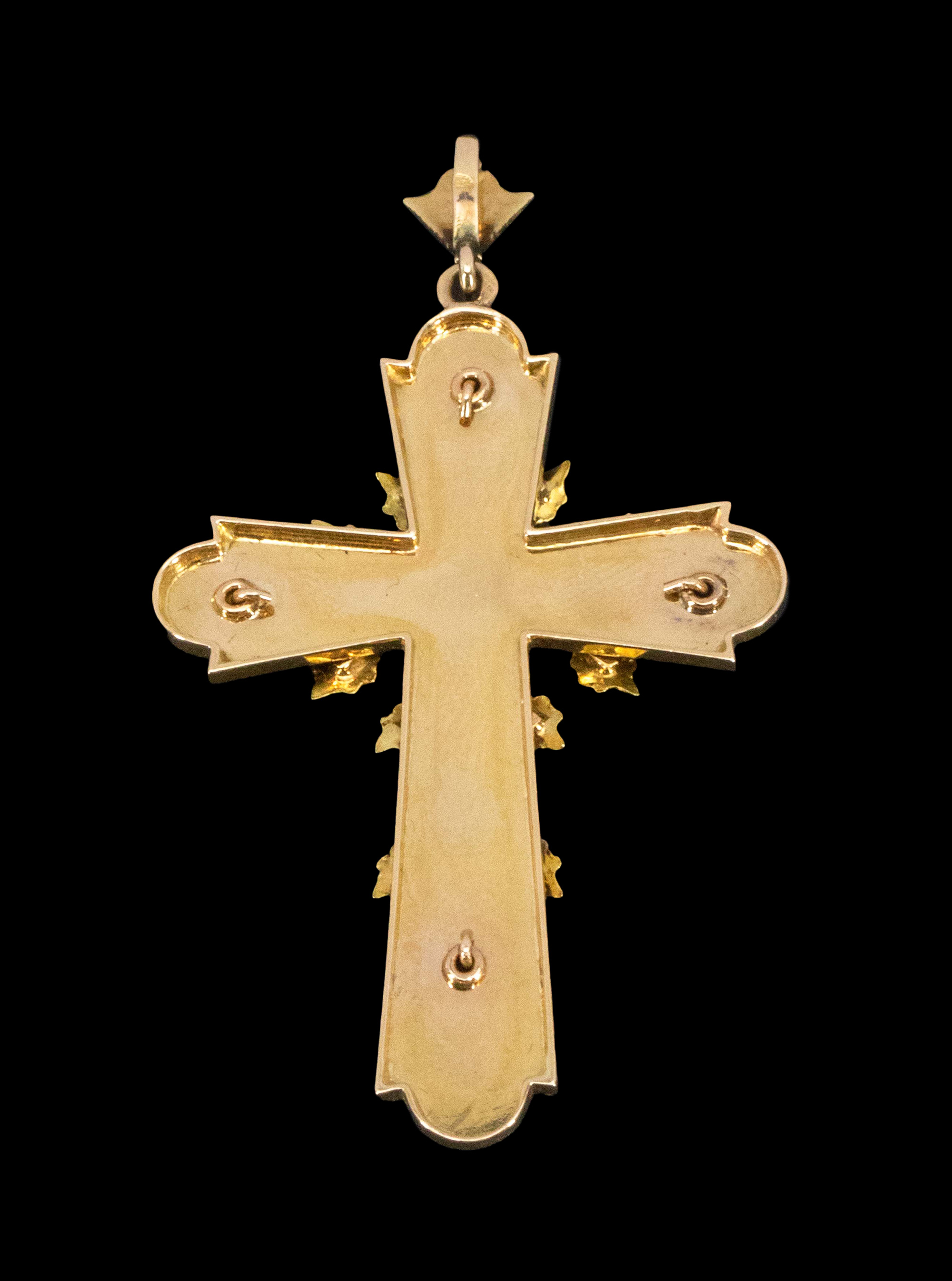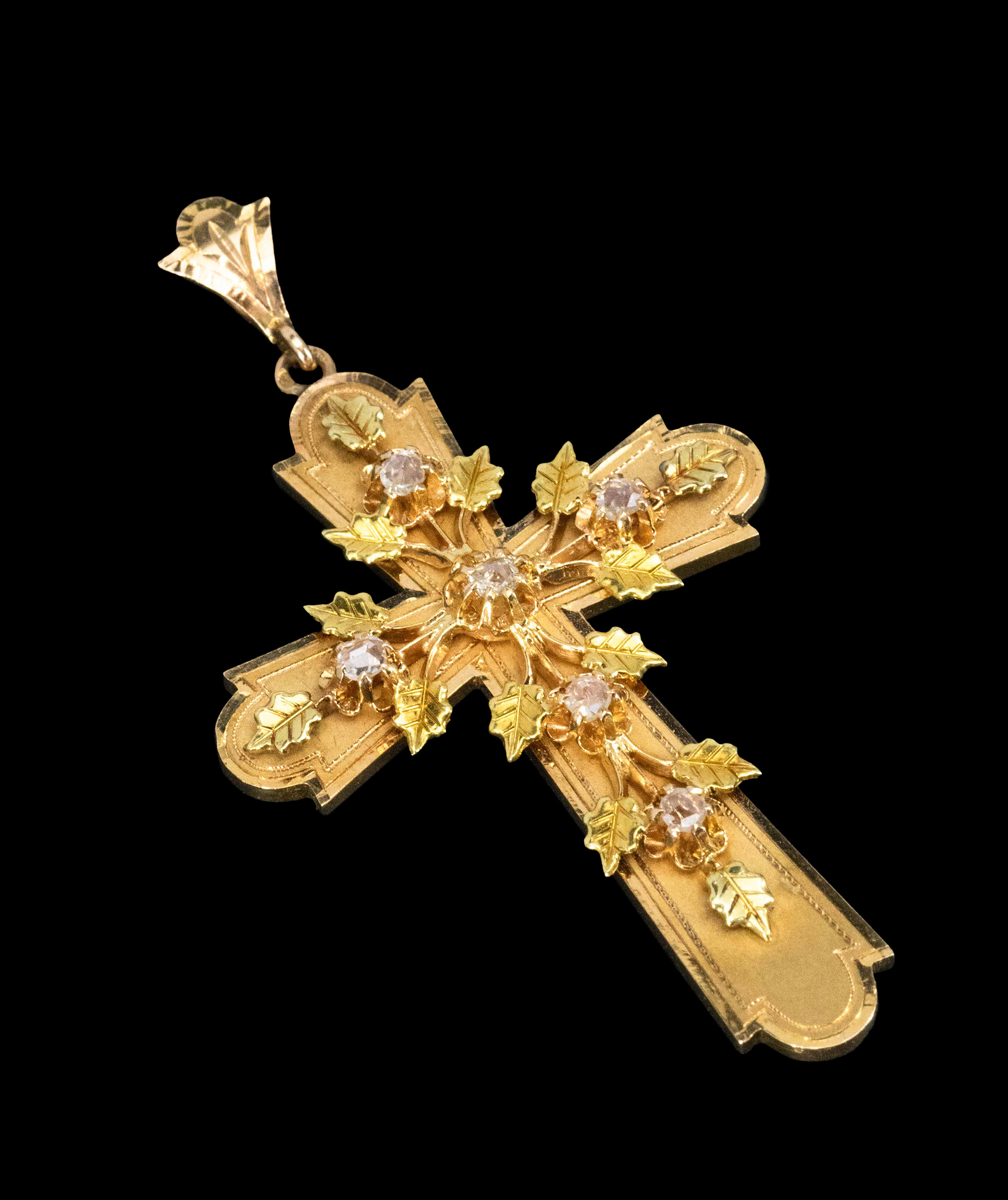 1850-1870年代法国拿破仑三世时期出品叶蔓主题18K黄金及玫瑰金精雕镶嵌钻石十字架造型吊坠