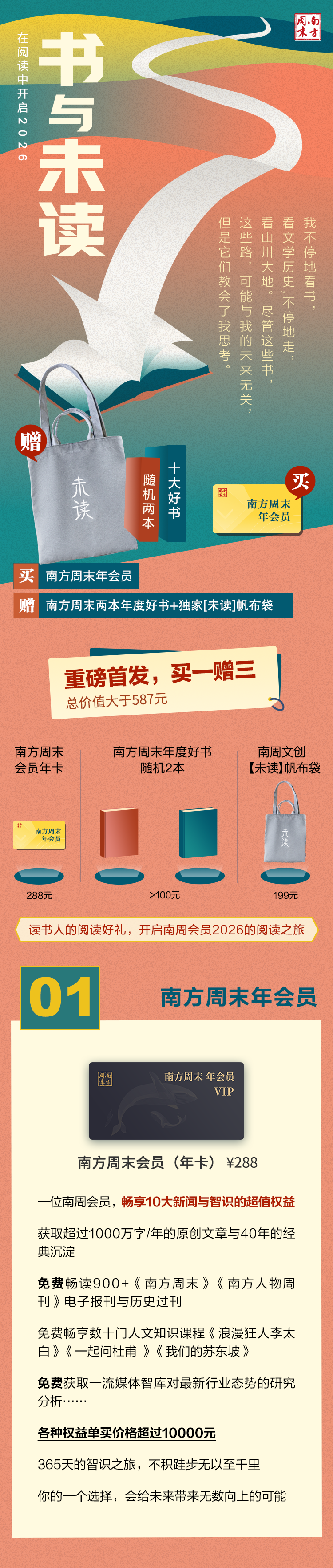 必看:图书礼盒由南方周末2025年十大好书中的随机2本构成,我们将在10本好书中随机挑选2本总价值超过100元的书(1本虚构类+1本非虚构类)为你寄出,不接受指定图书。