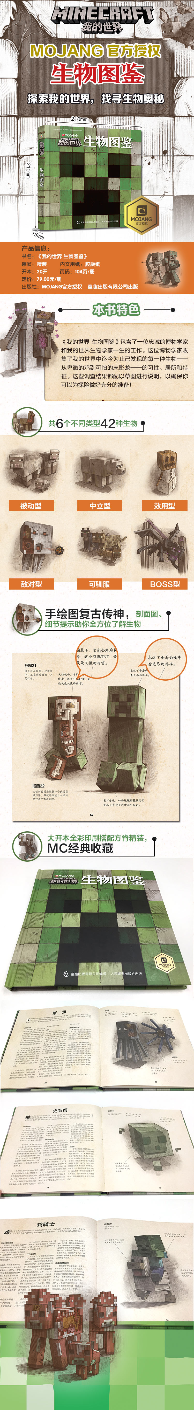 《我的世界 生物图鉴》是由艾格萌官方授权的游戏图鉴。书中包含了一位博物学家同时也是我的世界生物专家的记录,他通过手绘图搭配文字描述的方式介绍了四十多种我的世界中的生物的习惯、栖息地和特征等。这本书让你充分了解游戏中将要面对的生物,为探险做好准备。