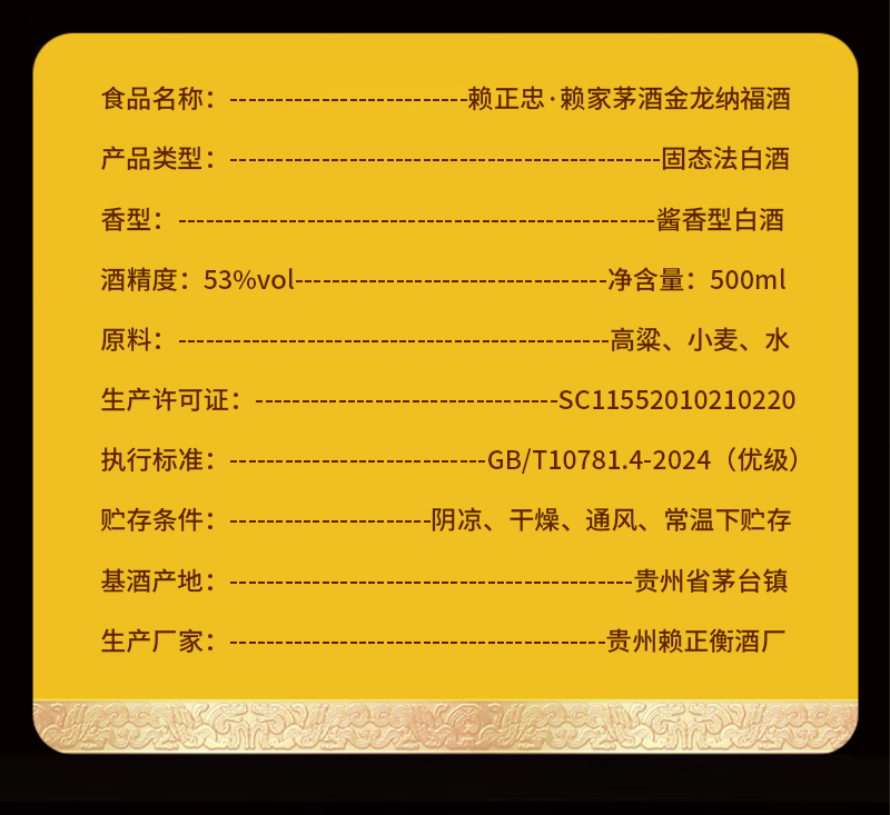 致敬酒业 赖正忠·赖家茅酒金龙纳福酒 500ml*瓶 品味高雅 传承悠久 传统工艺发酵 手工古法酿造