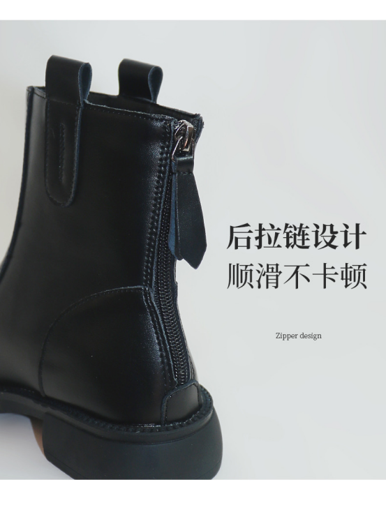 后跟拉链设计,方便一脚蹬轻松进脚,包裹小腿的同时,还有良好的穿脱体验!