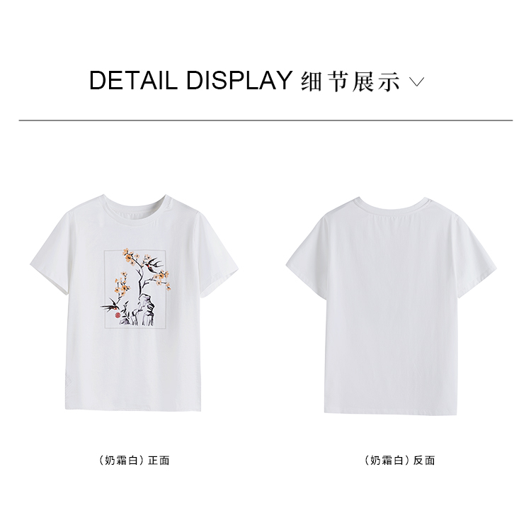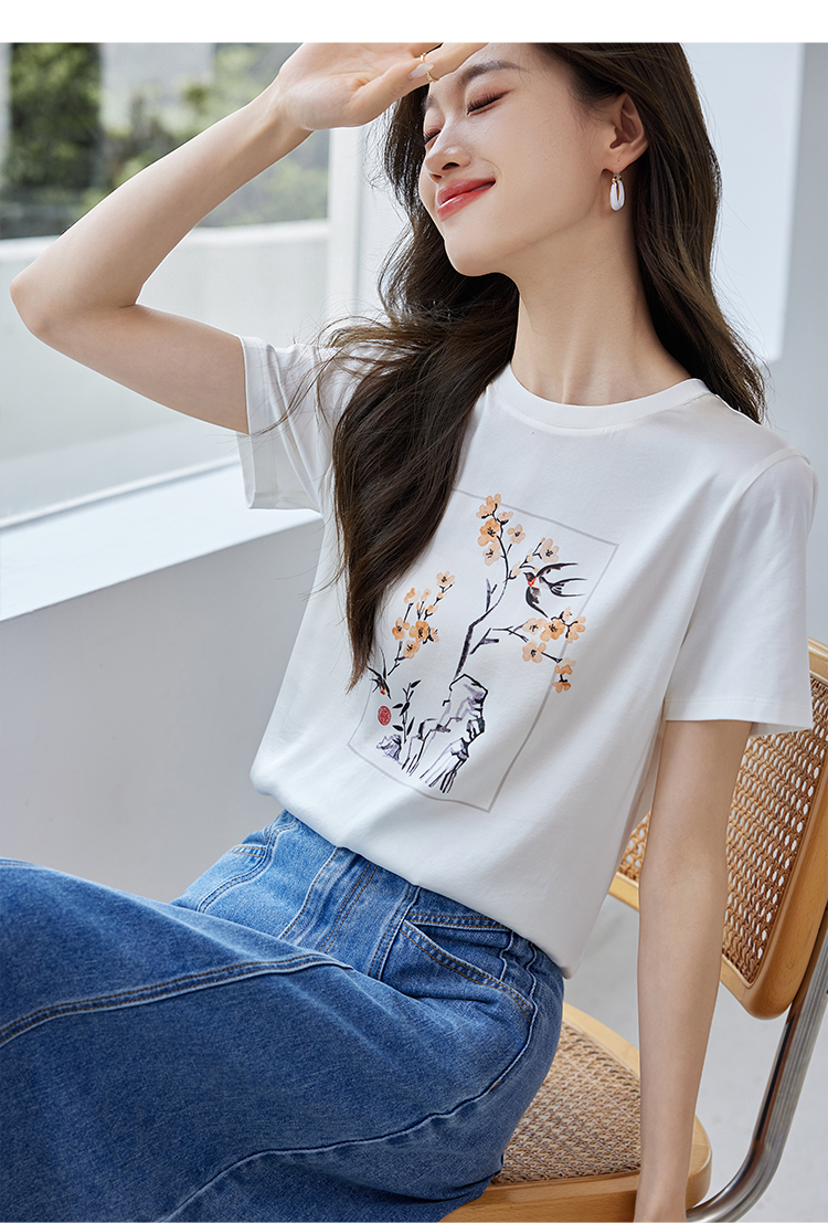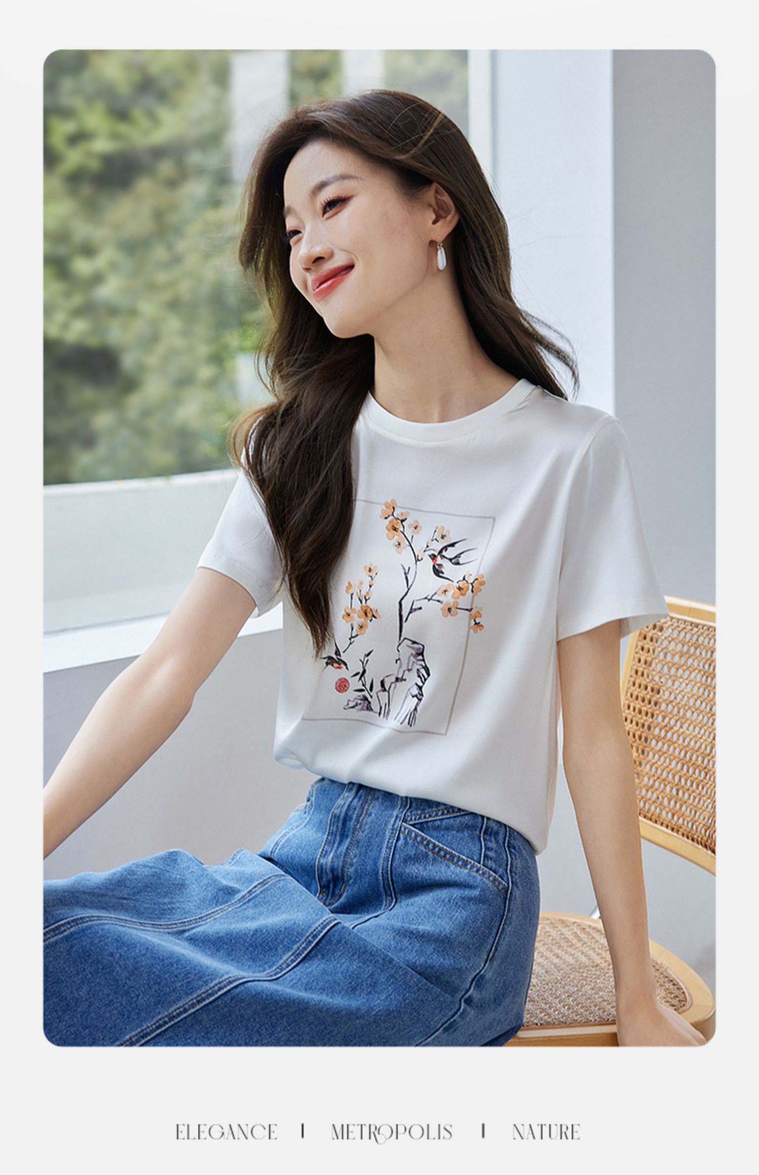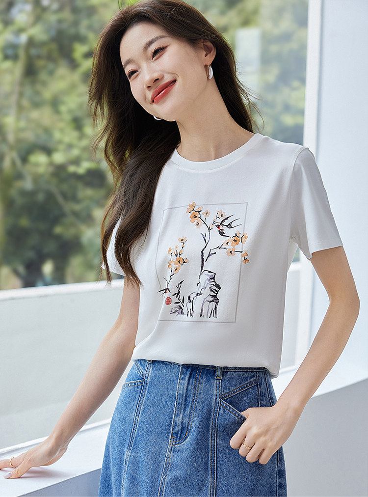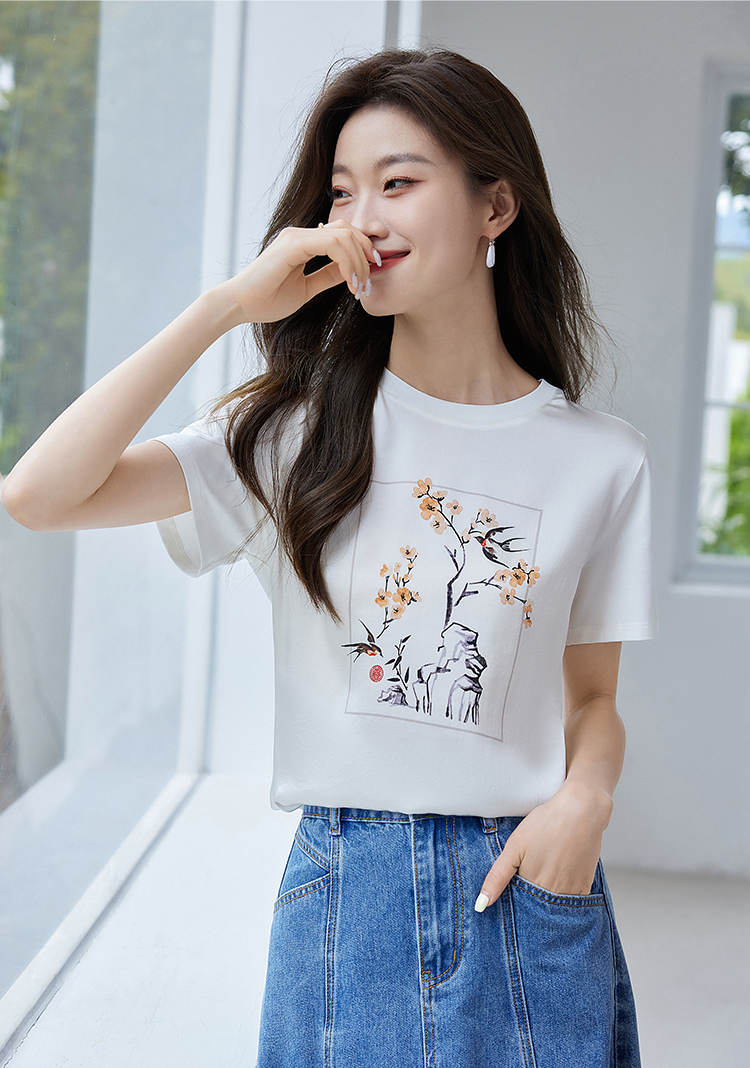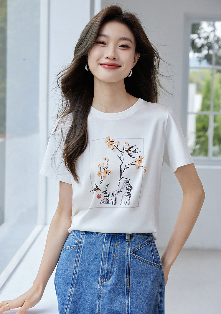 【专属特价】熙世界6A双宫桑蚕丝短袖T恤夏季新款宽松显瘦国风印花真丝上衣