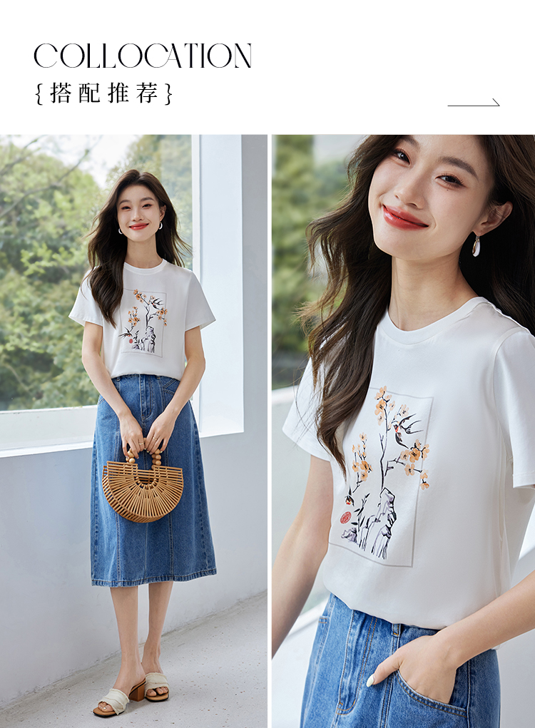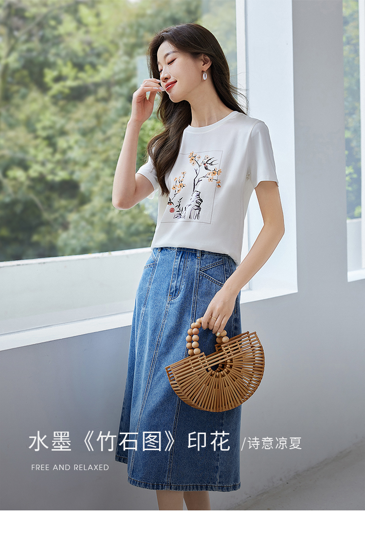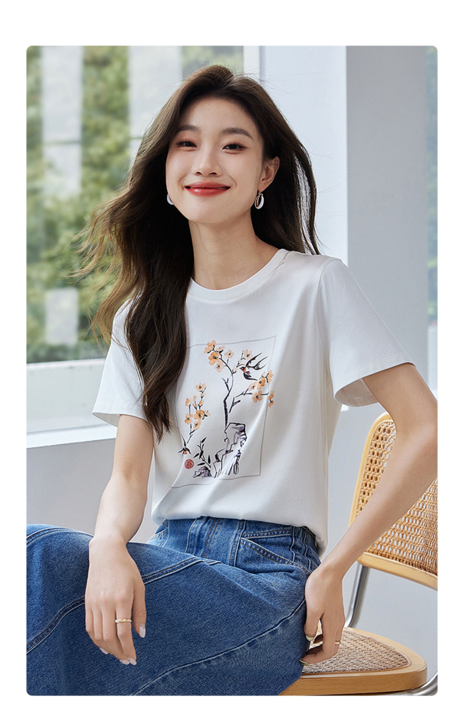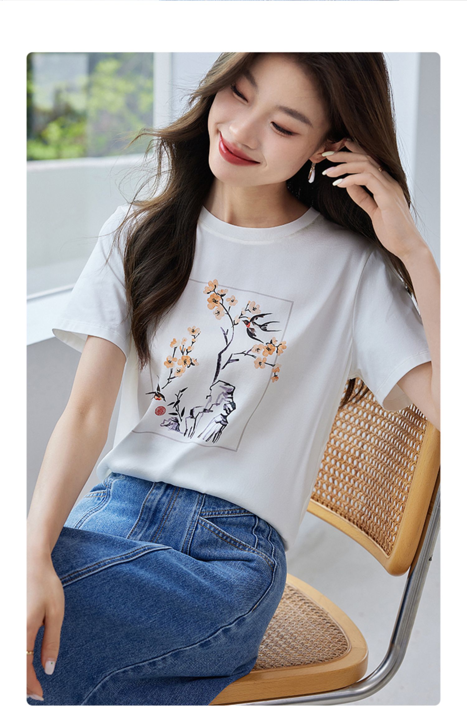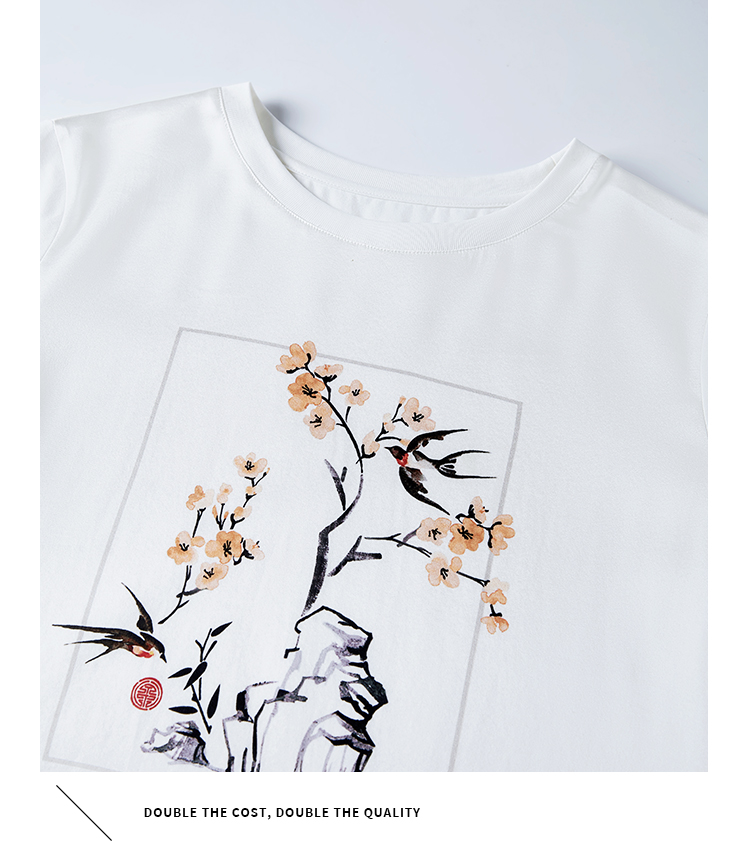 【专属特价】熙世界6A双宫桑蚕丝短袖T恤夏季新款宽松显瘦国风印花真丝上衣