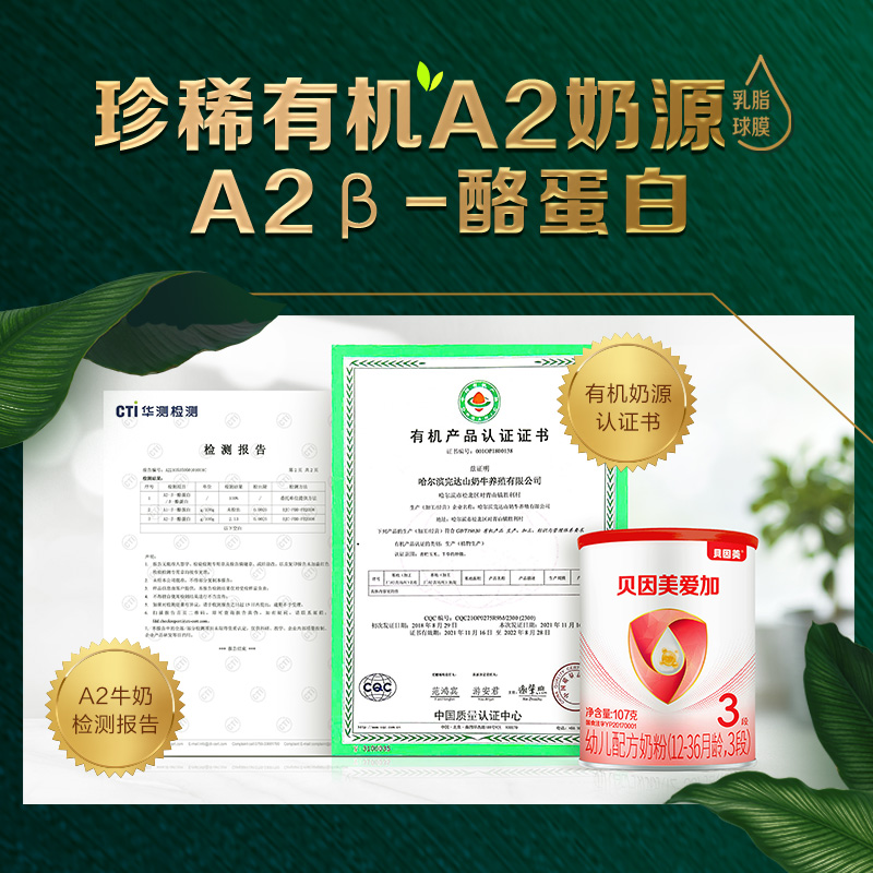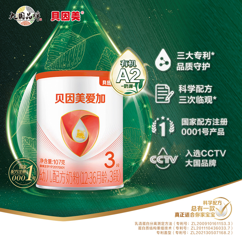 【新人29.9元任选3件】限购1件,贝因美爱加有机A2 婴幼儿配方奶粉107克
