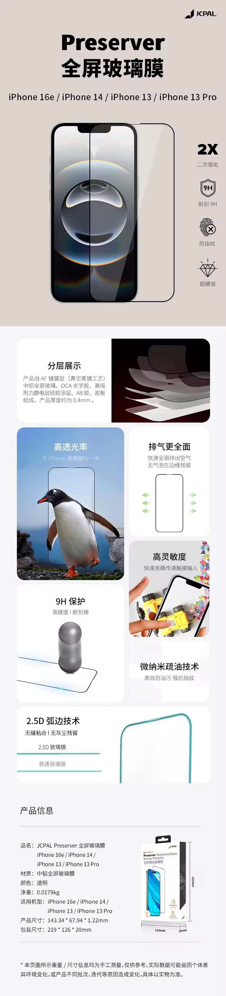 JCPal Preserver iPhone 16e 全屏玻璃膜透明