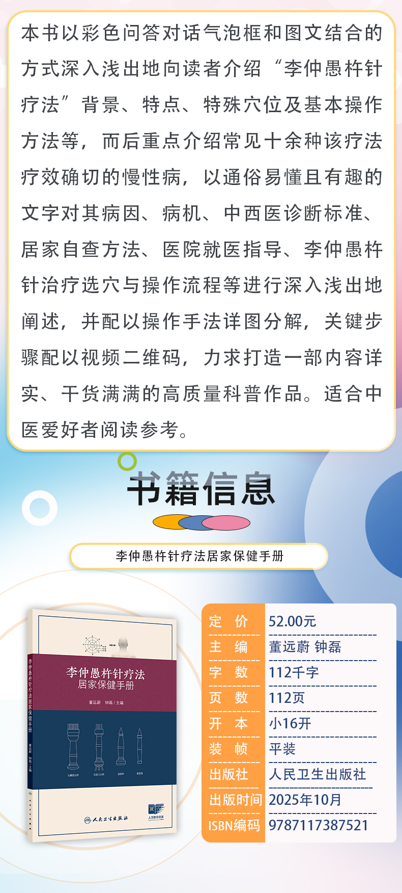 本书以彩色问答对话气泡框和图文结合的方式深入浅出地向读者介绍“李仲愚杵针疗法”背景、特点、特殊穴位及基本操作方法等,而后重点介绍常见十余种该疗法疗效确切的慢性病,以通俗易懂且有趣的文字对其病因、病机、中西医诊断标准、居家自查方法、医院就医指导、李仲愚杵针治疗选穴与操作流程等进行深入浅出地阐述,并配以操作手法详图分解,关键步骤配以视频二维码,力求打造一部内容详实、干货满满的高质量科普作品。适合中医爱好者阅读参考。